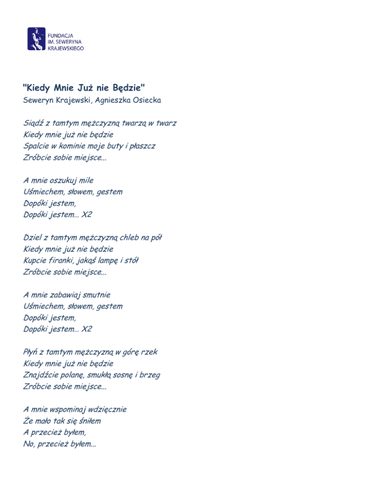 "Kiedy Mnie Już nie Będzie" Seweryn Krajewski, Agnieszka Osiecka Siądź z tamtym mężczyzną twarzą w twarz Kiedy mnie już nie będzie Spalcie w kominie moje buty i płaszcz Zróbcie sobie miejsce... A mnie oszukuj mile Uśmiechem, słowem, gestem Dopóki jestem, Dopóki jestem… X2 Dziel z tamtym mężczyzną chleb na pół Kiedy mnie już nie będzie Kupcie firanki, jakąś lampę i stół Zróbcie sobie miejsce... A mnie zabawiaj smutnie Uśmiechem, słowem, gestem Dopóki jestem, Dopóki jestem… X2 Płyń z tamtym mężczyzną w górę rzek Kiedy mnie już nie będzie Znajdźcie polanę, smukłą sosnę i brzeg Zróbcie sobie miejsce... A mnie wspominaj wdzięcznie Że mało tak się śniłem A przecież byłem, No, przecież byłem... A mnie oszukuj mile Uśmiechem, słowem, gestem Dopóki jestem, Dopóki jestem… A mnie bezczelnie kochaj Choć smutne śpiewki przędę Bo przecież będę, Bo przecież będę…