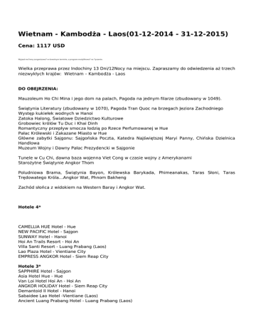 Wietnam - Kambodża - Laos(01-12-2014 - 31-12-2015) Cena: 1117 USD Wyjazd mo?emy zorganizowa? w dowolnym terminie, a program modyfikowa? na ?yczenie. Wielka przeprawa przez Indochiny 13 Dni/12Nocy na miejscu. Zapraszamy do odwiedzenia aż trzech niezwykłych krajów: Wietnam – Kambodża - Laos DO OBEJRZENIA: Mauzoleum Ho Chi Mina i jego dom na palach, Pagoda na jednym filarze (zbudowany w 1049). Świątynia Literatury (zbudowany w 1070), Pagoda Tran Quoc na brzegach Jeziora Zachodniego Występ kukiełek wodnych w Hanoi Zatoka Halong, Światowe Dziedzictwo Kulturowe Grobowiec królów Tu Duc i Khai Dinh Romantyczny przepływ smocza łodzią po Rzece Perfumowanej w Hue Pałac Królewski i Zakazane Miasto w Hue Główne zabytki Sajgonu: Sajgońska Poczta, Katedra Najświętszej Maryi Panny, Chińska Dzielnica Handlowa Muzeum Wojny i Dawny Pałac Prezydencki w Sajgonie Tunele w Cu Chi, dawna baza wojenna Viet Cong w czasie wojny z Amerykanami Starożytne Świątynie Angkor Thom Poludniowa Brama, Świątynia Bayon, Królewska Barykada, Phimeanakas, Taras Słoni, Taras Trędowatego Króla…Angkor Wat, Phnom Bakheng Zachód słońca z widokiem na Western Baray i Angkor Wat. Hotele 4* CAMELLIA HUE Hotel - Hue NEW PACIFIC Hotel - Sajgon SUNWAY Hotel - Hanoi Hoi An Trails Resort - Hoi An Villa Santi Resort - Luang Prabang (Laos) Lao Plaza Hotel - Vientiane City EMPRESS ANGKOR Hotel - Siem Reap City Hotele 3* SAPPHIRE Hotel - Sajgon Asia Hotel Hue - Hue Van Loi Hotel Hoi An - Hoi An ANGKOR HOLIDAY Hotel - Siem Reap City Demantoid II Hotel - Hanoi Sabaidee Lao Hotel -Vientiane (Laos) Ancient Luang Prabang Hotel - Luang Prabang (Laos) Dzień 1: Spotkanie z przewodnikiem po wylądowaniu na lotnisku Noi Bai. Transfer i wpis do hotelu w Hanoi. Hanoi jest stolicą Wietnamu, położona przy Delcie Rzeki Czerwonej, otoczona klimatem tropikalno – monsunowym. Swoją historią sięga blisko 1000 lat, którą rozpoznać można przez charakterystyczny orientalny styl bycia, francuską kolonijną architekturę, parkowe alejki oraz mnóstwem pięknych jezior w okolicy. Nocleg w hotelu w Hanoi (Posiłki: Nie) Dzień 2: Po śniadaniu zaczyna się całodzienna wycieczka po Hanoi. W programie: wizyta do Mauzoleum Ho Chi Mina: “Ojca Modernistycznego Wietnamu”, Pagoda „na jednym filarze”, Świątynia Literatury, Muzeum Etnografii, Muzeum Sztuk Pięknych…Po sutym obiedzie w restauracji będzie jednogodzinna przejażdżka rikszą po Starym Mieście Hanoi. Po południu: do obejrzenia niepowtarzalny występ w Teatrze Kukiełek Wodnych, charakterystyczny element Wietnamskiej sztuki. Kolacja i nocleg w hotelu w Hanoi (Posiłki: S) Dzień 3: Dzisiejszy ranek zaczyna się od 160 km przejażdżki samochodem do Zatoki Halong. Po drodze mijamy Deltę Rzeki Czerwonej, druga co do wielkości delta w Wietnamie. Krótka przerwa na kawę w malej miejscowości Sao Do, która słynie z ręcznie wykonanych produktów jak: tkane szale, obrusy i lakierowane drewno. Przyjazd do portu Halong w samo południe, wejście na drewniany, klasycznie zaprojektowany statek. W programie: 4 godzinna wyprawa ze spektakularnym widokiem na Zatokę Halong, zwiedzanie jaskiń i grot na zatoce, zwiedzanie wioski rybackiej, obiad i kolacja ze świeżymi owocami morza. Nocleg na statku. (Posiłki: S, O, K) Dzień 4: Wczesnym rankiem, podziwianie wschodu słońca na zatoce, odkrywcza wyprawa do zatoki Bai Tu Long z szansa na zrobienie pięknych zdjęć. Pożegnalny obiad, powrót do portu w Halong. Transfer na dworzec kolejowy w Hanoi. Nocleg w pociągu do Hue. (Posiłki: S, O) Dzień 5: Po przyjeździe na dworzec kolejowy, spotkanie z przewodnikiem i zakwaterowanie w hotelu w Hue. Następnie wyruszymy na przejażdżkę smocza łodzią po trójkącie Rzeki Perfumowanej, spływ w dól rzeki na wizytę do Pagody Pani Niebios – najlepiej zachowanego zabytku religijnego w Hue, dalsza przejażdżka samochodem na zwiedzanie Pałacu Królewskiego – 143 - letniej rezydencji dynastii Nguyen. Po obiedzie w lokalnej restauracji zwiedzimy dwa wykwintnie zaprojektowane Mauzolea: Króla Tu Duc i Khai Dinh. Następnie dwugodzinna podróż do Hoi An. Po drodze mijamy małą wioskę rybacka w Lang Co, przejeżdżamy przez przełęcz Hai Van (przełęcz w obłokach), ze szczytu podziwiamy spektakularny widok na panoramę brzegu morza centralnego. Przyjazd do Hoi An późnym popołudniem,zakwaterowanie w hotelu w Hoi An. Kolacja i nocleg w Hoi An. (Posiłki: S) Dzień 6: Po śniadaniu: eskortowana wycieczka do ruin w My Son, 60 km od Hoi An. My Son jest kompleksem ruin, pozostałością po starożytnej stolicy Champa, która swoja datą sięga VII n.e. Zabytek został odkryty przez francuskich kolonistów w 1885 roku. Kompleks Ruin w My Son został zarejestrowany przez UNESCO jako Światowe Dziedzictwo Kulturowe w 1999 roku. Powrót do Hoi An na obiad w lokalnej restauracji. Po południu – zwiedzanie Starego Miasta, domu kupców, chińskiej świątyni, 400-letniej pagody – mostu nad rzeką i barwnego targu w Hoi An. Kolacja i nocleg w Hoi An. (Posiłki: S) Dzień 7: Po śniadaniu, transfer do Danang i przelot do Sajgonu. Po wylądowaniu transfer i zakwaterowanie w hotelu. Po obiedzie kontynuujemy wycieczkę do Sajgońskiej Poczty, Katedry Najświętszej Maryi Panny, Dawnego Pałacu Prezydenckiego, Muzeum Pozostałości po Wietnamskiej Wojnie oraz Chińskiej Handlowej Dzielnicy w centrum. Nocleg w Sajgonie. (Posiłki: S) Dzień 8: Po śniadaniu zaczyna się wyprawa do Tunelu Cu Chi. Na miejscu zwiedzimy bazę wojenną o długości 250 km, zbudowaną przez armię Viet Congu w 1965 roku. Podziemny system kanałów przecina rzekę Sajgon i jest nazwany także Żelaznym Trójkątem Wietnamu. Tunele Cu Chi grały bardzo ważną rolę w czasie wojny z Amerykanami. Poprzez ten skomplikowany system podziemnych korytarzy, armie Viet Cong mogły kontrolować ogromny obszar wsi, znajdującej się od 30 do 40 km od Sajgonu. Tunele biorą swój początek od Sajgonu, koń
