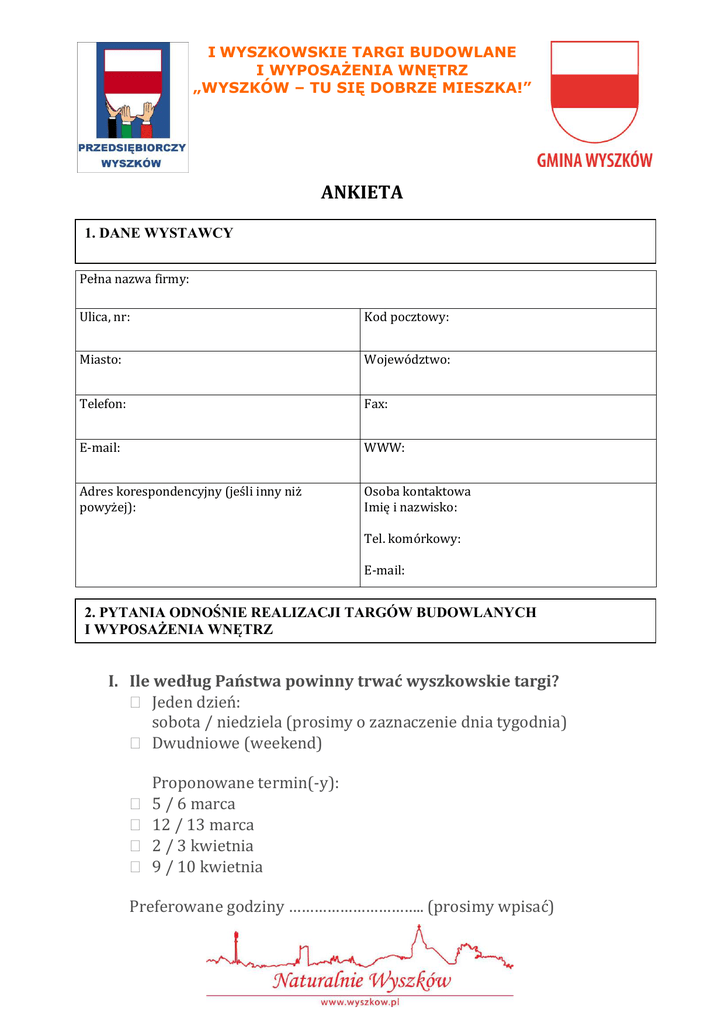 I WYSZKOWSKIE TARGI BUDOWLANE I WYPOSAŻENIA WNĘTRZ „WYSZKÓW – TU SIĘ DOBRZE MIESZKA!” ANKIETA 1. DANE WYSTAWCY Pełna nazwa firmy: Ulica, nr: Kod pocztowy: Miasto: Województwo: Telefon: Fax: E-mail: WWW: Adres korespondencyjny (jeśli inny niż powyżej): Osoba kontaktowa Imię i nazwisko: Tel. komórkowy: E-mail: 2. PYTANIA ODNOŚNIE REALIZACJI TARGÓW BUDOWLANYCH I WYPOSAŻENIA WNĘTRZ I. Ile według Państwa powinny trwać wyszkowskie targi? Jeden dzień: sobota / niedziela (prosimy o zaznaczenie dnia tygodnia) Dwudniowe (weekend) Proponowane termin(-y): 5 / 6 marca 12 / 13 marca 2 / 3 kwietnia 9 / 10 kwietnia Preferowane godziny ………………………….. (prosimy wpisać) I WYSZKOWSKIE TARGI BUDOWLANE I WYPOSAŻENIA WNĘTRZ „WYSZKÓW – TU SIĘ DOBRZE MIESZKA!” II. Jakie atrakcje powinny towarzyszyć targom? (można zaznaczyć więcej niż jedną) Strefa gastronomiczna Strefa dla dzieci (gry, zabawy, malowanie twarzy, dmuchańce) Koncert muzyczny inne (jakie?)…………………………………………………………………………… III. Jakie są Państwa cele uczestnictwa w targach? (można zaznaczyć maksymalnie 3 cele) Zademonstrowanie obecności firmy na rynku Bezpośrednie kontakty z klientami i pozyskanie zamówień Nawiązanie nowych kontaktów biznesowych Rozwój relacji z dotychczasowymi klientami Zebranie informacji o branży i konkurencji / badanie rynku Prezentacja nowych produktów Doskonalenie wizerunku firmy Wzrost świadomości marki Realizacja strategii rozwoju firmy inne (jakie?)………………………………………………………………………………… IV. Prosimy wybrać i zaznaczyć działania marketingowe, które będą Państwo realizować na stoisku. (można zaznaczyć maksymalnie 3 działania) Wyeksponowanie logo Prezentacja informacji o działalności firmy Organizacja konferencji-seminarium branżowego Prezentacja wystawionych produktów i ich zastosowania Prezentacja nowości rynkowych Udostępnianie na stoisku materiałów informacyjno-promocyjnych Prowadzenie rozmów z klientami i wymiana kontaktów Organizacja na stoisku szkolenia dla personelu Organizacja wydarzenia marketingowego (eventu) atrakcyjnego dla zwiedzających targi inne (jakie?)…………………………………………………………………………………… I WYSZKOWSKIE TARGI BUDOWLANE I WYPOSAŻENIA WNĘTRZ „WYSZKÓW – TU SIĘ DOBRZE MIESZKA!” V. Czy są Państwo skłonni pokryć koszt wynajęcia boxów, zrobienia jednakowej wielkości banerów (zadbanie o estetykę hali targowej)? Tak maksymalna kwota ………………… PLN Nie, chcielibyśmy wystawić się bezpłatnie z własnym wyposażeniem, korzystając z krzesełek i stolików WOSiR Uwagi …………………………………………………………………………………………….. VI. Czy zechcą Państwo wykupić powierzchnię reklamową w katalogu targowym, który będzie rozdawany podczas imprezy? Tak maksymalna kwota ………………… PLN Nie VII. Propozycje / uwagi Ankietę prosimy przesłać na adres e-mail [email protected] lub dostarczyć osobiście do Wydziału Promocji, Kultury i Sportu pok. 115 najpóźniej do dnia 31 sierpnia 2015. Sprawę prowadzi: Edyta Wittich, tel. (29) 743-77-13