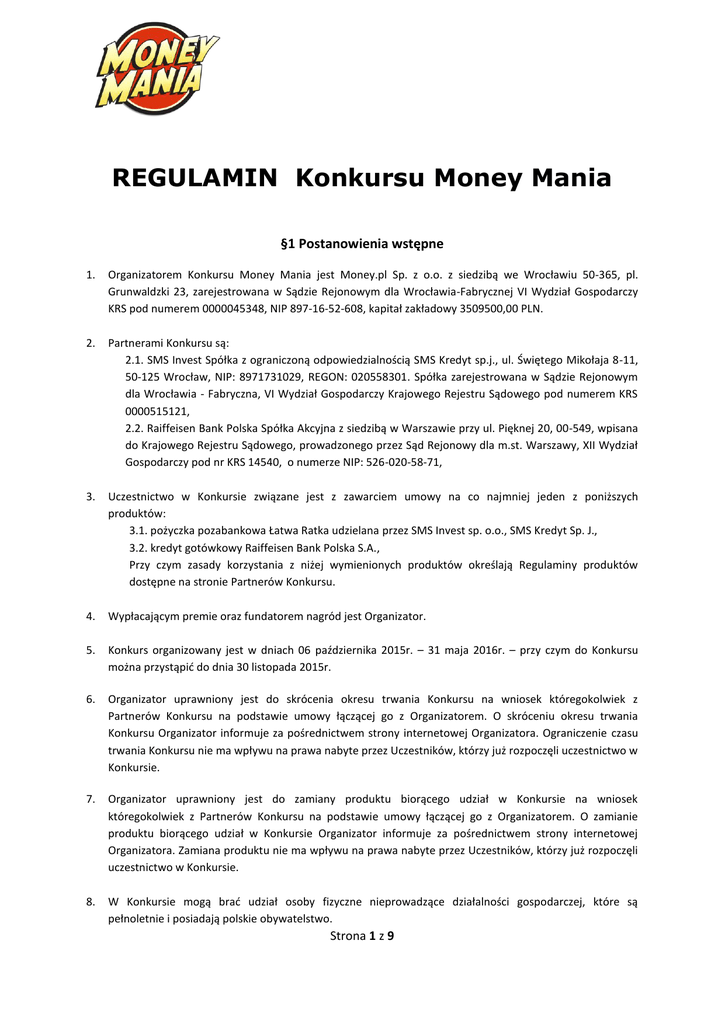 1. Organizator - Money.pl Sp. z o.o. z siedzibą we Wrocławiu 50-365, pl. Grunwaldzki 23, zarejestrowana