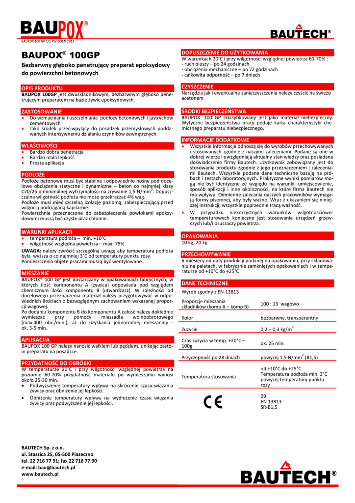 BAUPOX 100 GP 1/1 KWIECIEŃ 2012 BAUPOX® 100GP DOPUSZCZENIE DO UŻYTKOWANIA Bezbarwny głęboko penetrujący preparat epoksydowy do powierzchni betonowych W warunkach 20˚C i przy wilgotności względnej powietrza 60‐70% : ‐ ruch pieszy – po 24 godzinach ‐ obciążenia mechaniczne – po 72 godzinach ‐ całkowita odporność – po 7 dniach OPIS PRODUKTU CZYSZCZENIE BAUPOX 100GP jest dwuskładnikowym, bezbarwnym głęboko pene‐ trującym preparatem na bazie żywic epoksydowych. Narzędzia jak i ewentualne zanieczyszczenia należy czyścić na świeżo acetonem ZASTOSOWANIE ŚRODKI BEZPIECZEŃSTWA Do wzmacniania i uszczelniania podłoży betonowych i jastrychów cementowych Jako środek przeciwpylący do posadzek przemysłowych podda‐ wanych intensywnemu działaniu czynników zewnętrznych WŁAŚCIWOŚCI BAUPOX® 100 GP sklasyfikowany jest jako materiał niebezpieczny. Wytyczne bezpieczeństwa pracy podaje karta charakterystyki che‐ micznego preparatu niebezpiecznego. INFORMACJE DODATKOWE Bardzo dobra penetracja Bardzo mała lepkość Prosta aplikacja PODŁOŻE Podłoże betonowe musi być stabilne i odpowiednio nośne pod doce‐ lowe obciążenia statyczne i dynamiczne – beton co najmniej klasy C20/25 o minimalnej wytrzymałości na zrywanie 1,5 N/mm2. Dopusz‐ czalna wilgotność podłoża nie może przekraczać 4% wag. Podłoże musi mieć szczelną izolację poziomą, zabezpieczającą przed wilgocią podciąganą kapilarnie. Powierzchnie przeznaczone do zabezpieczenia powłokami epoksy‐ dowymi muszą być czyste oraz chłonne. WARUNKI APLIKACJI temperatura podłoża – min. +10˚C wilgotność względna powietrza – max. 75% UWAGA: należy zwrócić szczególną uwagę aby temperatura podłoża była wyższa o co najmniej 3˚C od temperatury punktu rosy. Pomieszczenia objęte pracami muszą być wentylowane. MIESZANIE Wszystkie informacje odnoszą się do wyrobów przechowywanych i stosowanych zgodnie z naszymi zaleceniami. Podane są one w dobrej wierze i uwzględniają aktualny stan wiedzy oraz posiadane doświadczenie firmy Bautech. Użytkownik zobowiązany jest do stosowania produktu zgodnie z jego przeznaczeniem i zalecenia‐ mi Bautech. Wszystkie podane dane techniczne bazują na pró‐ bach i testach laboratoryjnych. Praktyczne wyniki pomiarów mo‐ gą nie być identyczne ze względu na warunki, umiejscowienie, sposób aplikacji i inne okoliczności, na które firma Bautech nie ma wpływu. Odmienne zalecania naszych pracowników wymaga‐ ją formy pisemnej, aby były ważne. Wraz z ukazaniem się niniej‐ szej instrukcji, wszystkie poprzednie tracą ważność. W przypadku niekorzystnych warunków wilgotnościowo‐ temperaturowych konieczne jest stosowanie urządzeń grzew‐ czych lub/i osuszaczy powietrza. OPAKOWANIA 10 kg, 20 kg PRZECHOWYWANIE 6 miesięcy od daty produkcji podanej na opakowaniu, przy składowa‐ niu na paletach, w fabrycznie zamkniętych opakowaniach i w tempe‐ raturze od +10°C do +25°C BAUPOX® 100 GP jest dostarczany w opakowaniach fabrycznych, w których ilość komponentu A (żywica) odpowiada pod względem DANE TECHNICZNE chemicznym ilości komponentu B (utwardzacz). W zależności od Wyrób zgodny z EN‐13813 docelowego przeznaczenia materiał należy przygotowywać w odpo‐ wiednich ilościach z bezwzględnym zachowaniem wskazanej propor‐ Proporcje mieszania cji wagowej. składników (komp A – komp B) Po dodaniu komponentu B do komponentu A całość należy dokładnie wymieszać przy pomocy mieszadła wolnoobrotowego Kolor (max.400 obr./min.), aż do uzyskania jednorodnej mieszaniny ‐ ok. 3‐5 min. Zużycie APLIKACJIA Czas zużycia w temp. +20°C – BAUPOX 100 GP należy nanosić wałkiem lub pędzlem, unikając zasto‐ 100g in preparatu na posadzce. Przyczepność po 28 dniach PRZYDATNOŚĆ DO OBRÓBKI W temperaturze 20˚C i przy wilgotności względnej powietrza na poziomie 60‐70% przydatność materiału po wymieszaniu wynosi około 25‐30 min. Podwyższenie temperatury wpływa na skrócenie czasu wiązania żywicy oraz obniżenie jej lepkości. Obniżenie temperatury wpływa na wydłużenie czasu wiązania żywicy oraz podwyższenie jej lepkości. BAUTECH Sp. z o.o. ul. Staszica 25, 05‐500 Piaseczno tel. 22 716 77 91; fax 22 716 77 90 e‐mail: [email protected] www.bautech.pl Temperatura stosowania 100 : 13 wagowo bezbarwny, transparentny 0,2 – 0,3 kg/m2 ok. 25 min. powyżej 1,5 N/mm2 (B1,5) od +10°C do +25°C Temperatura podłoża min. 3°C powyżej temperatury punktu rosy 09 EN 13813 SR‐B1,5