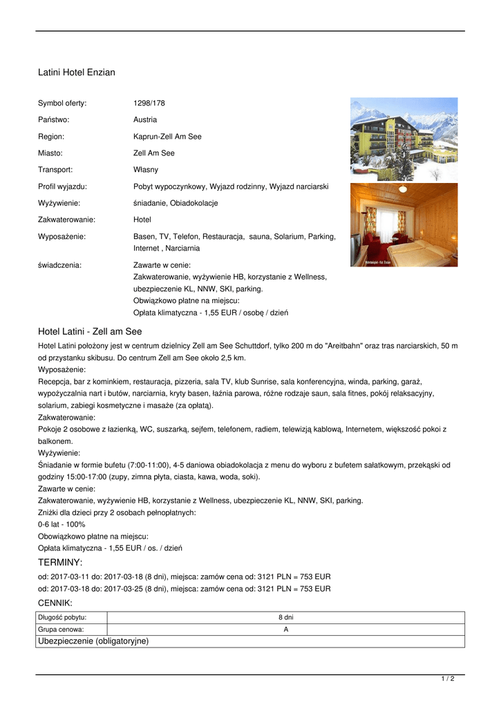 Latini Hotel Enzian Symbol oferty: 1298/178 Państwo: Austria Region: Kaprun-Zell Am See Miasto: Zell Am See Transport: Własny Profil wyjazdu: Pobyt wypoczynkowy, Wyjazd rodzinny, Wyjazd narciarski Wyżywienie: śniadanie, Obiadokolacje Zakwaterowanie: Hotel Wyposażenie: Basen, TV, Telefon, Restauracja, sauna, Solarium, Parking, świadczenia: Zawarte w cenie: Internet , Narciarnia Zakwaterowanie, wyżywienie HB, korzystanie z Wellness, ubezpieczenie KL, NNW, SKI, parking. Obwiązkowo płatne na miejscu: Opłata klimatyczna - 1,55 EUR / osobę / dzień Hotel Latini - Zell am See Hotel Latini położony jest w centrum dzielnicy Zell am See Schuttdorf, tylko 200 m do "Areitbahn" oraz tras narciarskich, 50 m od przystanku skibusu. Do centrum Zell am See około 2,5 km. Wyposażenie: Recepcja, bar z kominkiem, restauracja, pizzeria, sala TV, klub Sunrise, sala konferencyjna, winda, parking, garaż, wypożyczalnia nart i butów, narciarnia, kryty basen, łaźnia parowa, różne rodzaje saun, sala fitnes, pokój relaksacyjny, solarium, zabiegi kosmetyczne i masaże (za opłatą). Zakwaterowanie: Pokoje 2 osobowe z łazienką, WC, suszarką, sejfem, telefonem, radiem, telewizją kablową, Internetem, większość pokoi z balkonem. Wyżywienie: Śniadanie w formie bufetu (7:00-11:00), 4-5 daniowa obiadokolacja z menu do wyboru z bufetem sałatkowym, przekąski od godziny 15:00-17:00 (zupy, zimna płyta, ciasta, kawa, woda, soki). Zawarte w cenie: Zakwaterowanie, wyżywienie HB, korzystanie z Wellness, ubezpieczenie KL, NNW, SKI, parking. Zniżki dla dzieci przy 2 osobach pełnopłatnych: 0-6 lat - 100% Obowiązkowo płatne na miejscu: Opłata klimatyczna - 1,55 EUR / os. / dzień TERMINY: od: 2017-03-11 do: 2017-03-18 (8 dni), miejsca: zamów cena od: 3121 PLN = 753 EUR od: 2017-03-18 do: 2017-03-25 (8 dni), miejsca: zamów cena od: 3121 PLN = 753 EUR CENNIK: Długość pobytu: 8 dni Grupa cenowa: A Ubezpieczenie (obligatoryjne) 1/2 (*) Ubezpieczenie KL, NW, SKI 14 (*) Turystyczny Fundusz Gwarancyjny Pobyt w obiekcie (do wyboru) 2.5 (*) Pokój 2-4 os. Enzian standardowo dla osób: 4 minimalnie: 2 Rodzaj osoby (do wyboru) Dziecko 7-11 Dziecko 0-6 (*) Osoba dorosła Rodzaj osoby (opcjonalny) 3 osoba dorosła na dostawce (-) 280 (-) 739 420 Waluta: EUR Aktualne ceny z systemu S.A.R.T. (-) - cena usługi, podatku kalkulowana przy osobie lub gratis (*) - kwota wliczona w cenę standardową 2/2