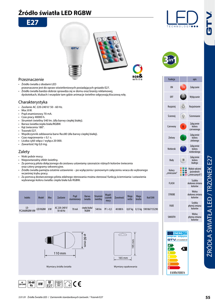 ŹRÓDŁA ŚWIATŁA LED / TRZONEK E27 Źródło światła LED RGBW
