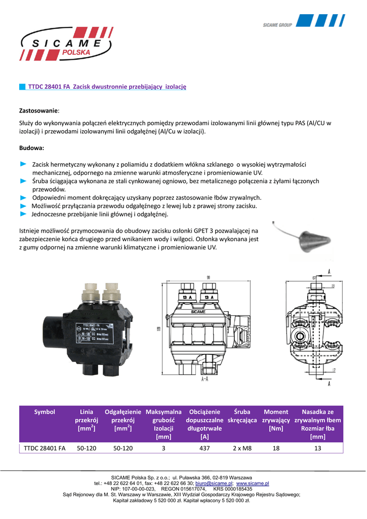 TTDC 28401 FA Zacisk dwustronnie przebijający izolację Zastosowanie: Służy do wykonywania połączeń elektrycznych pomiędzy przewodami izolowanymi linii głównej typu PAS (Al/CU w izolacji) i przewodami izolowanymi linii odgałęźnej (Al/Cu w izolacji). Budowa: Zacisk hermetyczny wykonany z poliamidu z dodatkiem włókna szklanego o wysokiej wytrzymałości mechanicznej, odpornego na zmienne warunki atmosferyczne i promieniowanie UV. Śruba ściągająca wykonana ze stali cynkowanej ogniowo, bez metalicznego połączenia z żyłami łączonych przewodów. Odpowiedni moment dokręcający uzyskany poprzez zastosowanie łbów zrywalnych. Możliwość przyłączania przewodu odgałęźnego z lewej lub z prawej strony zacisku. Jednoczesne przebijanie linii głównej i odgałęźnej. Istnieje możliwość przymocowania do obudowy zacisku osłonki GPET 3 pozwalającej na zabezpieczenie końca drugiego przed wnikaniem wody i wilgoci. Osłonka wykonana jest z gumy odpornej na zmienne warunki klimatyczne i promieniowanie UV. Symbol Linia Odgałęzienie Maksymalna Obciążenie Śruba Moment Nasadka ze przekrój przekrój grubość dopuszczalne skręcająca zrywający zrywalnym łbem [mm2] [mm2] Izolacji długotrwałe [Nm] Rozmiar łba [mm] [A] [mm] TTDC 28401 FA FA 50-120 50-120 3 437 2 x M8 18 SICAME Polska Sp. z o.o.; ul. Puławska 366, 02-819 Warszawa tel.: +48 22 622 64 01, fax: +48 22 622 66 30; [email protected]; www.sicame.pl NIP: 107-00-00-023, REGON 015617074, KRS 0000185435 Sąd Rejonowy dla M. St. Warszawy w Warszawie, XIII Wydział Gospodarczy Krajowego Rejestru Sądowego; Kapitał zakładowy 5 520 000 zł. Kapitał wpłacony 5 520 000 zł. 13