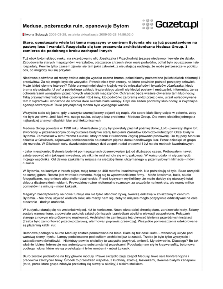 Medusa, pożeraczka ruin, opanowuje Bytom Iwona Sobczyk 2009-03-28, ostatnia aktualizacja 2009-03-28 14:56:02.0 Stare, opustoszałe wiele lat temu magazyny w centrum Bytomia nie są już pozostawione na pastwę losu i wandali. Rozgościła się tam pracownia architektoniczna Medusa Group. I zamierza do podobnego kroku zachęcać innych Tuż obok bytomskiego rynku, na skrzyżowaniu ulic Józefczaka i Przechodniej jeszcze niedawno niewiele się działo. Zabudowania starych magazynów i warsztatów, otaczające z trzech stron małe podwórko, od lat były opuszczone i się rozpadały. Pewnie tylko czasem zjawiał się tam jakiś człowiek, z nieustającą nadzieją, że może jest jeszcze w pobliżu coś, co mogłoby mu się przydać. Niedawno podwórko od reszty świata odcięła wysoka czarna brama, połać blachy pozbawiona jakichkolwiek dekoracji i prześwitów. Za nią mogło kryć się wszystko. Pewnie nic z tych rzeczy, na które powinien patrzeć porządny człowiek. Może jakieś ciemne interesy? Takie przynajmniej słuchy krążyły wśród mieszkańców i bywalców Józefczaka, kiedy brama się pojawiła. U pań z pobliskiego zakładu fryzjerskiego zjawili się kiedyś postawni mężczyźni, informując, że są ochroniarzami wynajętymi przez nowych właścicieli magazynów. Ochraniać będą właśnie otwierany tam klub nocny. Taką przynajmniej historię ktoś opowiadał. Ktoś inny, kto podwórko za bramą widzi przez okno, ujrzał wyładowywane tam z ciężarówki i wnoszone do środka dwie okazałe białe kanapy. Czyli nie żaden poczciwy klub nocny, a zwyczajna agencja towarzyska! Takie przynajmniej można było wyciągnąć wnioski. Wszystko stało się jasne, gdy u szczytu czarnej bramy pojawił się napis. Ale spore białe litery ucięto w połowie, żeby nie było za łatwo. Jeśli ktoś wie, czego szuka, odczyta bez problemu - Medusa Group. Oto nowa siedziba jednego z najbardziej znanych śląskich biur architektonicznych. Medusa Group powstała w 1998 roku. Manifestem grupy był powstały pięć lat później Bolko_Loft - pierwszy śląski loft, stworzony w przeznaczonym do wyburzenia budynku starej lampiarni Zakładów Górniczo-Hutniczych Orzeł Biały w Bytomiu. Zamieszkał w nim Przemo Łukasik, który razem z Łukaszem Zagałą prowadzi pracownię. Do tej pory Medusa działała w Gliwicach, zajmowała pomieszczenia na ostatnim piętrze domu handlowego Ikar. Przez dziesięć lat grupa się rozrosła. W Gliwicach cały, dwudziestoosobowy dziś zespół, nadal pracował i żył na stu metrach kwadratowych. - Jako mieszkaniec Bytomia budynki po magazynach obserwowałem już od dłuższego czasu. Próbowałem nawet zainteresować nimi jakiegoś inwestora, ale nikt nie miał ochoty się w to pakować. W końcu udało mi się zachęcić mojego wspólnika. Od dawna szukaliśmy miejsca na siedzibę firmy, utrzymanego w przemysłowym klimacie - mówi Łukasik. W Bytomiu, na każdym z trzech pięter, mają teraz po 400 metrów kwadratowych. Nie potrzebują aż tyle. Biuro urządzili na samej górze. Reszta jest w trakcie remontu. Mają się tu wprowadzić inne firmy. - Może kawiarnia, butik, studio fotograficzne, nagraniowe albo atelier dizajnerskie. Przed kryzysem myśleliśmy, że może dałoby się otworzyć tutaj sklep z dizajnerskimi meblami. Prowadzimy rożne nieformalne rozmowy, za wcześnie na konkrety, ale mamy milion pomysłów na minutę - mówi Łukasik. Magazyn zaadaptowany na nowe funkcje ma nie tylko stanowić żywą, twórczą enklawę w zniszczonym centrum Bytomia. - Nie chcę używać wielkich słów, ale marzy nam się, żeby to miejsce mogło pozytywnie oddziaływać na całe otoczenie - dodaje architekt. W budynku starają się nie zmieniać więcej, niż to konieczne. Nowe okna dalej chronią stare, zardzewiałe kraty. Ściany zostały wzmocnione, a powstałe wskutek szkód górniczych i zaniedbań ubytki w elewacji uzupełnione. Połączeń starego z nowym nie próbowano maskować. Architekci nie zamierzają też ukrywać istnienia przeróżnych instalacji (trzeba było zamontować przeciwpożarową, alarmową i poprawić grzewczą). Wszystkie pomieszczenia udekorowane są plątaniną kabli i rur. Betonowa podłoga w biurze Medusy została pomalowana na biało. Białe są też deski sufitu - wcześniej ukryte pod warstwą słomy i tynku. Lampy podwieszone pod sufitem architekci już tu zastali. Trzeba je było tylko wyczyścić i wstawić nowe świetlówki. - Niektórzy pewnie chcieliby to wszystko przykryć, zmienić. My odwrotnie. Dlaczego? Bo tak właśnie lubimy. Interesuje nas autentyczna substancja tej przestrzeni. Podobają nam się te krzywe sufity, betonowa podłoga i okna, które nie są prostokątami tylko rombami - mówi Łukasik. Biuro zostało podzielone na trzy główne moduły. Prawe skrzydło zajął zespół Medusy, lewe sala konferencyjna i pracownia założycieli firmy. Środek to przestrzeń wspólna, z kuchnią, szatnią, łazienkami, dwiema białymi kanapami (to te, przez które grupa zdobyła przelotną złą sławę w okolicy) i niskim stolikiem. Stolik pasuje tu świetnie, bo jest zrobiony z drewnianej magazynowej palety. To pamiątka po wystawie, w jakiej Medusa brała udział, obok takich sław jak Odile Decq i Peter Cook. Artyści zostali poproszeni wtedy o zaprezentowanie współczesnej wersji szałasu. - Obrabialiśmy temat przy użyciu takiej jednostki, jak europaleta. Wystawa miała krążyć po całej Europie, a taka paleta to parasymbol naszej wspólnoty. Można ją znaleźć w każdym dużym mieście i mieć pewność, że będzie miała dokładnie taki sam wymiar i kolor. Nie musieliśmy transportować naszej części wystawy. Wystarczyło w nowym miejscu kupić nowe palety, a potem poddać je recyklingowi, czyli sprzedać za tyle samo - mówi Łukasik. Najbardziej widoczna ingerencja nowych właścicieli w zastaną przestrzeń, to duże przeszklenie przy wejściu i czarne elementy wystroju wnętrza. Na wewnętrz