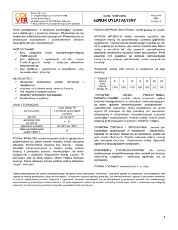 Colver Sp. z o.o. ul. Żeligowskiego 32/34, 90-643 Łódź Zakład produkcyjny: ul. Adamowicza 1, 05-530 Góra Kalwaria + 48 22 390 90 74, [email protected], www.colver.pl SZNUR DYLATACYJNY OPIS: polietylenowy, o strukturze zamkniętych komórek, sznur dylatacyjny o przekroju kołowym. Charakteryzuje się doskonałymi właściwościami izolacyjnymi. Przeznaczony do zastosowań budowlanych i przemysłowych zarówno wewnętrznych, jak i zewnętrznych. ZASTOSOWANIE: jako podparcie masy uszczelniająco-klejącej PURFLEX 20 jako dylatacja i wypełnienie szczelin, przerw konstrukcyjnych, nacięć i połączeń elementów betonowych itp. jako dylatacja i wypełnienie w posadzkach, przy montażu okien i drzwi itp. WŁAŚCIWOŚCI: doskonałe właściwości izolacji termicznej akustycznej odporny na działanie wody, deszczu i wiatru nie reaguje z brzegami spoiny neutralny chemicznie, bez zapachu bardzo łatwy w aplikacji i DANE TECHNICZNE: barwa i postać gęstość absorpcja wody wg ISO 62 odporność termiczna klasa ognioodporności wg EN 13501-1 Wydanie SZD25-02/16 Karta Techniczna szara pianka PE o strukturze zamkniętych komórek ok. 22 kg/m³ <1% od -30°C do +90°C E RODZAJ PODŁOŻA: prawie wszystkie podłoża spotykane w budownictwie np. beton, kamień, drewno, metal, tworzywa sztuczne. Powierzchnia powinna być mocna i czysta. Wszelkie zanieczyszczenia w postaci pyłów, śladów tłuszczu i zaolejenia, luźnych, niezwiązanych lub słabo związanych z podłożem fragmentów należy usunąć. W przypadku, gdy są ślady wilgoci, należy miejsce montażu osuszyć. Przed aplikacją sznura podłoże należy dokładnie odpylić i odkurzyć. PRZYGOTOWANIE MATERIAŁU: wyrób gotowy do użycia. SPOSÓB APLIKACJI: dobór rozmiaru szczeliny jest niezwykle istotny dla prawidłowego ustalenia głębokości wypełnienia. Rozmiar sznura dylatacyjnego musi być ok. 2530 % większy od szczeliny, aby ciasno wypełnić lukę. Sznur ułożyć w szczelinie tak, aby zapewnić zaprojektowaną głębokość wypełnienia szczeliny kitem dylatacyjnym. Profil powinien być osadzony za pomocą dedykowanego narzędzia aby uniknąć jakichkolwiek uszkodzeń podczas instalacji. Wydajność jednej rolki sznura w zależności od jego średnicy: średnica sznura [mm] ilość w nawoju [m] 6 8 10 15 20 25 30 2500 1500 1150 550 350 200 160 TRANSPORT, OKRES PRZYDATNOŚCI, MAGAZYNOWANIE: produkt należy przewozić krytymi środkami transportowymi w warunkach zabezpieczających go przed opadami atmosferycznymi, zawilgoceniem i uszkodzeniem opakowań. Okres przydatności do użycia wynosi 24 miesiące od daty produkcji pod warunkiem składowania w oryginalnych, nieuszkodzonych, szczelnie zamkniętych opakowaniach. Produkt należy chronić przed wilgocią, przechowywać w suchym i chłodnym miejscu. OCHRONA ZDROWIA I ŚRODOWISKA: produkt jest materiałem bezpiecznym w transporcie i składowaniu. Materiał nie powinien dostać się do kanalizacji, gruntu lub wód powierzchniowych. Resztki materiału należy usunąć jako tworzywo sztuczne. Opakowania należy utylizować zgodnie z obowiązującymi przepisami. DOKUMENTY FORMALNO-PRAWNE: dla sznura dylatacyjnego zakwalifikowanego jako produkt pomocniczy dokumenty, certyfikaty i deklaracja zgodności nie są wymagane. FORMA DOSTAWY: wielokrotność 1 m, rolka. Wyrób przeznaczony do użytku profesjonalnego. Wszelkie dane techniczne, informacje i zalecenia oparte na badaniach, doświadczeniu oraz najlepszej wiedzy producenta, który nie ma wpływu na warunki i sposób aplikacji produktu, jak również warunki i sposób użytkowania obiektów, w których zastosowano produkt. Nabywca i użytkownik produktu zobowiązani są do sprawdzenia przydatności produktu do zamierzonego zastosowania w konkretnych okolicznościach. W razie wątpliwości zaleca się kontakt z doradcą technicznym. Wraz z ukazaniem się niniejszej informacji technicznej tracą ważność wszystkie poprzednie karty techniczne. 1