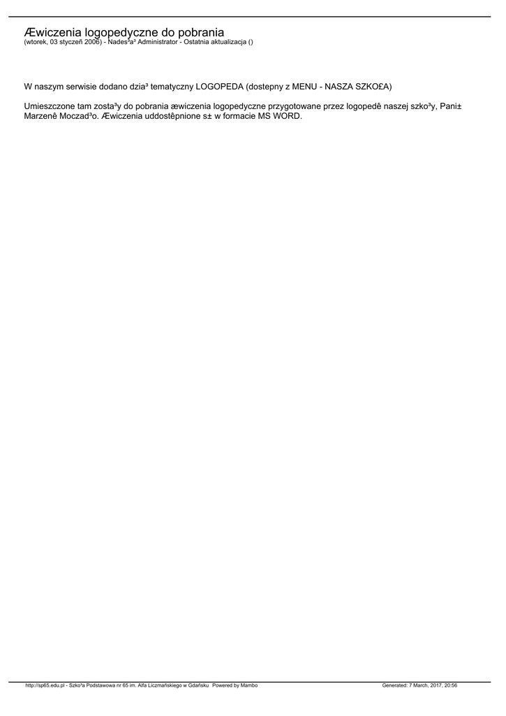 Æwiczenia logopedyczne do pobrania (wtorek, 03 styczeñ 2006) - Nades³a³ Administrator - Ostatnia aktualizacja () W naszym serwisie dodano dzia³ tematyczny LOGOPEDA (dostepny z MENU - NASZA SZKO£A) Umieszczone tam zosta³y do pobrania æwiczenia logopedyczne przygotowane przez logopedê naszej szko³y, Pani± Marzenê Moczad³o. Æwiczenia uddostêpnione s± w formacie MS WORD. http://sp65.edu.pl - Szko³a Podstawowa nr 65 im. Alfa Liczmañskiego w Gdañsku Powered by Mambo Generated: 7 March, 2017, 20:56