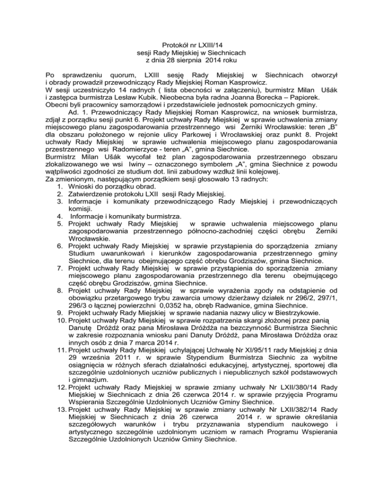 Protokół nr LXIII/14 sesji Rady Miejskiej w Siechnicach z dnia 28 sierpnia 2014 roku Po sprawdzeniu quorum, LXIII sesję Rady Miejskiej w Siechnicach otworzył i obrady prowadził przewodniczący Rady Miejskiej Roman Kasprowicz. W sesji uczestniczyło 14 radnych ( lista obecności w załączeniu), burmistrz Milan Ušák i zastępca burmistrza Lesław Kubik. Nieobecna była radna Joanna Borecka – Papiorek. Obecni byli pracownicy samorządowi i przedstawiciele jednostek pomocniczych gminy. Ad. 1. Przewodniczący Rady Miejskiej Roman Kasprowicz, na wniosek burmistrza, zdjął z porządku sesji punkt 6. Projekt uchwały Rady Miejskiej w sprawie uchwalenia zmiany miejscowego planu zagospodarowania przestrzennego wsi śerniki Wrocławskie: teren „B” dla obszaru połoŜonego w rejonie ulicy Parkowej i Wrocławskiej oraz punkt 8. Projekt uchwały Rady Miejskiej w sprawie uchwalenia miejscowego planu zagospodarowania przestrzennego wsi Radomierzyce - teren „A”, gmina Siechnice. Burmistrz Milan Ušák wycofał teŜ plan zagospodarowania przestrzennego obszaru zlokalizowanego we wsi Iwiny – oznaczonego symbolem „A”, gmina Siechnice z powodu wątpliwości zgodności ze studium dot. linii zabudowy wzdłuŜ linii kolejowej. Za zmienionym, następującym porządkiem sesji głosowało 13 radnych: 1. Wnioski do porządku obrad. 2. Zatwierdzenie protokołu LXII sesji Rady Miejskiej. 3. Informacje i komunikaty przewodniczącego Rady Miejskiej i przewodniczących komisji. 4. Informacje i komunikaty burmistrza. 5. Projekt uchwały Rady Miejskiej w sprawie uchwalenia miejscowego planu zagospodarowania przestrzennego północno-zachodniej części obrębu śerniki Wrocławskie. 6. Projekt uchwały Rady Miejskiej w sprawie przystąpienia do sporządzenia zmiany Studium uwarunkowań i kierunków zagospodarowania przestrzennego gminy Siechnice, dla terenu obejmującego część obrębu Grodziszów, gmina Siechnice. 7. Projekt uchwały Rady Miejskiej w sprawie przystąpienia do sporządzenia zmiany miejscowego planu zagospodarowania przestrzennego dla terenu obejmującego część obrębu Grodziszów, gmina Siechnice. 8. Projekt uchwały Rady Miejskiej w sprawie wyraŜenia zgody na odstąpienie od obowiązku przetargowego trybu zawarcia umowy dzierŜawy działek nr 296/2, 297/1, 296/3 o łącznej powierzchni 0,0352 ha, obręb Radwanice, gmina Siechnice. 9. Projekt uchwały Rady Miejskiej w sprawie nadania nazwy ulicy w Biestrzykowie. 10. Projekt uchwały Rady Miejskiej w sprawie rozpatrzenia skargi złoŜonej przez panią Danutę DróŜdŜ oraz pana Mirosława DróŜdŜa na bezczynność Burmistrza Siechnic w zakresie rozpoznania wniosku pani Danuty DróŜdŜ, pana Mirosława DróŜdŜa oraz innych osób z dnia 7 marca 2014 r. 11. Projekt uchwały Rady Miejskiej uchylającej Uchwałę Nr XI/95/11 rady Miejskiej z dnia 29 września 2011 r. w sprawie Stypendium Burmistrza Siechnic za wybitne osiągnięcia w róŜnych sferach działalności edukacyjnej, artystycznej, sportowej dla szczególnie uzdolnionych uczniów publicznych i niepublicznych szkół podstawowych i gimnazjum. 12. Projekt uchwały Rady Miejskiej w sprawie zmiany uchwały Nr LXII/380/14 Rady Miejskiej w Siechnicach z dnia 26 czerwca 2014 r. w sprawie przyjęcia Programu Wspierania Szczególnie Uzdolnionych Uczniów Gminy Siechnice. 13. Projekt uchwały Rady Miejskiej w sprawie zmiany uchwały Nr LXII/382/14 Rady Miejskiej w Siechnicach z dnia 26 czerwca 2014 r. w sprawie określania szczegółowych warunków i trybu przyznawania stypendium naukowego i artystycznego szczególnie uzdolnionym uczniom w ramach Programu Wspierania Szczególnie Uzdolnionych Uczniów Gminy Siechnice. 14. Projekt uchwały Rady Miejskiej w sprawie określenia szczegółowych zasad i trybu przyznawania i pozbawiania stypendiów sportowego szczególnie uzdolnionym uczniom w Gminie Siechnice. 15. Projekt uchwały Rady Miejskiej w sprawie ustalenia czasu bezpłatnego nauczania, wychowania i opieki oraz wysokości opłaty za korzystanie z wychowania przedszkolnego w przedszkolach publicznych i oddziałach przedszkolnych w szkołach podstawowych, dla których organem prowadzącym jest Gmina Siechnice. 16. Projekt uchwały Rady Miejskiej w sprawie nadania imienia Przedszkolu Publicznemu w Siechnicach. 17. Projekt uchwały Rady Miejskiej w sprawie uchwalenia Programu opieki nad zwierzętami bezdomnymi oraz zapobiegania bezdomności zwierząt na terenie gminy Siechnice w 2014 roku. 18. Interpelacje i zapytania. 19. Wolne wnioski. Ad.2. Za zatwierdzeniem protokołu LXII. sesji głosowało 13 radnych, 1 radny wstrzymał się. Ad.3. Przewodniczący Rady Miejskiej Roman Kasprowicz poinformował radnych: - o konieczności złoŜenia oświadczeń majątkowych na koniec kadencji w nieprzekraczalnym terminie 16.09.2014 r., - o Rozporządzeniu Prezesa Rady Ministrów z dnia 20.08.2014 r. w sprawie zarządzenia wyborów do rad gmin na dzień 16.XI.2014 r., - Ŝe otrzymał zaproszenie na konferencję Diver City gdzie będą poruszone równieŜ sprawy naszego miasta, - o treści pisma z Urzędu Miejskiego w sprawie budowy kolejnego odcinka drogi Bielany – Łany – Długołęka i pozytywnej opinii Komisja Gospodarczej i Rozwoju Gminy o jego przebiegu zgodnym z planami zagospodarowania przestrzennego uchwalonymi dla obszarów gminy, przez które trasa będzie przebiegać, - o otwarciu Ŝłobka oraz przypomniał o zakazie głosowania w przypadku, gdy głosowanie dotyczy interesu prawnego radnego. Ad.4. Burmistrz Milan Ušák przedstawił nowego sekretarza gminy Barbarę Kosterską i Ŝyczył jej sukcesów, podziękował za pracę Aleksandrze Kutowskiej. poinformował, Ŝe uczestniczył w festynach w Smardzowie i Zacharzycach, zaprosił radnych na otwarcie Ŝłobka które odbędzie się 30.08.2014 r, , na festyny organizowane w Groblicach i Zębicach oraz na piknik parafialny w śernikach Wrocławskich. Kontynuowane są prace nad Zintegrowanymi Inwestycjami Terytorialnymi (ZIT) 