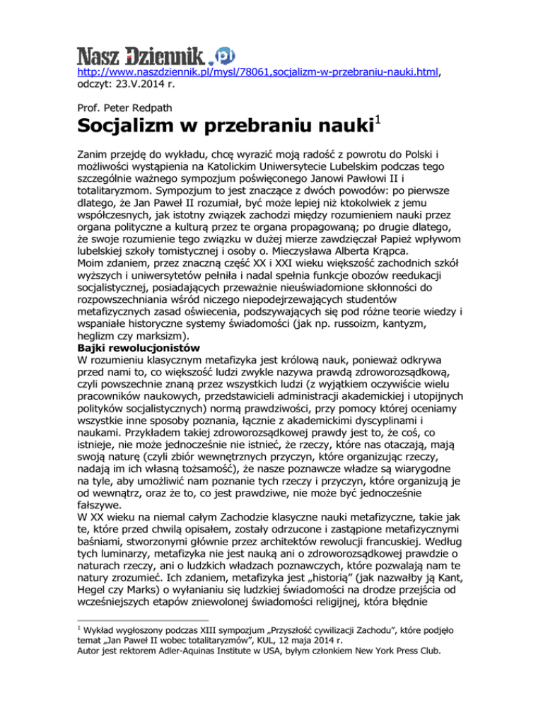 http://www.naszdziennik.pl/mysl/78061,socjalizm-w-przebraniu-nauki.html, odczyt: 23.V.2014 r. Prof. Peter Redpath Socjalizm w przebraniu nauki1 Zanim przejd do wyk adu, chc wyrazi moj rado z powrotu do Polski i mo liwo ci wyst pienia na Katolickim Uniwersytecie Lubelskim podczas tego szczególnie wa nego sympozjum po wi conego Janowi Paw owi II i totalitaryzmom. Sympozjum to jest znacz ce z dwóch powodów: po pierwsze dlatego, e Jan Pawe II rozumia , by mo e lepiej ni ktokolwiek z jemu wspó czesnych, jak istotny zwi zek zachodzi mi dzy rozumieniem nauki przez organa polityczne a kultur przez te organa propagowan ; po drugie dlatego, e swoje rozumienie tego zwi zku w du ej mierze zawdzi cza Papie wp ywom lubelskiej szko y tomistycznej i osoby o. Mieczys awa Alberta Kr pca. Moim zdaniem, przez znaczn cz XX i XXI wieku wi kszo zachodnich szkó wy szych i uniwersytetów pe ni a i nadal spe nia funkcje obozów reedukacji socjalistycznej, posiadaj cych przewa nie nieu wiadomione sk onno ci do rozpowszechniania w ród niczego niepodejrzewaj cych studentów metafizycznych zasad o wiecenia, podszywaj cych si pod ró ne teorie wiedzy i wspania e historyczne systemy wiadomo ci (jak np. russoizm, kantyzm, heglizm czy marksizm). Bajki rewolucjonistów W rozumieniu klasycznym metafizyka jest królow nauk, poniewa odkrywa przed nami to, co wi kszo ludzi zwykle nazywa prawd zdroworozs dkow , czyli powszechnie znan przez wszystkich ludzi (z wyj tkiem oczywi cie wielu pracowników naukowych, przedstawicieli administracji akademickiej i utopijnych polityków socjalistycznych) norm prawdziwo ci, przy pomocy której oceniamy wszystkie inne sposoby poznania, cznie z akademickimi dyscyplinami i naukami. Przyk adem takiej zdroworozs dkowej prawdy jest to, e co , co istnieje, nie mo e jednocze nie nie istnie , e rzeczy, które nas otaczaj , maj swoj natur (czyli zbiór wewn trznych przyczyn, które organizuj c rzeczy, nadaj im ich w asn to samo ), e nasze poznawcze w adze s wiarygodne na tyle, aby umo liwi nam poznanie tych rzeczy i przyczyn, które organizuj je od wewn trz, oraz e to, co jest prawdziwe, nie mo e by jednocze nie fa szywe. W XX wieku na niemal ca ym Zachodzie klasyczne nauki metafizyczne, takie jak te, które przed chwil opisa em, zosta y odrzucone i zast pione metafizycznymi ba niami, stworzonymi g ównie przez architektów rewolucji francuskiej. Wed ug tych luminarzy, metafizyka nie jest nauk ani o zdroworozs dkowej prawdzie o naturach rzeczy, ani o ludzkich w adzach poznawczych, które pozwalaj nam te natury zrozumie . Ich zdaniem, metafizyka jest „histori ” (jak nazwa by j Kant, Hegel czy Marks) o wy anianiu si ludzkiej wiadomo ci na drodze przej cia od wcze niejszych etapów zniewolonej wiadomo ci religijnej, która b dnie 1 Wyk ad wyg oszony podczas XIII sympozjum „Przysz cywilizacji Zachodu”, które podj o temat „Jan Pawe II wobec totalitaryzmów”, KUL, 12 maja 2014 r. Autor jest rektorem Adler-Aquinas Institute w USA, by ym cz onkiem New York Press Club. uto samia prawd z intelektualnym aktem rozumienia wewn trznej organizacji tworz cej natur rzeczy, do wieku czystego rozumu, w którym prawda odnajduje swoje ostateczne rozumienie jako istotna w ciwo NAUKOWO WIECONEJ OGÓLNEJ (tzn. socjalistycznej) WOLI. W tej metafizycznej fantazji utopijnego socjalizmu ca nauki jest podzielona na dwie cz ci: na nauki o cz owieku (czyli nauki spo eczne, sk adaj ce si z ró nych wersji tej historycznej bajki o ludzkiej wiadomo ci, któr przed chwil opisa em) oraz na nauki o fizycznym wszech wiecie, o mo liwo ci zastosowania matematyczno-fizycznych teorii o fizycznym wszech wiecie w celu zmuszenia natury do uleg ci wobec pragnie ludzkiej woli. Pochód socjalizmu Z uwagi na swoj wyj tkow pozycj w sowieckim bloku, g ównie pod wp ywem o. Kr pca i lubelskiej szko y tomistycznej, studenci KUL byli w wi kszo ci wolni od tej propagandy wyst puj cej w przebraniu nauki i od konieczno ci tolerowania wydzia ów nauk spo ecznych i tzw. socjologów, którzy na tych wydzia ach rzekomo nauczali. Bior c pod uwag niedawn mier o. Kr pca, KUL w krótkim czasie prawdopodobnie podzieli ten sam los, co wi kszo zachodnich wy szych szkó i uniwersytetów. Prawdziwa filozofia, nauka, zostanie usuni ta i zast piona przez o wiecone nauki spo eczne, w których intelekt, wola i emocje studentów nie b ju wychowywane do aktywno ci i dociekliwo ci w rozumieniu sposobów osi gania szcz cia. Zamiast tego intelekt dzie urabiany do pasywno ci i bezkrytyczno ci, a wola i emocje studentów stymulowane, zw aszcza poprzez pomna anie codziennych komunikatów informacyjnych, do zrezygnowania ze swoich starych, nietolerancyjnych sposobów my lenia i przyj cia o wieconych, tolerancyjnych pogl dów nale cych do o wieconych, pe nych troski i wra liwo ci socjologów. Mówi c krótko, uwa am, e ca a nowo ytna i wspó czesna nauka, tak jak jest ona potocznie rozumiana i powszechnie propagowana w ród studentów zachodnich wy - szych szkó i uniwersytetów, jest nierozerwalnie po czona i zasadniczo zale na od utopijnego socjalizmu, b cego historyczno-politycznym substytutem metafizyki, którego zadanie polega na usprawiedliwianiu fa szywego twierdzenia, i wszelka prawda jest zawarta w szeroko rozumianej nauce nowo ytnej. Twierdz równie , e je eli ten metafizyczny ba agan nie zostanie rozszyfrowany i zwalczony, to niczym epidemia rozprzestrzeni si w polskich instytucjach edukacyjnych i kulturalnych, dok adnie tak, jak uczyni to na pozosta ym obszarze Zachodu. Za mienie rozumu Aby przeciwdzia rozwojowi tego metafizycznego i moralnego nie adu, wszyscy przedstawiciele Zachodu musz zrozumie , e w dobie wspó czesnej, ównie pod wp ywem architektów rewolucji francuskiej i ich najbardziej zagorza ych uczniów, statystyczny mieszkaniec Zachodu nie uwa a ju prawdy za w ciwo intelektu. Dzisiaj statystyczny mieszkaniec Zachodu ma tendencj do identyfikowania prawdy z w ciwo ciami matematycznie, socjalistycznie i mechanicznie kontrolowanej woli. Poza 