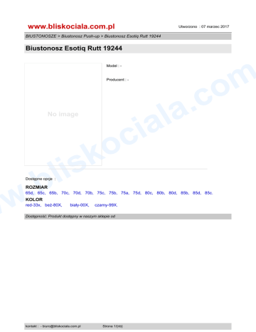 www.bliskociala.com.pl Utworzono : 07 marzec 2017 BIUSTONOSZE > Biustonosz Push-up > Biustonosz Esotiq Rutt 19244 Biustonosz Esotiq Rutt 19244 m o c . a l a Model : - Producent : - No image o k il s w b . w Dostępne opcje : ROZMIAR i c 65d, 65c, 65b, 70c, 70d, 70b, 75c, 75b, 75a, 75d, 80c, 80b, 80d, 85b, 85d, 85c. KOLOR red-33x, beż-80X, biały-00X, czarny-99X. Dostępność: Produkt dostępny w naszym sklepie od kontakt : - [email protected] Strona 1/{nb}