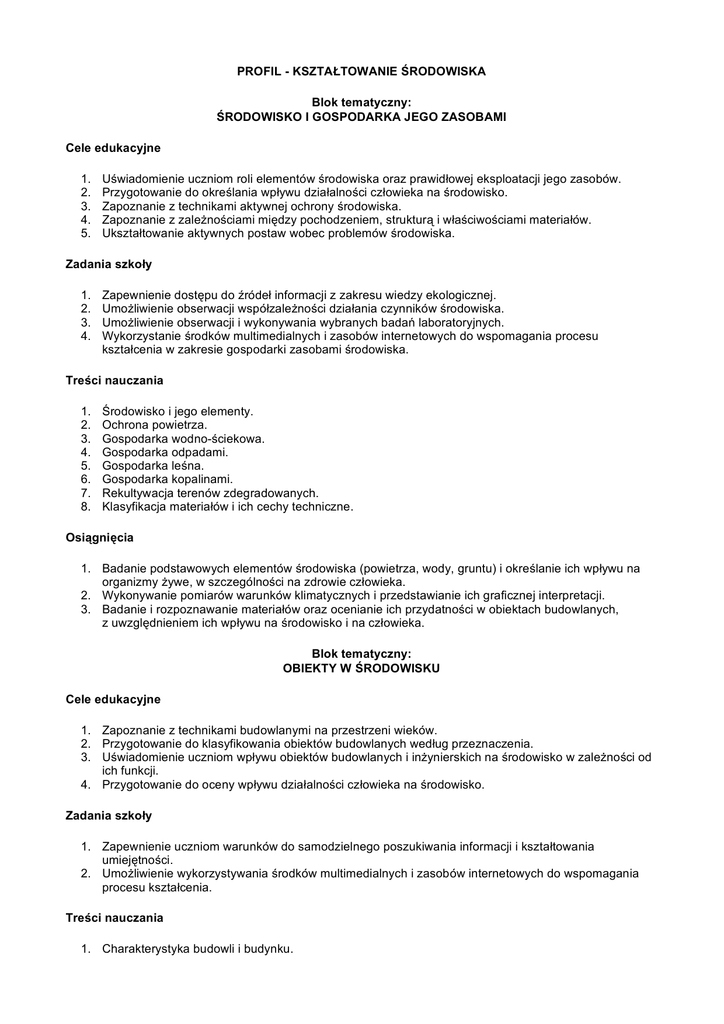 PROFIL - KSZTAŁTOWANIE ŚRODOWISKA Blok tematyczny: ŚRODOWISKO I GOSPODARKA JEGO ZASOBAMI Cele edukacyjne 1. 2. 3. 4. 5. Uświadomienie uczniom roli elementów środowiska oraz prawidłowej eksploatacji jego zasobów. Przygotowanie do określania wpływu działalności człowieka na środowisko. Zapoznanie z technikami aktywnej ochrony środowiska. Zapoznanie z zależnościami między pochodzeniem, strukturą i właściwościami materiałów. Ukształtowanie aktywnych postaw wobec problemów środowiska. Zadania szkoły 1. 2. 3. 4. Zapewnienie dostępu do źródeł informacji z zakresu wiedzy ekologicznej. Umożliwienie obserwacji współzależności działania czynników środowiska. Umożliwienie obserwacji i wykonywania wybranych badań laboratoryjnych. Wykorzystanie środków multimedialnych i zasobów internetowych do wspomagania procesu kształcenia w zakresie gospodarki zasobami środowiska. Treści nauczania 1. 2. 3. 4. 5. 6. 7. 8. Środowisko i jego elementy. Ochrona powietrza. Gospodarka wodno-ściekowa. Gospodarka odpadami. Gospodarka leśna. Gospodarka kopalinami. Rekultywacja terenów zdegradowanych. Klasyfikacja materiałów i ich cechy techniczne. Osiągnięcia 1. Badanie podstawowych elementów środowiska (powietrza, wody, gruntu) i określanie ich wpływu na organizmy żywe, w szczególności na zdrowie człowieka. 2. Wykonywanie pomiarów warunków klimatycznych i przedstawianie ich graficznej interpretacji. 3. Badanie i rozpoznawanie materiałów oraz ocenianie ich przydatności w obiektach budowlanych, z uwzględnieniem ich wpływu na środowisko i na człowieka. Blok tematyczny: OBIEKTY W ŚRODOWISKU Cele edukacyjne 1. Zapoznanie z technikami budowlanymi na przestrzeni wieków. 2. Przygotowanie do klasyfikowania obiektów budowlanych według przeznaczenia. 3. Uświadomienie uczniom wpływu obiektów budowlanych i inżynierskich na środowisko w zależności od ich funkcji. 4. Przygotowanie do oceny wpływu działalności człowieka na środowisko. Zadania szkoły 1. Zapewnienie uczniom warunków do samodzielnego poszukiwania informacji i kształtowania umiejętności. 2. Umożliwienie wykorzystywania środków multimedialnych i zasobów internetowych do wspomagania procesu kształcenia. Treści nauczania 1. Charakterystyka budowli i budynku. 2. 3. 4. 5. Rozwój techniki budowlanej. Procesy urbanizacyjne. Podział obiektów budowlanych według przeznaczenia. Wpływ obiektów budowlanych i inżynierskich na środowisko w zależności od ich funkcji. Osiągnięcia 1. Analizowanie rozwoju techniki budowlanej i procesów urbanizacyjnych w aspekcie historycznym. 2. Rozpoznawanie obiektów mających wpływ na środowisko w zależności od ich przeznaczenia. 3. Analizowanie wpływu procesów inwestycyjnych na środowisko w zależności od przeznaczenia obiektów. 4. Wyodrębnianie elementów budowli i budynku. 5. Określanie możliwości kształtowania przestrzeni w zgodzie z prawami przyrody. 6. Analizowanie planów zagospodarowania terenu pod kątem wpływu inwestycji na środowisko. Blok tematyczny: PLANOWANIE ELEMENTÓW ŚRODOWISKA Cele edukacyjne 1. Zapoznanie z zasadami wykonywania dokumentacji projektowej i jej elementów. 2. Przygotowanie do wykonywania dokumentacji projektowej nieskomplikowanego obiektu budowlanego lub planu urbanistycznego. 3. Przygotowanie do wykonywania inwentaryzacji budowlanej i urbanistycznej. 4. Zapoznanie z podstawowymi pracami mierniczymi. 5. Przygotowanie do planowania działań w zakresie ochrony wybranego elementu środowiska. 6. Przygotowanie do zaplanowania rozwiązania dla wybranego elementu kształtującego środowisko. Zadania szkoły 1. 2. 3. 4. Zapewnienie dostępu do przykładowych dokumentacji projektowych. Zapewnienie warunków do wykonywania podstawowych pomiarów geodezyjnych. Zapewnienie warunków do projektowania działań w zakresie ochrony środowiska. Zapewnienie warunków do posługiwania się technologią informatyczną w zakresie projektowania wybranego elementu kształtującego środowisko, ze szczególnym uwzględnieniem możliwości wykorzystania komputerowego wspomagania projektowania. 5. Uzupełnianie bazy informatycznej zgodnie z jej rozwojem technologicznym. Treści nauczania 1. 2. 3. 4. 5. 6. Elementy rysunku technicznego i odręcznego. Dokumentacja techniczna. Komputerowe wspomaganie projektowania. Inwentaryzacja budowlana i urbanistyczna. Podstawy miernictwa. Opracowanie rozwiązania wybranego elementu kształtującego lub chroniącego środowisko. Osiągnięcia 1. Analizowanie dokumentacji technicznej obiektów budowlanych i inżynierskich. 2. Wykonywanie elementów dokumentacji architektoniczno-budowlanej oraz rysunków inwentaryzacyjnych. 3. Wykorzystanie programu komputerowego do wspomagania projektowania dokumentacji technicznej. 4. Wykonywanie prostych pomiarów w terenie z wykorzystaniem podstawowego sprzętu mierniczego. 5. Rozpoznawanie w terenie elementów planu sytuacyjno-wysokościowego. 6. Planowanie rozwiązań w zakresie ochrony wybranego elementu środowiska lub gospodarki zasobami środowiska. 7. Zaprojektowanie wybranego elementu kształtującego środowisko, w szczególności: 8. planu zagospodarowania urbanistycznego małego zespołu mieszkaniowego, 9. koncepcji budynku mieszkalnego jednorodzinnego, 10. zagospodarowania terenów zielonych, 11. zagospodarowania terenów rekreacyjnych.