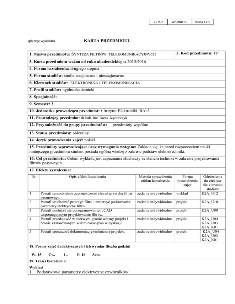 Z1-PU7 WYDANIE N1 Strona 1 z 4 KARTA PRZEDMIOTU (pieczęć wydziału) 1. Nazwa przedmiotu: SYNTEZA FILTRÓW TELEKOMUNIKACYJNYCH 2. Kod przedmiotu: FP 3. Karta przedmiotu ważna od roku akademickiego: 2015/2016 4. Forma kształcenia: drugiego stopnia 5. Forma studiów: studia stacjonarne i niestacjonarne 6. Kierunek studiów: ELEKTRONIKA I TELEKOMUNIKACJA 7. Profil studiów: ogólnoakademicki 8. Specjalność: 9. Semestr: 2 10. Jednostka prowadząca przedmiot: : Instytut Elektroniki, RAu3 11. Prowadzący przedmiot: dr hab. inż. Jacek Izydorczyk 12. Przynależność do grupy przedmiotów: przedmioty wspólne 13. Status przedmiotu: obieralny 14. Język prowadzenia zajęć: polski 15. Przedmioty wprowadzające oraz wymagania wstępne: Zakłada się, że przed rozpoczęciem nauki niniejszego przedmiotu student posiada ogólną wiedzę z zakresu podstaw elektrotechniki. 16. Cel przedmiotu: Celem wykładu jest zapoznanie słuchaczy ze stanem techniki w zakresie projektowania filtrów pasywnych. 17. Efekty kształcenia: Nr 1 2 3 4 5 Opis efektu kształcenia Potrafi samodzielnie zaprojektować charakterystykę filtru pasmowego. Potrafi uruchomić prototyp filtru i zmierzyć podstawowe parametry elektryczne filtru. Potrafi posłużyć się oprogramowaniem CAD wspomagającym projektowanie filtrów. Potrafi przedstawić w szerszym gronie własny projekt i bronić zastosowanych w nim rozwiązań w dyskusji. zadanie indywidualne wykład Odniesienie do efektów dla kierunku studiów K2A_U12 zadanie indywidualne projekt K2A_U10 zadanie indywidualne projekt K2A_U09 zadanie indywidualne projekt Potrafi sporządzić dokumentację techniczną projektu. zadanie indywidualne projekt K2A_U04 K2A_U03 K2A_K01 K2A_U04 K2A_U03 K2A_K01 18. Formy zajęć dydaktycznych i ich wymiar (liczba godzin) W. 15 Ćw. L. P. 16 Sem. 19. Treści kształcenia: Wykład 1. Podstawowe parametry elektryczne czwórników. Metoda sprawdzenia efektu kształcenia Forma prowadzenia zajęć Z1-PU7 WYDANIE N1 Strona 2 z 4 2. Niesymetryczna aproksymacja charakterystyki idealnego filtru dolnoprzepustowego – uogólniony filtr Czebyszewa. 3. Parametry admitancyjne filtru Czebyszewa. 4. Klasyczne filtry drabinkowe. 5. Filtry ze sprzężonymi rezonatorami. 6. Filtry o parametrach rozłożonych. 7. Filtry z rezonatorami dielektrycznymi. 8. Metody miniaturyzacji. Projekt W ramach projektu studenci projektują zadany pasywny filtr pasmowy. Zaprojektowany filtr jest realizowany w postaci pasywnej albo w postaci układu aktywnego symulującego działanie filtru pasywnego. Układ filtru jest strojony. Mierzone są podstawowe parametry elektryczne filtru, a wyniki pomiarów porównywane są z projektem. 20. Egzamin: nie1 21. Literatura podstawowa: [1] Izydorczyk Jacek, Konopacki Jacek, Filtry analogowe i cyfrowe, Wyd. Pracowni Komputerowej Jacka Skalmierskiego, Katowice 2003 [2] Izydorczyk Jacek, Płonka Grzegorz, Tyma Grzegorz, Teoria sygnałów: wstęp. Kompendium wiedzy na temat sygnałów i metod ich przetwarzania - wyd.II, Helion, Gliwice, 2006 [3] Robert E. Collin, Foundations For Microwave Engineering, John Wiley & Sons, Inc., Hoboken, New Jersey, 2001 [4] David M. Pozar, Microwave Engineering, John Wiley & Sons, Inc., Hoboken, New Jersey, 1998 22. Literatura uzupełniająca: [1] O. Brune, “Synthesis of a finite 2-terminal network whose driving point impedance is a prescribed function of frequency,” J. Math. Phys., vol. 10, no. 3, pp. 191–236, 1931. [2] S. Darlington, “Synthesis of reactance 4-poles which produce insertion loss characteristics,” J. Math. Phys., vol. 18, pp. 257–353, 1939. [3] H. W. Bode, Network Analysis and Feedback Amplifier Design. Princeton,NJ: Van Nostrand, 1945. [4] M. E. van Valkenburg, Network Analysis. Englewood Cliffs, NJ:Prentice-Hall, 1955. [5] H. J. Carlin, “The scattering matrix in network theory,” IRE Trans. Circuit Theory, vol. CT-3, pp. 88–96, June 1956. [6] R. F. Baum, “Design of unsymmetrical band-pass filters,” IRE Trans. Circuit Theory, vol. CT-4, pp. 33–40, June 1957. [7] S. B. Cohn, “Direct coupled cavity filters,” Proc. IRE, vol. 45,pp. 187–196, Feb. 1957. [8] E. A. Guillemin, Synthesis of Passive Networks. New York: Wiley, 1957. [9] W. Cauer, Synthesis of Linear Communication Networks. New York:McGraw-Hill, 1958. [10] R Saal and E. Ulbrich, “On the design of filters by synthesis,” IRE Trans., vol. CT-5, pp. 284–327, Dec. 1958. [11] G. Matthaei, L. Young, and E. M. T. Jones, Microwave Filters, Impedance Matching Networks and Coupling Structures. Norwood, MA: Artech House, 1980. [12] R. Levy, “Theory of direct coupled cavity filters,” IEEE Trans. Microwave Theory Tech., vol. 11, pp. 162–178, May 1963. [13] H. J. Orchard and G. C. Temes, “Filter design using transformed variables,” IEEE Trans. Circuit Theory, vol. CT-15, pp. 385–408, Dec. 1968. [14] J. D. Rhodes, Theory of Electrical Filters. New York: Wiley, 1976. [15] J. D. Rhodes, “Filters approximating ideal amplitude and arbitrary phase characteristics,” IEEE Trans. Circuit Theory, vol. 20, pp. 150–153, Mar. 1973. [16] J. D. Rhodes, “The generalized direct-coupled cavity linear phase filter,” IEEE Trans. Microwave Theory Tech., vol. 18, pp. 308–313, June 1970. [17] A. E. Atia and A. E. Williams, “New types of bandpass filters for satellite transponders,” COMSAT Tech. Rev., vol. 1, pp. 21–43, Fall 1971. [18] A. E. Atia and A. E. Williams, “Narrow-bandpass waveguide filters,” IEEE Trans. Microwave Theory Tech., vol. 20, pp. 258–265, Apr. 1972. [19] A. E. Atia and A. E. Williams, “Nonminimum-phase optimumamplitude bandpass waveguide filters,” IEEE Trans. Microwave Theory Tech., vol. 22, pp. 425–431, Apr. 1974. [20] A. E. Atia, A. E. Williams, and R. W. Newcomb, “Narrow-band multiple-coupled cavity synthesis,” IEEE Z1-PU7 WYDANIE N1 Strona 3 z 4 Trans. Circuits Syst., vol. 21, pp. 649–655, Sept. 1974. [21] R. J. Cameron, “General coupling matrix synthesis methods for Ch