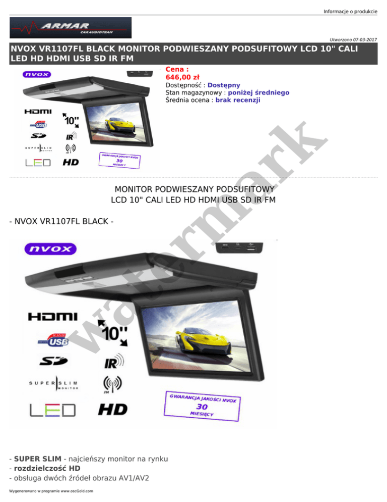 Informacje o produkcie Utworzono 07-03-2017 NVOX VR1107FL BLACK MONITOR PODWIESZANY PODSUFITOWY LCD 10" CALI LED HD HDMI USB SD IR FM Cena : 646,00 zł er m ar k Dostępność : Dostępny Stan magazynowy : poniżej średniego Średnia ocena : brak recenzji MONITOR PODWIESZANY PODSUFITOWY LCD 10" CALI LED HD HDMI USB SD IR FM w at - NVOX VR1107FL BLACK - - SUPER SLIM - najcieńszy monitor na rynku - rozdzielczość HD - obsługa dwóch źródeł obrazu AV1/AV2 Wygenerowano w programie www.oscGold.com - wbudowane głośniki - wysoka jakość wykonania - wbudowane złącze USB SD - pozwala na odtwarzanie filmów, muzyki i zdjęć z pamięci przenośnych - transmiter FM do bezprzewodowej transmisji dźwięku - nadajnik IR do bezprzewodowych słuchawek er m ar k wysokiej jakości aktywna matryca LED 10,2 cala o szerokim kącie oglądania systemy: PAL/NTSC jasność 500:1, kontrast 900:1 format 16:9 rozdzielczość HD: 800x480 wejście HDMI wejście USB wejście micro SD 2 x wejścia video RCA AV1/AV2 niski pobór mocy: do 12W zasilanie: DC 12V ( opcjonalnie zasilacz DC 24V ) wbudowane 2 lampki podświetlające kolor: czarny waga: ok. 1,1kg w at wymiary podstawy monitora: szer. 300mm x dł. 250mm x gr.30mm wysokość ekranu od podstawy po rozłożeniu: 157mm wymiary ekranu: szer. 254mm x dł. 170mm x gr. 13mm wymiary płyty montażowej: szer. 288mm x dł. 186mm
