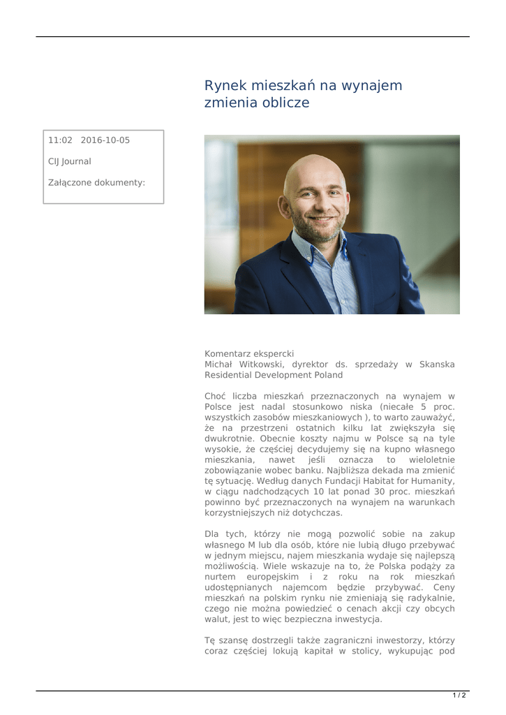 Rynek mieszkań na wynajem zmienia oblicze 11:02 2016-10-05 CIJ Journal Załączone dokumenty: Komentarz ekspercki Michał Witkowski, dyrektor ds. sprzedaży w Skanska Residential Development Poland Choć liczba mieszkań przeznaczonych na wynajem w Polsce jest nadal stosunkowo niska (niecałe 5 proc. wszystkich zasobów mieszkaniowych ), to warto zauważyć, że na przestrzeni ostatnich kilku lat zwiększyła się dwukrotnie. Obecnie koszty najmu w Polsce są na tyle wysokie, że częściej decydujemy się na kupno własnego mieszkania, nawet jeśli oznacza to wieloletnie zobowiązanie wobec banku. Najbliższa dekada ma zmienić tę sytuację. Według danych Fundacji Habitat for Humanity, w ciągu nadchodzących 10 lat ponad 30 proc. mieszkań powinno być przeznaczonych na wynajem na warunkach korzystniejszych niż dotychczas. Dla tych, którzy nie mogą pozwolić sobie na zakup własnego M lub dla osób, które nie lubią długo przebywać w jednym miejscu, najem mieszkania wydaje się najlepszą możliwością. Wiele wskazuje na to, że Polska podąży za nurtem europejskim i z roku na rok mieszkań udostępnianych najemcom będzie przybywać. Ceny mieszkań na polskim rynku nie zmieniają się radykalnie, czego nie można powiedzieć o cenach akcji czy obcych walut, jest to więc bezpieczna inwestycja. Tę szansę dostrzegli także zagraniczni inwestorzy, którzy coraz częściej lokują kapitał w stolicy, wykupując pod 1/2 wynajem całe kompleksy mieszkaniowe. Zagraniczni przedsiębiorcy w naszym kraju, to nie tylko dobry sygnał dla polskiej gospodarki, ale także dobra wróżba dla rodzimego rynku mieszkań przeznaczonych na wynajem. Do tej pory ten sektor był zdominowany przez prywatnych właścicieli, którzy pokrywają 75 proc. potrzeb rynku . W przyszłości ma się to zmienić. Jak podkreślają eksperci firmy REAS, nieruchomości przeznaczone pod wynajem są postrzegane jako aktywa niskiego ryzyka, a dzięki stabilnej gospodarce i dobrym wynikom tego sektora rynku, Polska stała się interesującym punktem na mapie dla tego typu inwestorów . W ciągu najbliższych lat w Polsce przybędzie takich projektów mieszkaniowych, które powstały wyłącznie z myślą o wynajmie. 2/2