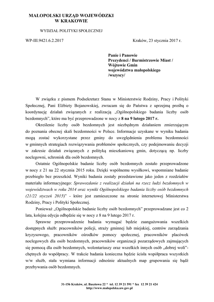MAŁOPOLSKI URZĄD WOJEWÓDZKI W KRAKOWIE WYDZIAŁ POLITYKI SPOŁECZNEJ WP-III.9421.6.2.2017 Kraków, 23 stycznia 2017 r. Panie i Panowie Prezydenci / Burmistrzowie Miast / Wójtowie Gmin województwa małopolskiego /wszyscy/ W związku z pismem Podsekretarz Stanu w Ministerstwie Rodziny, Pracy i Polityki Społecznej, Pani Elżbiety Bojanowskiej, zwracam się do Państwa z uprzejmą prośbą o koordynację działań związanych z realizacją „Ogólnopolskiego badania liczby osób bezdomnych”, które ma być przeprowadzone w nocy z 8 na 9 lutego 2017 r. Określenie liczby osób bezdomnych jest niezbędnym działaniem zmierzającym do poznania obecnej skali bezdomności w Polsce. Informacje uzyskane w wyniku badania mogą zostać wykorzystane przez gminy do uwzględnienia problemu bezdomności w gminnych strategiach rozwiązywania problemów społecznych, czy podejmowaniu decyzji w zakresie działań związanych z polityką mieszkaniową gmin, dotyczącą np. liczby noclegowni, schronisk dla osób bezdomnych. Ostatnie Ogólnopolskie badanie liczby osób bezdomnych zostało przeprowadzone w nocy z 21 na 22 stycznia 2015 roku. Dzięki wspólnemu wysiłkowi, wspomniane badanie przebiegło bez przeszkód. Wyniki badania zostały przedstawione jako jeden z rozdziałów materiału informacyjnego: Sprawozdanie z realizacji działań na rzecz ludzi bezdomnych w województwach w roku 2014 oraz wyniki Ogólnopolskiego badania liczby osób bezdomnych (21/22 styczeń 2015)” - które jest zamieszczone na stronie internetowej Ministerstwa Rodziny, Pracy i Polityki Społecznej. Ponieważ „Ogólnopolskie badanie liczby osób bezdomnych” przeprowadzane jest co 2 lata, kolejna edycja odbędzie się w nocy z 8 na 9 lutego 2017 r. Sprawne przeprowadzenie badania wymagać będzie zaangażowania wszelkich dostępnych służb: pracowników policji, straży gminnej lub miejskiej, centrów zarządzania kryzysowego, pracowników ośrodków pomocy społecznej, pracowników placówek noclegowych dla osób bezdomnych, pracowników organizacji pozarządowych zajmujących się pomocą dla osób bezdomnych, wolontariuszy oraz wszelkich innych osób „dobrej woli”chętnych do współpracy. W trakcie badania konieczna będzie ścisła współpraca wszystkich w/w służb, stała wymiana informacji odnośnie aktualnych map grupowania się bądź przebywania osób bezdomnych. 31-156 Kraków, ul. Basztowa 22 * tel. 12 39 21 591 * fax 12 39 21 424 http://www.malopolska.uw.gov.pl -2Niezbędnym jest, aby w każdej gminie został wyznaczony - gminny koordynator badania. Wojewódzkim koordynatorem badania jest p. Marcin Podbielski – tel. 12 39 21 296, straszy inspektor wojewódzki w Oddziale Pomocy Stacjonarnej. Sposób przeprowadzenia Ogólnopolskiego badania liczby osób bezdomnych został opisany szczegółowo w załączniku nr 1 do niniejszego pisma. Dane o liczbie osób bezdomnych w gminie oraz informacje uzyskane z kwestionariusza należy wprowadzić do sprawozdania jednorazowego DPS-IV-60-IR/2017 w Centralnej Aplikacji Statystycznej (wzór sprawozdania CAS – załącznik nr 2, wersja orientacyjna). Ostateczny termin wypełnienia przez gminy sprawozdania jednorazowego upływa 24 lutego 2017 r. Realizacja badania w nocy z 8 na 9 lutego 2017 r., oprócz pozyskania informacji o liczbie osób bezdomnych w placówkach i miejscach niemieszkalnych, pozwoli uzyskać dane socjodemograficzne o grupie osób bezdomnych. Dane te mogą pomóc kreować lokalną politykę społeczną w zakresie problematyki bezdomności. W związku z powyższym w trakcie realizacji badania w nocy z 8 na 9 lutego 2017 r. należy skorzystać z narzędzia Kwestionariusz osoby bezdomnej (załącznik nr 3) , który zawiera pytania. W trakcie realizacji badania należy zwrócić szczególną uwagę na sytuację osób przebywających na ogródkach działkowych. W przypadku stwierdzenia, iż osoby te, od długiego czasu mieszkają w warunkach zbliżonych do mieszkalnych, nie należy ich obejmować badaniem i zaliczać do osób bezdomnych. Ogólnopolskie badanie liczby osób bezdomnych jest okazją do poznania miejsc grupowania się osób bezdomnych na danym terenie oraz umożliwi udzielenie bezpośredniej pomocy osobom bezdomnym (zwłaszcza tym, znajdującym się poza placówkami noclegowymi), do których będą docierać realizatorzy badania. Osobom bezdomnym należy udzielić wtedy natychmiastowej pomocy, dostarczyć posiłek czy ciepłą odzież. Proszę o zwrócenie uwagi także i na ten aspekt planowanego działania. Załączniki będzie można pobrać również w najbliższym czasie na stronie internetowej MUW link: http://muw.pl/default.aspx?page=pomoc_dla_bezdomnych, zakładka „Ogólnopolskie badanie liczby osób bezdomnych w 2017 r.” Uprzejmie proszę o zapewnienie sprawnego przeprowadzenia badania. Jednocześnie bardzo dziękuję za dotychczasowe zaangażowanie w pomoc osobom bezdomnym. Dyrektor Wydziału Jacek Kowalczyk 31-156 Kraków, ul. Basztowa 22 * tel. 12 39 21 591 * fax 12 39 21 424 http://www.malopolska.uw.gov.pl -3- 1. Załącznik nr 1- Ogólnopolskie badanie liczby osób bezdomnych w nocy z 8 na 9 lutego 2. 2017 r.- Ogólne wskazówki dotyczące sposobu realizacji badania. Załącznik nr 2 - Sprawozdanie jednorazowe DPS-IV-60-IR/2017 – Tablica sprawozdania, wersja orientacyjna. 3. Załącznik nr 3 - Kwestionariusz dotyczący osoby bezdomnej. Wzór Do wiadomości: Starostowie Powiatów – wszyscy w Małopolsce 31-156 Kraków, ul. Basztowa 22 * tel. 12 39 21 591 * fax 12 39 21 424 http://www.malopolska.uw.gov.pl
