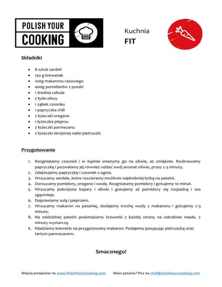 Kuchnia FIT Składniki 8 sztuk sardeli 150 g krewetek 100g makaronu razowego 400g pomidorów z puszki 1 średnia cebula 2 łyżki oliwy 1 ząbek czosnku 1 papryczka chili 2 łyżeczki oregano 1 łyżeczka pieprzu 2 łyżeczki parmezanu 2 łyżeczki skrojonej natki pietruszki Przygotowanie 1. Rozgniatamy czosnek i w łupinie smażymy go na oliwie, aż zmięknie. Rozkrawamy papryczkę i pozwalamy jej również oddać swój aromat oliwie, przez 2-3 minuty. 2. Zdejmujemy papryczkę i czosnek z ognia. 3. Wrzucamy sardele, które rozcieramy możliwie najdrobniej łyżką na patelni. 4. Dorzucamy pomidory, oregano i wodę. Rozgniatamy pomidory i gotujemy 10 minut. 5. Wrzucamy pokrojone kapary i oliwki i gotujemy aż pomidory się rozpadną i sos zgęstnieje. 6. Doprawiamy solą i pieprzem. 7. Wrzucamy makaron na patelnię, dodajemy trochę wody z makaronu i gotujemy 2-3 minuty. 8. Na oddzielnej patelni podsmażamy krewetki z każdej strony na odrobinie masła. 2 minuty wystarczą. 9. Kładziemy krewetki na przygotowany makaron. Podajemy posypując pietruszką oraz tartym parmezanem. Smacznego! Więcej przepisów na www.PolishYourCooking.com Masz pytania? Pisz na [email protected]