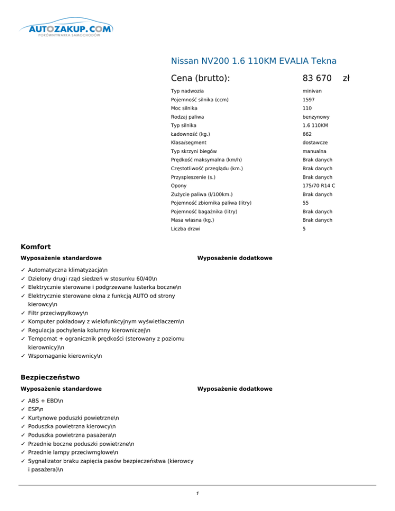Nissan NV200 1.6 110KM EVALIA Tekna Cena (brutto): 83 670 Typ nadwozia minivan Pojemność silnika (ccm) 1597 Moc silnika 110 Rodzaj paliwa benzynowy Typ silnika 1.6 110KM Ładowność (kg.) 662 Klasa/segment dostawcze Typ skrzyni biegów manualna Prędkość maksymalna (km/h) Brak danych Częstotliwość przeglądu (km.) Brak danych Przyspieszenie (s.) Brak danych Opony 175/70 R14 C Zużycie paliwa (l/100km.) Brak danych Pojemność zbiornika paliwa (litry) 55 Pojemność bagażnika (litry) Brak danych Masa własna (kg.) Brak danych Liczba drzwi 5 Komfort Wyposażenie standardowe Wyposażenie dodatkowe ✓ Automatyczna klimatyzacja\n ✓ Dzielony drugi rząd siedzeń w stosunku 60/40\n ✓ Elektrycznie sterowane i podgrzewane lusterka boczne\n ✓ Elektrycznie sterowane okna z funkcją AUTO od strony kierowcy\n ✓ Filtr przeciwpyłkowy\n ✓ Komputer pokładowy z wielofunkcyjnym wyświetlaczem\n ✓ Regulacja pochylenia kolumny kierowniczej\n ✓ Tempomat + ogranicznik prędkości (sterowany z poziomu kierownicy)\n ✓ Wspomaganie kierownicy\n Bezpieczeństwo Wyposażenie standardowe Wyposażenie dodatkowe ✓ ABS + EBD\n ✓ ESP\n ✓ Kurtynowe poduszki powietrzne\n ✓ Poduszka powietrzna kierowcy\n ✓ Poduszka powietrzna pasażera\n ✓ Przednie boczne poduszki powietrzne\n ✓ Przednie lampy przeciwmgłowe\n ✓ Sygnalizator braku zapięcia pasów bezpieczeństwa (kierowcy i pasażera)\n 1 zł ✓ Trzypunktowe pasy bezpieczeństwa w drugim rzędzie siedzeń\n ✓ Trzypunktowe pasy bezpieczeństwa z napinaczami i ogranicznikami siły napięcia\n ✓ Tylne lampy przeciwmgłowe\n ✓ Układ wspomagania hamowania bazujący na czujnikach prędkości\n Dodatki Wyposażenie standardowe Wyposażenie dodatkowe ✓ 14" felgi ze stopów metali lekkich ✕ Lakier metalik 1661 PLN ✓ 4 głośniki ✕ Trzeci rząd siedzeń z trzypunktowymi pasami bezpieczeństwa (2 siedzenia) 4300 PLN ✓ 4 haki do mocowania ładunku w podłodze\n ✓ 6 uchwytów na kubki\n ✓ Antena dachowa\n ✓ Centralny zamek z pilotem\n ✓ Gniazdo 12V (2 sztuki)\n ✓ Immobilizer\n ✓ Inteligentny kluczyk\n ✓ Konsola centralna z przykrywą\n ✓ Lusterka boczne w kolorze nadwozia\n ✓ Miejsce na wizytówki oraz monety\n ✓ Opony - 175/70 R14 C\n ✓ Pełnowymiarowe koło zapasowe\n ✓ Podgrzewane przednie siedzenia kierowcy i pasażera\n ✓ Popielniczka\n ✓ Przeszklone lewe drzwi przesuwne\n ✓ Przeszklone prawe drzwi przesuwne\n ✓ Schowek pod siedzeniem\n ✓ Tylna klapa z zieloną szybą + podgrzewanie tylnej szyby + tylna wycieraczka\n ✓ Wewnętrzne lusterko wsteczne\n ✓ Zderzaki w kolorze nadwozia\n ✓ Zewnętrzne klamki drzwi w kolorze nadwozia\n Doprecyzowanie oferty ✕ Pakiet IT - 2500 PLN Automatyczne światła Automatyczne wycieraczki Bluetooth Kamera cofania odtwarzacz CD, MP3 system Nissan Connect Wejście USB i AUX-IN 2 Wielofunkcyjna kierownica Kontakt: Nazwa użytkownika: admin Nazwa firmy: qqq Adres: qqq 12, 41-706 qqq1, NIP: 954 REGON: 1 Telefon: 123, 1 Fax: 1 Email: 1 www: 3
