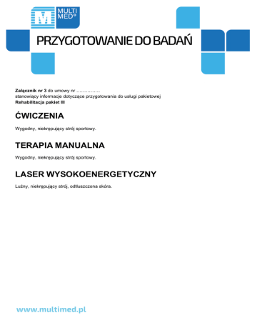 Załącznik nr 3 do umowy nr …………… stanowiący informacje dotyczące przygotowania do usługi pakietowej Rehabilitacja pakiet III ĆWICZENIA Wygodny, niekrępujący strój sportowy. TERAPIA MANUALNA Wygodny, niekrępujący strój sportowy. LASER WYSOKOENERGETYCZNY Luźny, niekrępujący strój, odtłuszczona skóra. Strona1z1