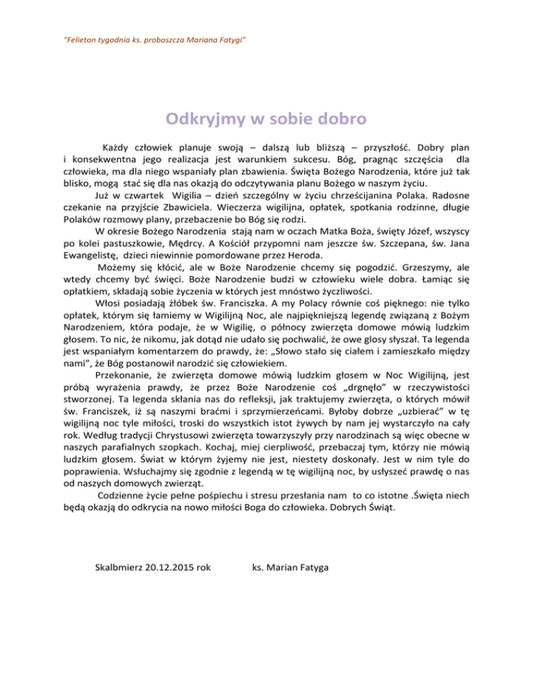 "Felieton tygodnia ks. proboszcza Mariana Fatygi" Odkryjmy w sobie dobro Każdy człowiek planuje swoją – dalszą lub bliższą – przyszłość. Dobry plan i konsekwentna jego realizacja jest warunkiem sukcesu. Bóg, pragnąc szczęścia dla człowieka, ma dla niego wspaniały plan zbawienia. Święta Bożego Narodzenia, które już tak blisko, mogą stać się dla nas okazją do odczytywania planu Bożego w naszym życiu. Już w czwartek Wigilia – dzień szczególny w życiu chrześcijanina Polaka. Radosne czekanie na przyjście Zbawiciela. Wieczerza wigilijna, opłatek, spotkania rodzinne, długie Polaków rozmowy plany, przebaczenie bo Bóg się rodzi. W okresie Bożego Narodzenia stają nam w oczach Matka Boża, święty Józef, wszyscy po kolei pastuszkowie, Mędrcy. A Kościół przypomni nam jeszcze św. Szczepana, św. Jana Ewangelistę, dzieci niewinnie pomordowane przez Heroda. Możemy się kłócić, ale w Boże Narodzenie chcemy się pogodzić. Grzeszymy, ale wtedy chcemy być święci. Boże Narodzenie budzi w człowieku wiele dobra. Łamiąc się opłatkiem, składają sobie życzenia w których jest mnóstwo życzliwości. Włosi posiadają żłóbek św. Franciszka. A my Polacy równie coś pięknego: nie tylko opłatek, którym się łamiemy w Wigilijną Noc, ale najpiękniejszą legendę związaną z Bożym Narodzeniem, która podaje, że w Wigilię, o północy zwierzęta domowe mówią ludzkim głosem. To nic, że nikomu, jak dotąd nie udało się pochwalić, że owe glosy słyszał. Ta legenda jest wspaniałym komentarzem do prawdy, że: „Słowo stało się ciałem i zamieszkało między nami”, że Bóg postanowił narodzić się człowiekiem. Przekonanie, że zwierzęta domowe mówią ludzkim głosem w Noc Wigilijną, jest próbą wyrażenia prawdy, że przez Boże Narodzenie coś „drgnęło” w rzeczywistości stworzonej. Ta legenda skłania nas do refleksji, jak traktujemy zwierzęta, o których mówił św. Franciszek, iż są naszymi braćmi i sprzymierzeńcami. Byłoby dobrze „uzbierać” w tę wigilijną noc tyle miłości, troski do wszystkich istot żywych by nam jej wystarczyło na cały rok. Według tradycji Chrystusowi zwierzęta towarzyszyły przy narodzinach są więc obecne w naszych parafialnych szopkach. Kochaj, miej cierpliwość, przebaczaj tym, którzy nie mówią ludzkim głosem. Świat w którym żyjemy nie jest, niestety doskonały. Jest w nim tyle do poprawienia. Wsłuchajmy się zgodnie z legendą w tę wigilijną noc, by usłyszeć prawdę o nas od naszych domowych zwierząt. Codzienne życie pełne pośpiechu i stresu przesłania nam to co istotne .Święta niech będą okazją do odkrycia na nowo miłości Boga do człowieka. Dobrych Świąt. Skalbmierz 20.12.2015 rok ks. Marian Fatyga Ks. Marian Fatyga