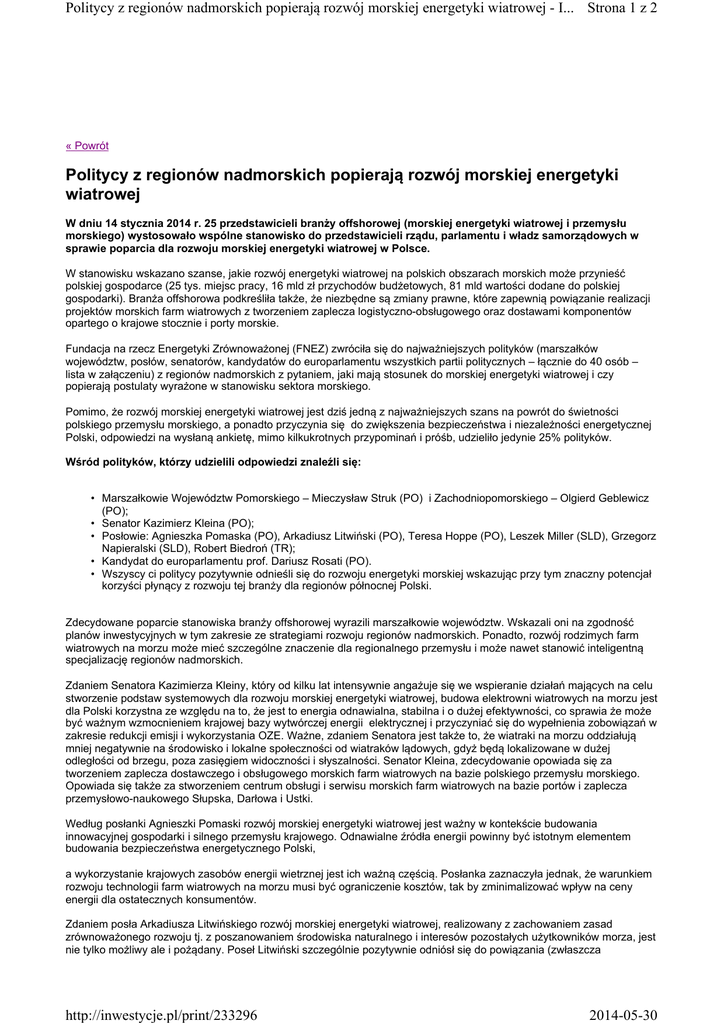 Politycy z regionów nadmorskich popierają rozwój morskiej energetyki wiatrowej - I... Strona 1 z 2 « Powrót Politycy z regionów nadmorskich popierają rozwój morskiej energetyki wiatrowej W dniu 14 stycznia 2014 r. 25 przedstawicieli branży offshorowej (morskiej energetyki wiatrowej i przemysłu morskiego) wystosowało wspólne stanowisko do przedstawicieli rządu, parlamentu i władz samorządowych w sprawie poparcia dla rozwoju morskiej energetyki wiatrowej w Polsce. W stanowisku wskazano szanse, jakie rozwój energetyki wiatrowej na polskich obszarach morskich może przynieść polskiej gospodarce (25 tys. miejsc pracy, 16 mld zł przychodów budżetowych, 81 mld wartości dodane do polskiej gospodarki). Branża offshorowa podkreśliła także, że niezbędne są zmiany prawne, które zapewnią powiązanie realizacji projektów morskich farm wiatrowych z tworzeniem zaplecza logistyczno-obsługowego oraz dostawami komponentów opartego o krajowe stocznie i porty morskie. Fundacja na rzecz Energetyki Zrównoważonej (FNEZ) zwróciła się do najważniejszych polityków (marszałków województw, posłów, senatorów, kandydatów do europarlamentu wszystkich partii politycznych – łącznie do 40 osób – lista w załączeniu) z regionów nadmorskich z pytaniem, jaki mają stosunek do morskiej energetyki wiatrowej i czy popierają postulaty wyrażone w stanowisku sektora morskiego. Pomimo, że rozwój morskiej energetyki wiatrowej jest dziś jedną z najważniejszych szans na powrót do świetności polskiego przemysłu morskiego, a ponadto przyczynia się do zwiększenia bezpieczeństwa i niezależności energetycznej Polski, odpowiedzi na wysłaną ankietę, mimo kilkukrotnych przypominań i próśb, udzieliło jedynie 25% polityków. Wśród polityków, którzy udzielili odpowiedzi znaleźli się: • Marszałkowie Województw Pomorskiego – Mieczysław Struk (PO) i Zachodniopomorskiego – Olgierd Geblewicz (PO); • Senator Kazimierz Kleina (PO); • Posłowie: Agnieszka Pomaska (PO), Arkadiusz Litwiński (PO), Teresa Hoppe (PO), Leszek Miller (SLD), Grzegorz Napieralski (SLD), Robert Biedroń (TR); • Kandydat do europarlamentu prof. Dariusz Rosati (PO). • Wszyscy ci politycy pozytywnie odnieśli się do rozwoju energetyki morskiej wskazując przy tym znaczny potencjał korzyści płynący z rozwoju tej branży dla regionów północnej Polski. Zdecydowane poparcie stanowiska branży offshorowej wyrazili marszałkowie województw. Wskazali oni na zgodność planów inwestycyjnych w tym zakresie ze strategiami rozwoju regionów nadmorskich. Ponadto, rozwój rodzimych farm wiatrowych na morzu może mieć szczególne znaczenie dla regionalnego przemysłu i może nawet stanowić inteligentną specjalizację regionów nadmorskich. Zdaniem Senatora Kazimierza Kleiny, który od kilku lat intensywnie angażuje się we wspieranie działań mających na celu stworzenie podstaw systemowych dla rozwoju morskiej energetyki wiatrowej, budowa elektrowni wiatrowych na morzu jest dla Polski korzystna ze względu na to, że jest to energia odnawialna, stabilna i o dużej efektywności, co sprawia że może być ważnym wzmocnieniem krajowej bazy wytwórczej energii elektrycznej i przyczyniać się do wypełnienia zobowiązań w zakresie redukcji emisji i wykorzystania OZE. Ważne, zdaniem Senatora jest także to, że wiatraki na morzu oddziałują mniej negatywnie na środowisko i lokalne społeczności od wiatraków lądowych, gdyż będą lokalizowane w dużej odległości od brzegu, poza zasięgiem widoczności i słyszalności. Senator Kleina, zdecydowanie opowiada się za tworzeniem zaplecza dostawczego i obsługowego morskich farm wiatrowych na bazie polskiego przemysłu morskiego. Opowiada się także za stworzeniem centrum obsługi i serwisu morskich farm wiatrowych na bazie portów i zaplecza przemysłowo-naukowego Słupska, Darłowa i Ustki. Według posłanki Agnieszki Pomaski rozwój morskiej energetyki wiatrowej jest ważny w kontekście budowania innowacyjnej gospodarki i silnego przemysłu krajowego. Odnawialne źródła energii powinny być istotnym elementem budowania bezpieczeństwa energetycznego Polski, a wykorzystanie krajowych zasobów energii wietrznej jest ich ważną częścią. Posłanka zaznaczyła jednak, że warunkiem rozwoju technologii farm wiatrowych na morzu musi być ograniczenie kosztów, tak by zminimalizować wpływ na ceny energii dla ostatecznych konsumentów. Zdaniem posła Arkadiusza Litwińskiego rozwój morskiej energetyki wiatrowej, realizowany z zachowaniem zasad zrównoważonego rozwoju tj. z poszanowaniem środowiska naturalnego i interesów pozostałych użytkowników morza, jest nie tylko możliwy ale i pożądany. Poseł Litwiński szczególnie pozytywnie odniósł się do powiązania (zwłaszcza http://inwestycje.pl/print/233296 2014-05-30 Politycy z regionów nadmorskich popierają rozwój morskiej energetyki wiatrowej - I... Strona 2 z 2 ustawowego) realizacji inwestycji w morskie farmy wiatrowe z produkcją komponentów instalacji przez krajowy przemysł. Podobne stanowisko przedstawił profesor Dariusz Rosati popierający rozwój morskiej energetyki wiatrowej pod warunkiem realizacji w sposób wydajny i ekonomiczny oraz wdrożenia rozwiązań prowadzących do rozwoju polskiego przemysłu i polskiej gospodarki. Również posłanka Teresa Hoppe i poseł Robert Biedroń wskazali potrzebę rozwijania morskiej energetyki. Posłanka Hoppe zaznaczyła konieczność znacznych inwestycji dostosowujących polskie zaplecze infrastrukturalne. Poseł Biedroń wskazał natomiast, że morska energetyka wiatrowa jest lepsza od energetyki jądrowej, przeciwko której wiele lokalnych społeczności pomorskich zdecydowanie protestuje. Politycy SLD, Leszek Miller i Grzegorz Napieralski także opowiadają się za rozwojem morskiej energetyki wiatrowej oraz tworzeniem krajowego zaplecza dla tej branży w oparciu o polskie stocznie, porty oraz ośrodki na