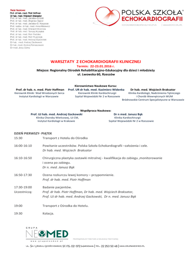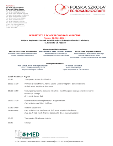 WARSZTATY Z ECHOKARDIOGRAFII KLINICZNEJ Termin: 22-23.01.2016 r. Miejsce: Regionalny Ośrodek Rehabilitacyjno-Edukacyjny dla dzieci i młodzieży ul. Lwowska 60, Rzeszów Prof. dr hab. n. med. Piotr Hoffman Kierownik Kliniki Wad Wrodzonych Serca Instytut Kardiologii w Warszawie Kierownictwo Naukowe Kursu: Prof. UR dr hab. med. Kazimierz Widenka Kierownik Kliniki Kardiochirurgii Szpital Wojewódzki Nr 2 w Rzeszowie Dr hab. med. Wojciech Braksator Klinika Kardiologii, Nadciśnienia Tętniczego i Chorób Wewnętrznych WUM Bródnowskie Centrum Specjalistyczne w Warszawie Współpraca Naukowa: Prof. UJ hab. med. Andrzej Gackowski Dr n med. Janusz Bąk Klinika Choroby Wieńcowej, UJ CM, Instytut Kardiologii w Krakowie Klinika Kardiochirurgii Szpital Wojewódzki Nr 2 w Rzeszowie DZIEŃ PIERWSZY- PIĄTEK 15:30 Transport z Hotelu do Ośrodka 16:00-16:10 Powitanie uczestników. Polska Szkoła Echokardiografii –założenia i cele. Dr hab. med. Wojciech Braksator 16:10-16:50 Chirurgiczna plastyka zastawki mitralnej - kwalifikacja do zabiegu ,monitorowanie i ocena po zabiegu. Dr n. med. Janusz Bąk 16:50-17:30 Ocena rozkurczu lewej komory – przypomnienie. Prof. dr hab. med. Piotr Hoffman 17:30-19:00 Uczestniczą: Badanie pacjentów. Prof. dr hab. Piotr Hoffman, Dr hab. med. Wojciech Braksator, Prof. UJ dr hab. med. Andrzej Gackowski, Dr n. med. Janusz Bąk 19:00 Transport z Ośrodka do Hotelu. 19:30 Kolacja. DZIEŃ DRUGI –SOBOTA 8:30 Wymeldowanie z Hotelu i transport do Ośrodka. 9:00-9:30 Transmisja z sali operacyjnej: Ocena echokardiograficzna TEE pacjenta przed naprawą zastawki mitralnej Prof. UR dr hab. med. Kazimierz Widenka 9:30-10:10 Echokardiografia w interwencjach strukturalnych Prof. UJ hab. med. Andrzej Gackowski 10:10-10:50 Transmisja z sali operacyjnej: Rzeczywista ocena wady przez kardiochirurga, naprawa zastawki Prof. UR dr hab. med. Kazimierz Widenka 10:50-11:20 Przerwa kawowa 11:20-12:00 Pooperacyjna ocena echokardiograficzna pacjenta po naprawie zastawki mitralnej 12:00-14:00 Uczestniczą: Badanie pacjentów. Prof. dr hab. Piotr Hoffman, Dr hab. med. Wojciech Braksator, Prof. UJ hab. med. Andrzej Gackowski, Dr n. med. Janusz Bąk 14:00-15:00 15:00-15:50 Lunch Serce sportowca - nowe wytyczne EACVI- rola echokardiografii Dr hab. med. Wojciech Braksator 15:50-16:00 Podsumowanie i zakończenie warsztatu.