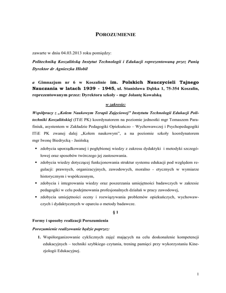 POROZUMIENIE zawarte w dniu 04.03.2013 roku pomiędzy: Politechniką Koszalińską Instytut Technologii i Edukacji reprezentowaną przez Panią Dyrektor dr Agnieszka Hłobił a Gimnazjum nr 6 w Koszalinie im. Polskich Nauczycieli Tajnego Nauczania w latach 1939 - 1945, ul. Stanisława Dąbka 1, 75-354 Koszalin, reprezentowanym przez: Dyrektora szkoły - mgr Jolantę Kowalską w zakresie: Współpracy z „Kołem Naukowym Terapii Zajęciowej” Instytutu Technologii Edukacji Politechniki Koszalińskiej (ITiE PK) koordynatorem na poziomie jednostki mgr Tomaszem Parafiniuk, asystentem w Zakładzie Pedagogiki Opiekuńczo – Wychowawczej i Psychopedagogiki ITiE PK zwanej dalej „Kołem naukowym”, a na poziomie szkoły koordynatorem mgr Iwonę Biedrycką - Jasińską zdobycia uporządkowanej i pogłębionej wiedzy z zakresu dydaktyki i metodyki szczegółowej oraz sposobów twórczego jej zastosowania. zdobycia wiedzy dotyczącej funkcjonowania struktur systemu edukacji pod względem regulacji: prawnych, organizacyjnych, zawodowych, moralno - etycznych w wymiarze historycznym i współczesnym, zdobycia i integrowania wiedzy oraz poszerzania umiejętności badawczych w zakresie pedagogiki w celu podejmowania profesjonalnych działań w pracy zawodowej, zdobycia umiejętności oceny i rozwiązywania problemów opiekuńczych, wychowawczych i dydaktycznych w oparciu o metody badawcze. §1 Formy i sposoby realizacji Porozumienia Porozumienie realizowanie będzie poprzez: 1. Współorganizowanie cyklicznych zajęć mających na celu doskonalenie kompetencji edukacyjnych – techniki szybkiego czytania, trening pamięci przy wykorzystaniu Kinezjologii Edukacyjnej. 1 2. Współorganizowanie cyklicznych zajęć z zakresu mediacji rówieśniczych – zajęcia prowadzone przez profesjonalnych mediatorów; komunikacji interpersonalnej. 3. Organizację i realizację praktyk dla tych studentów kierunków pedagogika którzy swym zaangażowaniem i zainteresowaniem edukacją wyróżniają się w sposób szczególny (do 5 praktyk w roku, przy współpracy z kołem naukowym Terapia Zajęciowa i kierownikiem praktyk ITiE PK). 4. Program, zasady organizacji praktyk studenckich realizowane będzie na podstawie osobnych umów, porozumień zawieranych dla każdej praktyki indywidualnie. 2