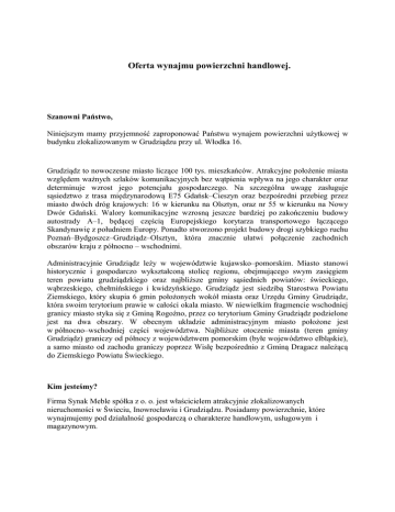 Oferta wynajmu powierzchni handlowej. Szanowni Państwo, Niniejszym mamy przyjemność zaproponować Państwu wynajem powierzchni użytkowej w budynku zlokalizowanym w Grudziądzu przy ul. Włodka 16. Grudziądz to nowoczesne miasto liczące 100 tys. mieszkańców. Atrakcyjne położenie miasta względem ważnych szlaków komunikacyjnych bez wątpienia wpływa na jego charakter oraz determinuje wzrost jego potencjału gospodarczego. Na szczególna uwagę zasługuje sąsiedztwo z trasa międzynarodową E75 Gdańsk–Cieszyn oraz bezpośredni przebieg przez miasto dwóch dróg krajowych: 16 w kierunku na Olsztyn, oraz nr 55 w kierunku na Nowy Dwór Gdański. Walory komunikacyjne wzrosną jeszcze bardziej po zakończeniu budowy autostrady A–1, będącej częścią Europejskiego korytarza transportowego łączącego Skandynawię z południem Europy. Ponadto stworzono projekt budowy drogi szybkiego ruchu Poznań–Bydgoszcz–Grudziądz–Olsztyn, która znacznie ułatwi połączenie zachodnich obszarów kraju z północno – wschodnimi. Administracyjnie Grudziądz leży w województwie kujawsko–pomorskim. Miasto stanowi historycznie i gospodarczo wykształconą stolicę regionu, obejmującego swym zasięgiem teren powiatu grudziądzkiego oraz najbliższe gminy sąsiednich powiatów: świeckiego, wąbrzeskiego, chełmińskiego i kwidzyńskiego. Grudziądz jest siedzibą Starostwa Powiatu Ziemskiego, który skupia 6 gmin położonych wokół miasta oraz Urzędu Gminy Grudziądz, która swoim terytorium prawie w całości okala miasto. W niewielkim fragmencie wschodniej granicy miasto styka się z Gminą Rogoźno, przez co terytorium Gminy Grudziądz podzielone jest na dwa obszary. W obecnym układzie administracyjnym miasto położone jest w północno–wschodniej części województwa. Najbliższe otoczenie miasta (teren gminy Grudziądz) graniczy od północy z województwem pomorskim (byłe województwo elbląskie), a samo miasto od zachodu graniczy poprzez Wisłę bezpośrednio z Gminą Dragacz należącą do Ziemskiego Powiatu Świeckiego. Kim jesteśmy? Firma Synak Meble spółka z o. o. jest właścicielem atrakcyjnie zlokalizowanych nieruchomości w Świeciu, Inowrocławiu i Grudziądzu. Posiadamy powierzchnie, które wynajmujemy pod działalność gospodarczą o charakterze handlowym, usługowym i magazynowym. Jak się z nami skontaktować? „SYNAK MEBLE” spółka z o.o. 86-100 Świecie Ul. Wojska Polskiego 72 [email protected] http://synak.com.pl Tel. (0-52) 33 33 410 Fax (0-52) 33 33 425 Tel. Komórkowy 664 027 429 Lokalizacja i komunikacja nieruchomości Nieruchomość, w której zlokalizowana jest powierzchnia, będąca przedmiotem oferty położona jest przy ulicy Włodka, w południowej części kwartału, pomiędzy ulicami Chełmińska, Włodka i trasą średnicową oraz trasą kolejową, w obszarze tzw. „Śródmieścia Zewnętrznego” stanowiącego otoczkę zespołu staromiejskiego. Obszar ten stanowi tereny zabudowy mieszczańskiej o znacznej wartości architektonicznej i zawiera elementy dawnej zabudowy przedmiejskiej. Zabudowa mieszkalna uzupełniona została o szereg inwestycji o charakterze publicznym (teren dawnego Przedmieścia Kwidzyńskiego) oraz komercyjnym. Położenie nieruchomości, w której znajduje się lokal, będący przedmiotem oferty, to ścisłe centrum miasta. Obiekt zlokalizowany jest przy ulicy Józefa Włodka – jedynej ulicy, która komunikuje całe miasto. Jest to także miejsce jedynego przejazdu łączącego trasę Poznań–Olsztyn z wylotem na most przez Wisłę i wyjazdem na trasę A1 Gdańsk - Katowice. Od strony południowej nieruchomość graniczy z nowo wybudowanym odcinkiem trasy średnicowej. Trasa średnicowa łączy południową część miasta Grudziądza z północną i ma za zadanie odciążyć miasto od ruchu tranzytowego. Jest ona częścią węzła komunikacyjnego dla drogi krajowej numer 55 (Toruń, Łódź – Kwidzyn, Malbork) oraz drogi krajowej numer 16 (Dolna Grupa–Olsztyn, Kaliningrad). Cały projekt trasy średnicowej zakłada, iż początkiem trasy średnicowej będzie węzeł „Grudziądz” budowanej autostrady A-1. Końcem będzie skrzyżowanie „Olsztyn” z ulicami Paderewskiego (droga krajowa nr 16) i Kwidzyńska (droga krajowa nr 55). Ruch pieszy w tym rejonie występuje w dużym natężeniu, w odległości kilkunastu metrów od przedmiotowej nieruchomości zlokalizowano przystanek komunikacji miejskiej PKS dzięki któremu potencjalni klienci mają dogodny dojazd. W mentalności mieszkańców Grudziądza jest to miejsce, gdzie występuje duże skupisko renomowanych sklepów. W promieniu 200 metrów znajdują się tu takie podmioty jak Mc Donald, Salon meblowy Black Red White, stacja paliw Shell, stacja paliw Neste, salon RTV Euro AGD, delikatesy Piotr i Paweł, sklep Terry oferujący towary wyposażenia wnętrz, Open Direct, Chińskie Centrum Handlowe, Salon Media Ekspert, sklep Neonet branży RTV. Obok znajduje się Centrum Handlowe „Stara Kuźnia” a w nim Lidl i Monari oraz inne. Wokół tych podmiotów zadbano o dużą ilość miejsc parkingowych dla klientów, co jest ważnym atutem tego miejsca. Wokół budynku grunt został utwardzony kostką, jest wykorzystywany jako parking. Szczegóły dotyczące lokalu Powierzchnia najmu 1183,9 m ². Powierzchnia najmu składa się z 1007,9 m2 powierzchni ekspozycyjnej, 121,7 m2 powierzchni magazynowej, 54,3 m2 powierzchni socjalnej i biurowej. Dodatkowo istnieje możliwość wynajęcia pomieszczeń magazynowych w postaci dwóch lokali w budynku położonym w odległości 20 metrów, o łącznej powierzchni 565 m2 wyposażonych w instalację elektryczną, wodną, kanalizacyjną, powierzchnie socjalne oraz rampę rozładunkową. Standard polecanej powierzchni: -podłoga gres, -ściany tynkowane malowane na kolor beżowy, -sufit podwieszany kasetonowy, - instalacje - oświetleniowa, elektryczna, wodna, kanalizacyjna, -wentylacja, -ogrzewanie nagrzewnica