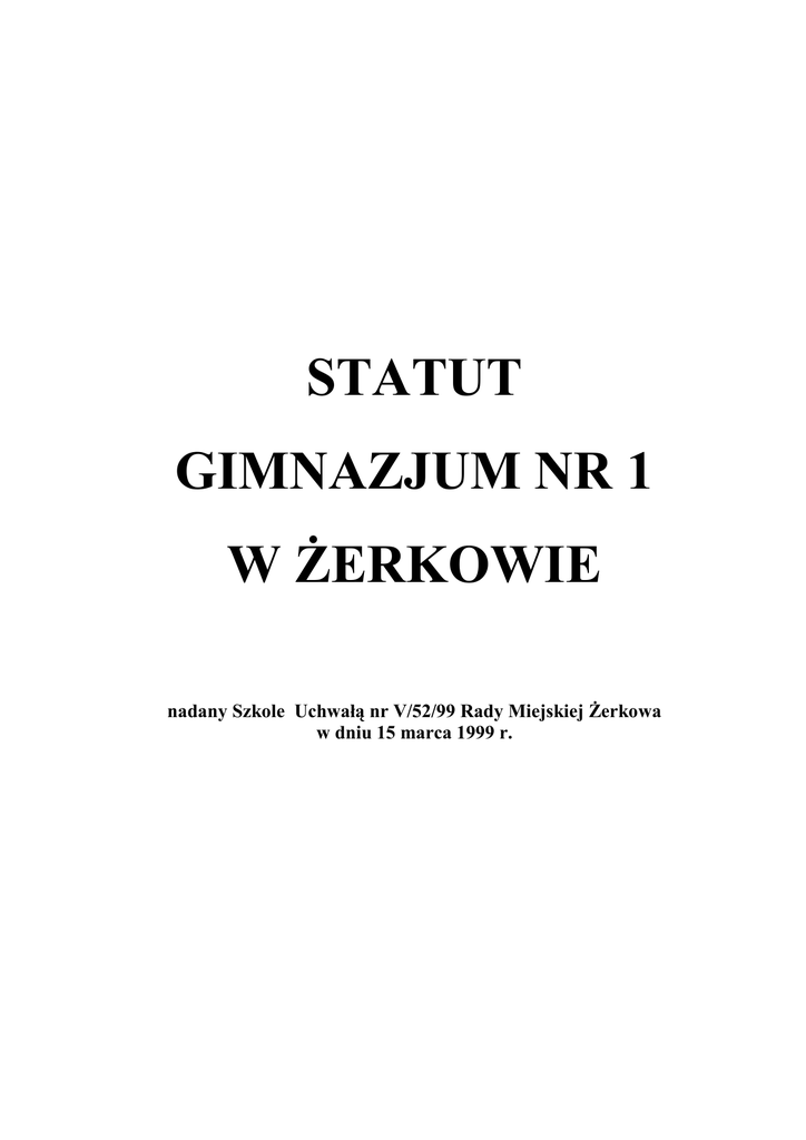 STATUT GIMNAZJUM NR 1 W ŻERKOWIE nadany Szkole Uchwałą nr V/52/99 Rady Miejskiej Żerkowa w dniu 15 marca 1999 r. -2- Zmiany w Statucie dokonywane w następujących terminach: 25.11.1999 r. 27.04.2000 r. 30.06.2000 r. 29.08.2001 r. 20.03.2002 r. 13.02.2003 r. 28.08.2003 r. 22.08.2004 r. 12.10.2004 r. 02.02.2006 r. 31.08.2006 r. 05.10.2006 r. 17.05.2007 r. 30.08.2007 r. 07.10.2008 r. 17.02.2011 r. 30.08.2011 r. Uchwałami Rady Pedagogicznej -3- NAZWA SZKOŁY § 1. Nazwa szkoły zawiera określenie: 1) Typu szkoły: gimnazjum 2) Numeru porządkowego szkoły: 1 3) Siedziby: Siedzibą gimnazjum jest budynek położony w Żerkowie ul. Cmentarna 10 § 2. Ustalona nazwa jest używana przez szkołę w brzmieniu tj. : „Gimnazjum nr 1 im. Zbigniewa Herberta w Żerkowie” 1) Na pieczęci używana jest nazwa: „Gimnazjum nr 1 im. Zbigniewa Herberta, ul. Cmentarna 10, 63-210 Żerków tel./fax 62 740-38-95, NIP 617-17-24-311, R: 25-09-39-427 na stemplu: Gimnazjum Nr 1 w Żerkowie. § 3. Gimnazjum nosi imię: Zbigniewa Herberta. § 4. Szkoła posiada sztandar oraz hymn Szkoły. INNE INFORMACJE O GIMNAZJUM § 5. Organem prowadzącym gimnazjum jest Gmina Żerków. 1) Cykl kształcenia trwa 3 lata 2) Czas rozpoczynania i kończenia zajęć dydaktycznych oraz przerw i ferii określa Minister Edukacji Narodowej w drodze rozporządzenia w sprawie organizacji roku szkolnego. CELE I ZADANIA GIMNAZJUM § 6. Gimnazjum realizuje cele i zadania określone w ustawie o systemie oświaty z dnia 07.09.1991 r. oraz w przepisach wykonawczych wydanych na jej podstawie, a w szczególności: 1) Umożliwia zdobycie wiedzy i umiejętności niezbędnych do uzyskania świadectwa ukończenia gimnazjum poprzez: • atrakcyjny i nowatorski proces nauczania, • udział w warsztatach językowych, 2) Umożliwia absolwentom dokonanie świadomego wyboru dalszego kierunku kształcenia lub wykonywania wybranego zawodu poprzez: • organizowanie zajęć z pracownikami biura pracy, firm marketingowych, • poradnictwo psychologiczno-pedagogiczne, • rozwijanie zainteresowań na zajęciach pozalekcyjnych, -43) Kształtuje środowisko wychowawcze sprzyjające realizowaniu celów i zasad określonych w ustawie, stosownie do warunków gimnazjum i wieku ucznia poprzez: • zapewnienie odpowiedniej bazy dla uczniów gimnazjum, • systematyczne diagnozowanie i monitorowanie zachowań uczniów, • realizowanie programu wychowawczego gimnazjum, 4) Sprawuje opiekę nad uczniami odpowiednio do ich potrzeb poprzez: • zorganizowanie zajęć świetlicowych, • umożliwienie spożywania posiłków, • system zapomóg i stypendiów, • złamanie barier architektonicznych, • prowadzenie zajęć dydaktyczno-wychowawczych, • prowadzenie zajęć z gimnastyki korekcyjnej, • prowadzenie zajęć logopedycznych. Zajęcia, o których mowa wyżej, prowadzone są na podstawie diagnozy dokonanej przez Poradnię Psychologiczno-Pedagogiczną w Jarocinie oraz miarę posiadanych środków finansowych. ORGANY GIMNAZJUM § 7. 1. Organami gimnazjum są: 1) Dyrektor gimnazjum 2) Rada Pedagogiczna 3) Rada Rodziców 4) Samorząd Uczniowski 2. Kompetencje poszczególnych organów funkcjonujących w gimnazjum: Dyrektor gimnazjum: • kieruje bieżącą działalnością dydaktyczno-wychowawczą i opiekuńczą gimnazjum, • sprawuje nadzór pedagogiczny nad działalnością nauczycieli i wychowawców, • przewodniczy Radzie Pedagogicznej, • realizuje uchwały Rady Pedagogicznej, jeżeli są zgodne z prawem oświatowym; niezgodne zaś wstrzymuje i powiadamia o tym fakcie organ prowadzący, • powierza stanowisko wicedyrektora i odwołuje z niego po zasięgnięciu opinii Burmistrza Miasta i Gminy oraz rady pedagogicznej, -5• zatrudnia i zwalnia nauczycieli i pracowników niepedagogicznych zgodnie z odrębnymi przepisami, w uzgodnieniu z Burmistrzem Miasta i Gminy, • przyznaje nagrody i wymierza kary pracownikom gimnazjum, • dysponuje środkami finansowymi, • opracowuje arkusz organizacyjny, • dba o powierzone mienie, • wydaje polecenia służbowe, • dokonuje oceny pracy nauczycieli, • mianuje nauczycieli, • realizuje pozostałe zadania wynikające z ustawy „Karta Nauczyciela”, • kontroluje spełnianie obowiązku szkolnego i wydaje decyzje administracyjne w zakresie zezwolenia na realizację obowiązku szkolnego poza szkołą i przeprowadzanie egzaminu klasyfikacyjnego, • reprezentuje gimnazjum na zewnątrz, • tworzy Radę Rodziców, • współpracuje z Radą Rodziców, Radą Pedagogiczną i Samorządem Uczniowskim, • rozstrzyga sprawy sporne i konfliktowe pomiędzy organami, • przestrzega postanowień statutu w sprawie rodzaju nagród i kar stosowanych wobec uczniów, • podejmuje decyzje o zawieszeniu zajęć dydaktycznych z zachowaniem warunków określonych odrębnymi przepisami, • prowadzi dokumentację pedagogiczną zgodnie z odrębnymi przepisami. Rada Pedagogiczna: • zatwierdza plany pracy gimnazjum, • zatwierdza wyniki klasyfikacji i promocji uczniów, • podejmuje uchwały w sprawie innowacji i eksperymentów pedagogicznych, • podejmuje uchwały w sprawie skierowania ucznia do klasy przysposabiającej do zawodu, • ustala organizację doskonalenia zawodowego nauczycieli, • występuje z umotywowanym wnioskiem do organu prowadzącego o odwołanie z funkcji dyrektora lub wicedyrektora, • deleguje jednego przedstawiciela do komisji konkursowej na stanowisko dyrektora, • opiniuje tygodniowy podział godzin, -6• opiniuje projekt planu finansowego, • opiniuje propozycje dyrektora gimnazjum w sprawach przydziału stałych prac i zajęć, • wykonuje kompetencje przewidziane dla rady gimnazjum zgodnie z art. 52.2. ustawy o systemie oświaty. Rada Pedagogiczna Gimnazjum nr 1 im. Z. Herberta w Żerkowie jest kolegialnym organem szkoły w zakresie realizacji zadań dot. Kształcenia, wychowania i opieki. W skład rady wchodzą wszyscy nauczyciele zatrudnieni w gimnazjum. Rada Pedagogiczna ustala Regulami
