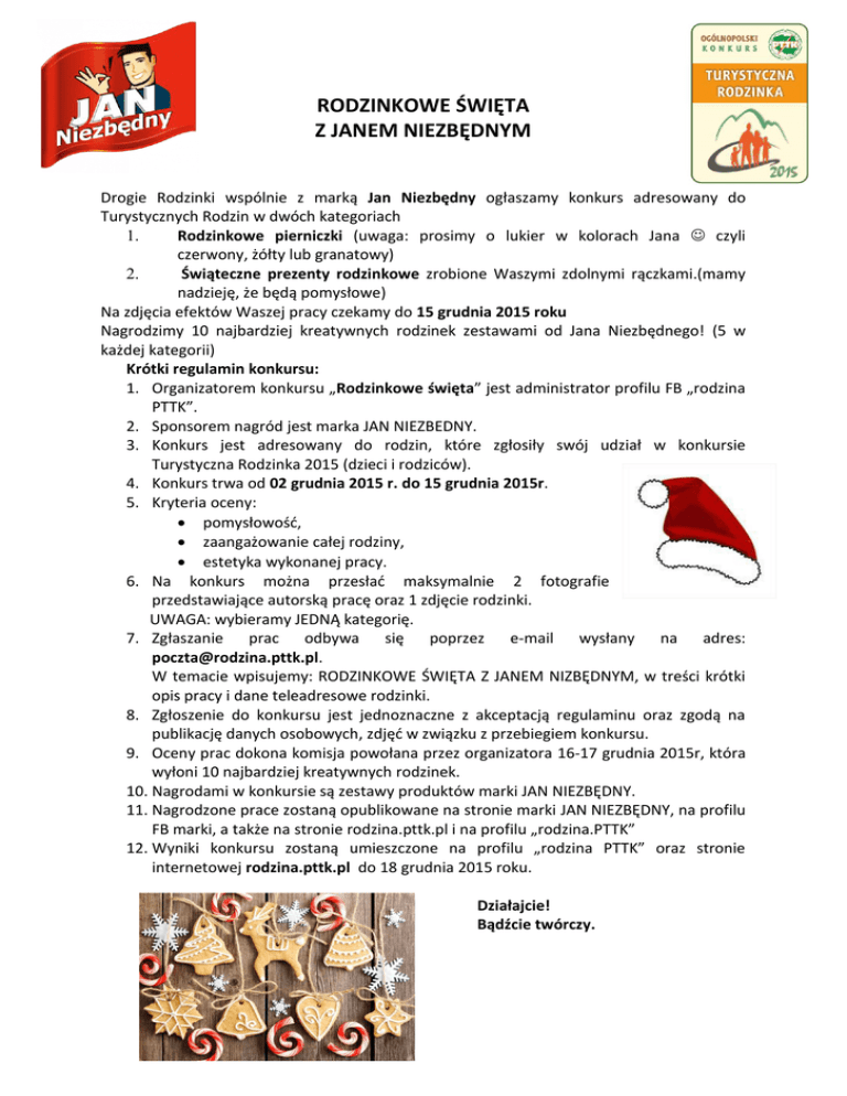 RODZINKOWE ŚWIĘTA Z JANEM NIEZBĘDNYM Drogie Rodzinki wspólnie z marką Jan Niezbędny ogłaszamy konkurs adresowany do Turystycznych Rodzin w dwóch kategoriach 1. Rodzinkowe pierniczki (uwaga: prosimy o lukier w kolorach Jana czyli czerwony, żółty lub granatowy) 2. Świąteczne prezenty rodzinkowe zrobione Waszymi zdolnymi rączkami.(mamy nadzieję, że będą pomysłowe) Na zdjęcia efektów Waszej pracy czekamy do 15 grudnia 2015 roku Nagrodzimy 10 najbardziej kreatywnych rodzinek zestawami od Jana Niezbędnego! (5 w każdej kategorii) Krótki regulamin konkursu: 1. Organizatorem konkursu „Rodzinkowe święta” jest administrator profilu FB „rodzina PTTK”. 2. Sponsorem nagród jest marka JAN NIEZBEDNY. 3. Konkurs jest adresowany do rodzin, które zgłosiły swój udział w konkursie Turystyczna Rodzinka 2015 (dzieci i rodziców). 4. Konkurs trwa od 02 grudnia 2015 r. do 15 grudnia 2015r. 5. Kryteria oceny: pomysłowość, zaangażowanie całej rodziny, estetyka wykonanej pracy. 6. Na konkurs można przesłać maksymalnie 2 fotografie przedstawiające autorską pracę oraz 1 zdjęcie rodzinki. UWAGA: wybieramy JEDNĄ kategorię. 7. Zgłaszanie prac odbywa się poprzez e-mail wysłany na adres: [email protected]. W temacie wpisujemy: RODZINKOWE ŚWIĘTA Z JANEM NIZBĘDNYM, w treści krótki opis pracy i dane teleadresowe rodzinki. 8. Zgłoszenie do konkursu jest jednoznaczne z akceptacją regulaminu oraz zgodą na publikację danych osobowych, zdjęć w związku z przebiegiem konkursu. 9. Oceny prac dokona komisja powołana przez organizatora 16-17 grudnia 2015r, która wyłoni 10 najbardziej kreatywnych rodzinek. 10. Nagrodami w konkursie są zestawy produktów marki JAN NIEZBĘDNY. 11. Nagrodzone prace zostaną opublikowane na stronie marki JAN NIEZBĘDNY, na profilu FB marki, a także na stronie rodzina.pttk.pl i na profilu „rodzina.PTTK” 12. Wyniki konkursu zostaną umieszczone na profilu „rodzina PTTK” oraz stronie internetowej rodzina.pttk.pl do 18 grudnia 2015 roku. Działajcie! Bądźcie twórczy.