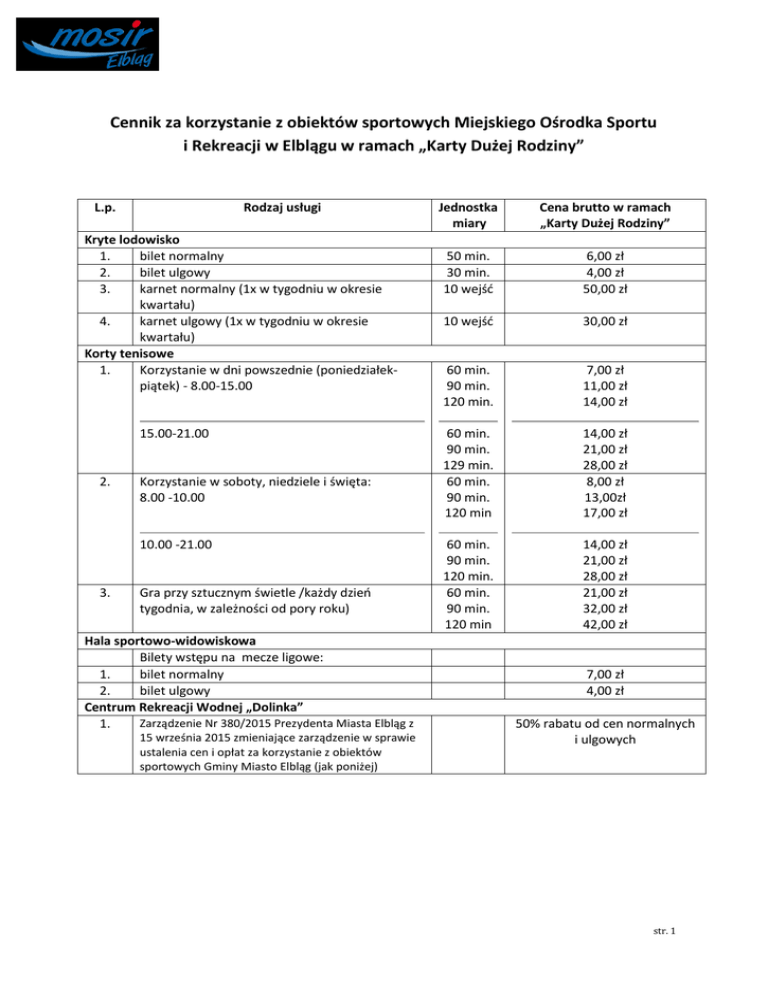 Cennik za korzystanie z obiektów sportowych Miejskiego Ośrodka Sportu i Rekreacji w Elblągu w ramach „Karty Dużej Rodziny” L.p. Rodzaj usługi Kryte lodowisko 1. bilet normalny 2. bilet ulgowy 3. karnet normalny (1x w tygodniu w okresie kwartału) 4. karnet ulgowy (1x w tygodniu w okresie kwartału) Korty tenisowe 1. Korzystanie w dni powszednie (poniedziałekpiątek) - 8.00-15.00 15.00-21.00 2. Korzystanie w soboty, niedziele i święta: 8.00 -10.00 10.00 -21.00 3. Gra przy sztucznym świetle /każdy dzień tygodnia, w zależności od pory roku) Hala sportowo-widowiskowa Bilety wstępu na mecze ligowe: 1. bilet normalny 2. bilet ulgowy Centrum Rekreacji Wodnej „Dolinka” Zarządzenie Nr 380/2015 Prezydenta Miasta Elbląg z 1. 15 września 2015 zmieniające zarządzenie w sprawie ustalenia cen i opłat za korzystanie z obiektów sportowych Gminy Miasto Elbląg (jak poniżej) Jednostka miary Cena brutto w ramach „Karty Dużej Rodziny” 50 min. 30 min. 10 wejść 6,00 zł 4,00 zł 50,00 zł 10 wejść 30,00 zł 60 min. 90 min. 120 min. 7,00 zł 11,00 zł 14,00 zł 60 min. 90 min. 129 min. 60 min. 90 min. 120 min 14,00 zł 21,00 zł 28,00 zł 8,00 zł 13,00zł 17,00 zł 60 min. 90 min. 120 min. 60 min. 90 min. 120 min 14,00 zł 21,00 zł 28,00 zł 21,00 zł 32,00 zł 42,00 zł 7,00 zł 4,00 zł 50% rabatu od cen normalnych i ulgowych str. 1 CENNIK DLA KLIENTÓW INDYWIDUALNYCH - DNI ROBOCZE 6:00 – 8:00 BILET 8:00 – 15:00 3h 1h 2h 3h dopł. 1 min. 17 22 0,1 13 19 26 0,12 39 9 12 0,07 8 12 16 0,07 24 1h 1h 2h normalny 8 0,14 11 ulgowy 5 0,09 6 rodzinny – 2+1* rodzinny – kolejne dziecko całodz dopł. 1 min. dopł. 1 min. rodzinny – 1+2* 15:00-22:00 19,0 28,5 38,0 0,20 22,0 33,0 44,0 0,22 66,00 0 0 0 0 0 0 zgodnie z 23,0 34,5 46 0,22 26,0 39,0 52,0 0,25 78,00 obowiązujący 0 0 0 0 0 m cennikiem 5,00 7,50 10,0 0,05 6,00 9,00 12,0 0,06 18,00 0 0 SOBOTY, NIEDZIELE I ŚWIĘTA 6:00 – 8:00 BILET 8:00 – 11:00 3h 1h 2h 3h dopł. 1 min. 17 22 0,1 15 23 30 0,14 45 9 12 0,07 9 14 18 0,09 27 1h 1h 2h normalny 8 0,14 11 ulgowy 5 0,09 6 rodzinny – 2+1* rodz. – kolejne dziecko całodz dopł. 1 min. dopł. 1 min. rodzinny – 1+2* 11:00 – 22:00 19,0 28,5 38,0 0,20 26,0 39,0 52,0 0,29 78,00 0 0 0 0 0 0 zgodnie z 23,0 34,5 46,0 0,22 31,0 46,5 62,0 0,29 93,00 obowiązujący 0 0 0 0 0 0 m cennikiem 5,00 7,50 10,0 0,05 7,00 10,5 14,0 0,07 21,00 0 0 0 Do każdego wejścia dodawane jest 10 minut gratis – czas na przebranie. * - pierwsza liczba w tabeli oznacza liczbę osób dorosłych Do korzystania z biletów ulgowych uprawnieni są: dzieci i młodzież ucząca się do 25 roku życia po okazaniu ważnej legitymacji szkolnej lub studenckiej emeryci i renciści powyżej 60 roku życia, po okazaniu legitymacji emeryta lub rencisty kombatanci i weterani wojenni po okazaniu dokumentów uprawniających osoby powyżej 70 roku życia po okazaniu dowodu tożsamości osoby niepełnosprawne po okazaniu orzeczenia o niepełnosprawności wraz z dokumentem tożsamości opiekunowie osób niepełnosprawnych wymagających opieki (jeden opiekun na jedną osobę niepełnosprawną) zasłużony honorowy dawca krwi po okazaniu legitymacji wraz z dowodem osobistym czynni ratownicy WOPR po okazaniu aktualnych uprawnień Z biletów rodzinnych mogą korzystać opiekunowie wraz z dziećmi do lat 14. Dzieci do 3 lat wstęp wolny. Elbląska Karta Dużej Rodziny – 50% rabatu od cen biletów normalnych i ulgowych. Promocje nie łączą się. W przypadku zgubienia lub zniszczenia paska elektronicznego klient ponosi koszt w wysokości 50zł. Dyrektor MOSiR /-/ Marek Wnuk str. 2