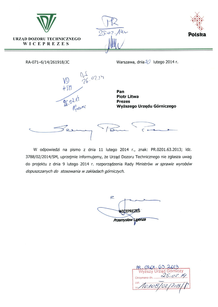 Polska U R Z Ą D DOZORU T E C H N I C Z N E G O W I C E P R E Z E S RA-071-6/14/261918/JC Warszawa, d n i a ^ / lutego 2014 r. V9 Pan Piotr Litwa Prezes Wyższego Urzędu Górniczego s_s— W odpowiedzi na pismo z dnia 11 lutego 2014 r., znak: PR.0201.63.2013; Idz. 3788/02/2014/SM, uprzejmie informujemy, że Urząd Dozoru Technicznego nie zgłasza uwag do projektu z dnia 9 lutego 2014 r. rozporządzenia Rady Ministrów w sprawie wyrobów dopuszczanych do stosowania w zakładach górniczych. PP, <7l/M.fi.?).fliM?> Wyższy Urząd Górniczy Otrzymano dn &&(.&..?.....&...