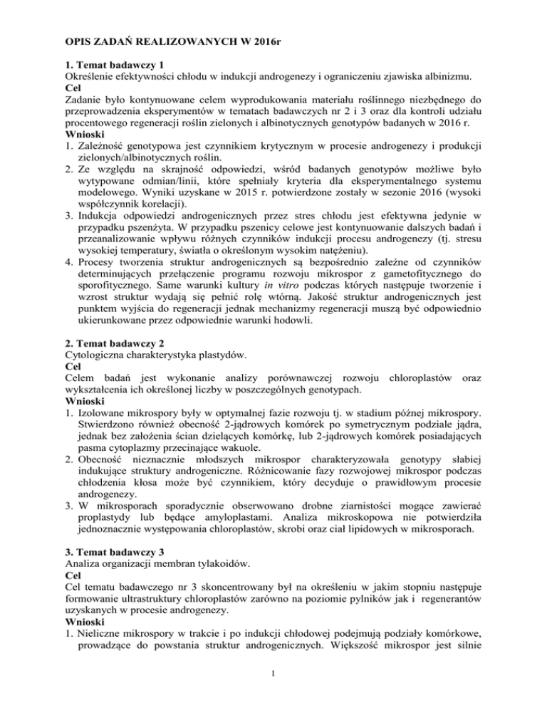 OPIS ZADAŃ REALIZOWANYCH W 2016r 1. Temat badawczy 1 Określenie efektywności chłodu w indukcji androgenezy i ograniczeniu zjawiska albinizmu. Cel Zadanie było kontynuowane celem wyprodukowania materiału roślinnego niezbędnego do przeprowadzenia eksperymentów w tematach badawczych nr 2 i 3 oraz dla kontroli udziału procentowego regeneracji roślin zielonych i albinotycznych genotypów badanych w 2016 r. Wnioski 1. Zależność genotypowa jest czynnikiem krytycznym w procesie androgenezy i produkcji zielonych/albinotycznych roślin. 2. Ze względu na skrajność odpowiedzi, wśród badanych genotypów możliwe było wytypowane odmian/linii, które spełniały kryteria dla eksperymentalnego systemu modelowego. Wyniki uzyskane w 2015 r. potwierdzone zostały w sezonie 2016 (wysoki współczynnik korelacji). 3. Indukcja odpowiedzi androgenicznych przez stres chłodu jest efektywna jedynie w przypadku pszenżyta. W przypadku pszenicy celowe jest kontynuowanie dalszych badań i przeanalizowanie wpływu różnych czynników indukcji procesu androgenezy (tj. stresu wysokiej temperatury, światła o określonym wysokim natężeniu). 4. Procesy tworzenia struktur androgenicznych są bezpośrednio zależne od czynników determinujących przełączenie programu rozwoju mikrospor z gametofitycznego do sporofitycznego. Same warunki kultury in vitro podczas których następuje tworzenie i wzrost struktur wydają się pełnić rolę wtórną. Jakość struktur androgenicznych jest punktem wyjścia do regeneracji jednak mechanizmy regeneracji muszą być odpowiednio ukierunkowane przez odpowiednie warunki hodowli. 2. Temat badawczy 2 Cytologiczna charakterystyka plastydów. Cel Celem badań jest wykonanie analizy porównawczej rozwoju chloroplastów oraz wykształcenia ich określonej liczby w poszczególnych genotypach. Wnioski 1. Izolowane mikrospory były w optymalnej fazie rozwoju tj. w stadium późnej mikrospory. Stwierdzono również obecność 2-jądrowych komórek po symetrycznym podziale jądra, jednak bez założenia ścian dzielących komórkę, lub 2-jądrowych komórek posiadających pasma cytoplazmy przecinające wakuole. 2. Obecność nieznacznie młodszych mikrospor charakteryzowała genotypy słabiej indukujące struktury androgeniczne. Różnicowanie fazy rozwojowej mikrospor podczas chłodzenia kłosa może być czynnikiem, który decyduje o prawidłowym procesie androgenezy. 3. W mikrosporach sporadycznie obserwowano drobne ziarnistości mogące zawierać proplastydy lub będące amyloplastami. Analiza mikroskopowa nie potwierdziła jednoznacznie występowania chloroplastów, skrobi oraz ciał lipidowych w mikrosporach. 3. Temat badawczy 3 Analiza organizacji membran tylakoidów. Cel Cel tematu badawczego nr 3 skoncentrowany był na określeniu w jakim stopniu następuje formowanie ultrastruktury chloroplastów zarówno na poziomie pylników jak i regenerantów uzyskanych w procesie androgenezy. Wnioski 1. Nieliczne mikrospory w trakcie i po indukcji chłodowej podejmują podziały komórkowe, prowadzące do powstania struktur androgenicznych. Większość mikrospor jest silnie 1 zwakuolizowana i indukuje PCD. Liczniejsze podziały zachodzą w pylnikach genotypów z większym potencjałem do indukcji androgenezy. 2. W mikrosporach pszenżyta występują prowakuole gromadzące materiały zapasowe, a w pszenicy wakuole lityczne, co tłumaczyć może większą degenerację mikrospor pszenicy i mniejszą indukcję struktur androgenicznych. Obecność licznych oleosomów stwierdzono w mikrosporach pszenżyta, natomiast ziarna skrobi w mikrosporach pszenicy. Mikrospory zawierają proste strukturalnie proplastydy bez wewnętrznych membran i centralnego obszaru nukleiodopodobnego, lub amyloplasty o różnym stopniu wykształcenia ziarn skrobi. 3. Liście roślin albinotycznych są słabiej rozwinięte, a ich komórki zawierają sferyczne proplastydy bez wewnętrznych membran. Na problemy z formowaniem membran wewnętrznych i różnicowaniem proplastydów wskazuje obecność: ciał prolamemarnych (jak w etioplastach), pęcherzyków (analogiczne jak w plastydach przedgranowych), plastoglobuli na terenie stromy (są raczej elementami charakterystycznymi dla chloroplastów i chromoplastów globularnych), napęczniałych tylakoidów i talerzykowatych proplastydów. 4. Rośliny zielone niezależnie od genotypu miały prawidłowo wykształcony chloroplastowy system membran wewnętrznych. Jednak pszenica charakteryzowała się większym zróżnicowaniem budowy chloroplastów, w tym bardzo skomplikowanym systemem membran tylakoidowych. Dodatkowy temat badawczy Określenie wpływu światła na proces androgenezy. Cel Określenie wpływu światła białego o wysokim natężeniu na efektywność przeprogramowania rozwoju gametofitycznego mikrospor w kierunku sporofitycznym. Określenie wpływu krótkotrwałego działania światła białego i monochromatycznego czerwonego i niebieskiego o wysokim natężeniu na indukcję regeneracji struktur androgenicznych i ograniczenie zjawiska albinizmu. Wnioski 1. Obecność lub brak liścia flagowego na pędach, które poddane są chłodowej indukcji nie ma wpływu na efektywność formowania struktur androgenicznych oraz na sumaryczną liczbę regenerantów. Przesuwa natomiast proporcje regenerowanych roślin albinotycznych vs zielone (wpływa na formowanie się prawidłowych struktur chloroplastowych). 2. Pomimo braku znacznych różnic w całkowitej regeneracji, brak liścia flagowego wydaje się mieć znaczenie na sposób formowania centrów regeneracji w kalusie. Bardziej zaawansowane struktury mogą determinować powstawanie zielonych regeneratów. 3. Indukcja mikrospor z udziałem światła białego o wysokim natężeniu i skrócony okres chłodzenia wpływa na zwiększenie żywotności mikrospor w pylnikach, ale ogranicza sporofityczny rozwój mikrospor na korzyść rozwoju gametofitycznego. 4. Zastosowanie światła LED białego i czerwonego o wys