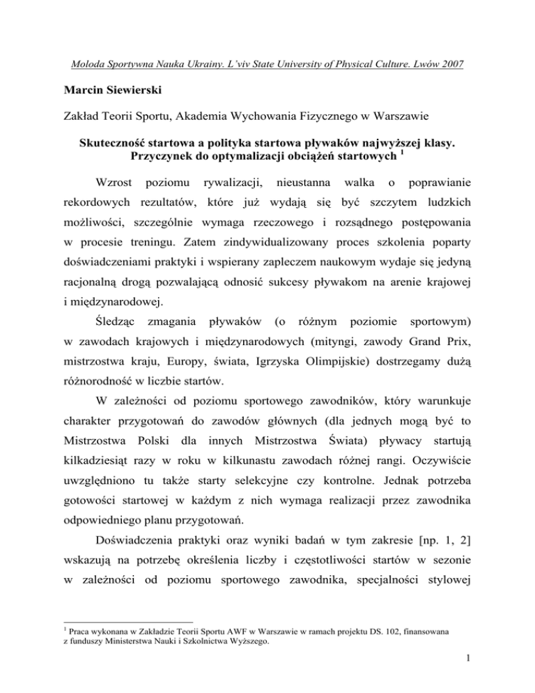 Moloda Sportywna Nauka Ukrainy. L’viv State University of Physical Culture. Lwów 2007 Marcin Siewierski Zakład Teorii Sportu, Akademia Wychowania Fizycznego w Warszawie Skuteczność startowa a polityka startowa pływaków najwyższej klasy. Przyczynek do optymalizacji obciążeń startowych 1 Wzrost poziomu rywalizacji, nieustanna walka o poprawianie rekordowych rezultatów, które już wydają się być szczytem ludzkich możliwości, szczególnie wymaga rzeczowego i rozsądnego postępowania w procesie treningu. Zatem zindywidualizowany proces szkolenia poparty doświadczeniami praktyki i wspierany zapleczem naukowym wydaje się jedyną racjonalną drogą pozwalającą odnosić sukcesy pływakom na arenie krajowej i międzynarodowej. Śledząc zmagania pływaków (o różnym poziomie sportowym) w zawodach krajowych i międzynarodowych (mityngi, zawody Grand Prix, mistrzostwa kraju, Europy, świata, Igrzyska Olimpijskie) dostrzegamy dużą różnorodność w liczbie startów. W zależności od poziomu sportowego zawodników, który warunkuje charakter przygotowań do zawodów głównych (dla jednych mogą być to Mistrzostwa Polski dla innych Mistrzostwa Świata) pływacy startują kilkadziesiąt razy w roku w kilkunastu zawodach różnej rangi. Oczywiście uwzględniono tu także starty selekcyjne czy kontrolne. Jednak potrzeba gotowości startowej w każdym z nich wymaga realizacji przez zawodnika odpowiedniego planu przygotowań. Doświadczenia praktyki oraz wyniki badań w tym zakresie [np. 1, 2] wskazują na potrzebę określenia liczby i częstotliwości startów w sezonie w zależności od poziomu sportowego zawodnika, specjalności stylowej 1 Praca wykonana w Zakładzie Teorii Sportu AWF w Warszawie w ramach projektu DS. 102, finansowana z funduszy Ministerstwa Nauki i Szkolnictwa Wyższego. 1 i dystansowej, warunkując tym samym kierunek i charakter przygotowań do startów w zawodach głównych. Makrocykl treningowy w pływaniu, obejmuje dwa lub trzy okresy przygotowawcze i startowe oraz jeden okres przejściowy, który występuje po zawodach głównych międzynarodowych, odbywających się w okresie letnim. Po Letnich Mistrzostwach Polski, zawodnicy, którzy uzyskali minimum kwalifikacyjne uczestniczą w przygotowaniach do zawodów międzynarodowych (ME lub MŚ – długi basen) w bezpośrednim przygotowaniu startowym (BPS). Pływacy wysokiej klasy (kadra narodowa) startują w dwóch głównych zawodach krajowych tj. Zimowych Mistrzostwach Polski (ZMP) i Letnich Mistrzostwach Polski (LMP). Pierwsze z nich odbywają się na przełomie listopada i grudnia a termin drugich przypada z reguły na maj-czerwiec. Pływacy, którzy uzyskają w w/w zawodach minima kwalifikacyjne (określone przez polski Związek Pływacki) startują w zawodach międzynarodowych (w latach parzystych - grudzień ME – 25 m, ME, IO - 50 m lipiec-sierpień, w latach nieparzystych MŚ – 50 m lipiecsierpień). Należy dodać, iż w pływaniu od 1993 roku co dwa lata odbywają się również MŚ na krótkim basenie (z reguły w okresie marzec-kwiecień lub październik-grudzień). Badani zawodnicy Polskiej Kadry Narodowej z uwagi na kierunek przygotowań do imprezy głównej (zawody w okresie letnim na długim basenie) oraz na odpowiednio skonstruowany w tym celu kalendarz startów nie uczestniczą w MŚ na krótkim basenie. W makrocyklu rocznym pomiędzy zawodami głównymi pływacy realizują plan przygotowań jednocześnie startując średnio co dwa tygodnie w zawodach różnej rangi, rozgrywanych w kraju i zagranicą (zawody serii Grand Prix, Puchary Świata czy mitingi). Starty w tym czasie z reguły mają charakter treningowy i kontrolny dostarczając trenerom wielu informacji 2 o aktualnym stanie przygotowania zawodnika oraz dynamice i kierunku zmian jego dyspozycji startowych. Trener znając optymalną liczbę startów (na długim i krótkim basenie) dla poszczególnych zawodników (w zależności od ich poziomu sportowego), opracowując roczny plan szkolenia może trafniej opracować kalendarz zawodów uwzględniając starty zasadnicze, selekcyjne czy kontrolne. Takie informacje zgromadzone na przykładzie obecnie najlepszych polskich pływaków wzbogacają wiedzę specjalistyczną i mogą posłużyć w opracowywaniu trafniejszych przesłanek optymalizacyjnych w zakresie prowadzenia polityki startowej. Opierając się na powyższych założeniach dokonano próby określenia skuteczności startowej, liczby i częstotliwości startów w grupie pływaków najwyższej klasy na podstawie ustanowionych rekordów i osiągnięć w zawodach krajowych i międzynarodowych w sezonie 2005/2006. Materiał i metody badań Badaniami objęto 20-osobową grupę pływaków (6 kobiet i 14-tu mężczyzn), prezentujących wysoki poziom sportowy. Posiadają oni pierwszą klasę sportową (I), mistrzowską (M) oraz mistrzowską międzynarodową (MM). Wśród nich są finaliści i medaliści igrzysk olimpijskich, mistrzostw świata, Europy, wielokrotni rekordziści i medaliści mistrzostw Polski. U każdego z badanych określono liczbę startów eliminacyjnych, półfinałowych i finałowych w zawodach krajowych i międzynarodowych w sezonie 2005/2006. Zbadano skuteczność startową wg dwóch kryteriów. Pierwszym za nich był wynik sportowy. W tym celu określono ogólną liczbę rekordów sezonu uzyskanych przez badanych w zawodach krajowych i międzynarodowych na krótkim i długim basenie. Następnie wyznaczono % najlepszych rezultatów w sezonie (rekordów sezonu) uzyskanych podczas zawodów głównych. Drugim kryterium oceny skuteczności startowej pływaków był poziom osiągnięć 3 sportowych. Określono więc % zajmowanych miejsc na podium w startach finałowych podczas zawodów krajowych i międzynarodowych na krótkim i długim basenie. Wyniki Wyniki sportowe w obrębie poszczególnych cykli dostarczają trenerowi cennych informacji szkoleniowych. Umożliwiają ocenę efektywności realizowanych zadań 