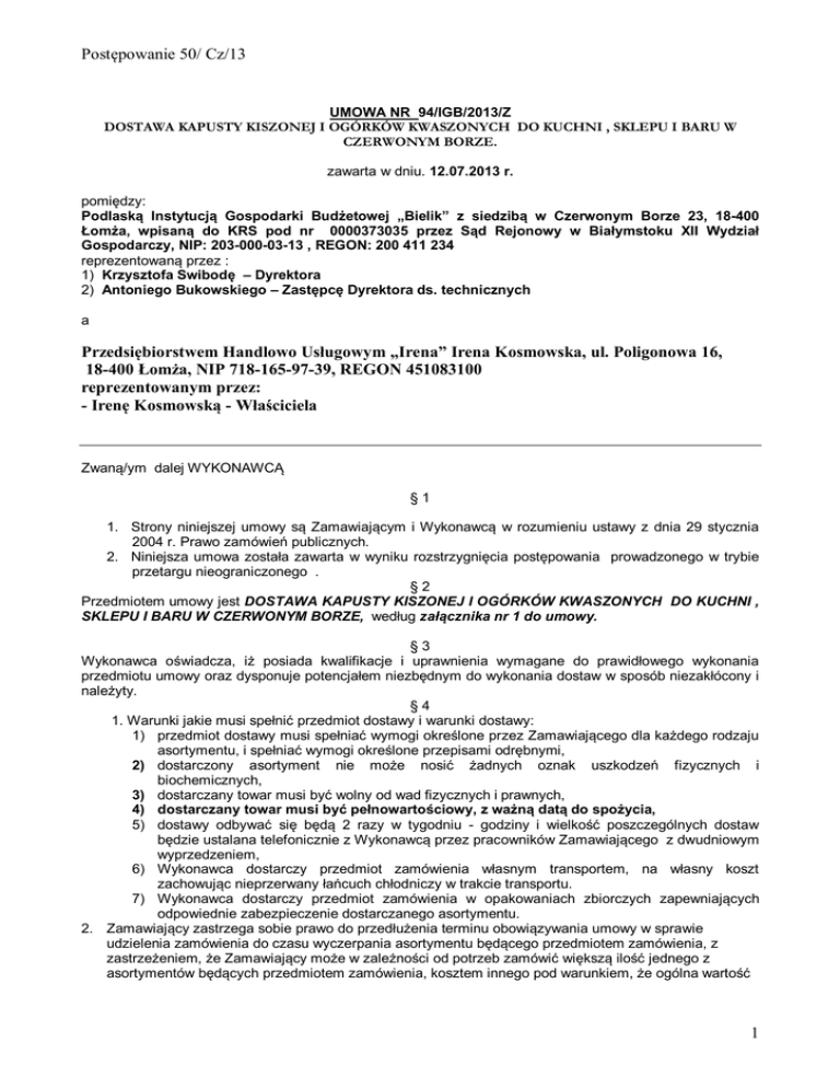 Postępowanie 50/ Cz/13 UMOWA NR 94/IGB/2013/Z DOSTAWA KAPUSTY KISZONEJ I OGÓRKÓW KWASZONYCH DO KUCHNI , SKLEPU I BARU W CZERWONYM BORZE. zawarta w dniu. 12.07.2013 r. pomiędzy: Podlaską Instytucją Gospodarki Budżetowej „Bielik” z siedzibą w Czerwonym Borze 23, 18-400 Łomża, wpisaną do KRS pod nr 0000373035 przez Sąd Rejonowy w Białymstoku XII Wydział Gospodarczy, NIP: 203-000-03-13 , REGON: 200 411 234 reprezentowaną przez : 1) Krzysztofa Swibodę – Dyrektora 2) Antoniego Bukowskiego – Zastępcę Dyrektora ds. technicznych a Przedsiębiorstwem Handlowo Usługowym „Irena” Irena Kosmowska, ul. Poligonowa 16, 18-400 Łomża, NIP 718-165-97-39, REGON 451083100 reprezentowanym przez: - Irenę Kosmowską - Właściciela Zwaną/ym dalej WYKONAWCĄ §1 1. Strony niniejszej umowy są Zamawiającym i Wykonawcą w rozumieniu ustawy z dnia 29 stycznia 2004 r. Prawo zamówień publicznych. 2. Niniejsza umowa została zawarta w wyniku rozstrzygnięcia postępowania prowadzonego w trybie przetargu nieograniczonego . §2 Przedmiotem umowy jest DOSTAWA KAPUSTY KISZONEJ I OGÓRKÓW KWASZONYCH DO KUCHNI , SKLEPU I BARU W CZERWONYM BORZE, według załącznika nr 1 do umowy. §3 Wykonawca oświadcza, iż posiada kwalifikacje i uprawnienia wymagane do prawidłowego wykonania przedmiotu umowy oraz dysponuje potencjałem niezbędnym do wykonania dostaw w sposób niezakłócony i należyty. §4 1. Warunki jakie musi spełnić przedmiot dostawy i warunki dostawy: 1) przedmiot dostawy musi spełniać wymogi określone przez Zamawiającego dla każdego rodzaju asortymentu, i spełniać wymogi określone przepisami odrębnymi, 2) dostarczony asortyment nie może nosić żadnych oznak uszkodzeń fizycznych i biochemicznych, 3) dostarczany towar musi być wolny od wad fizycznych i prawnych, 4) dostarczany towar musi być pełnowartościowy, z ważną datą do spożycia, 5) dostawy odbywać się będą 2 razy w tygodniu - godziny i wielkość poszczególnych dostaw będzie ustalana telefonicznie z Wykonawcą przez pracowników Zamawiającego z dwudniowym wyprzedzeniem, 6) Wykonawca dostarczy przedmiot zamówienia własnym transportem, na własny koszt zachowując nieprzerwany łańcuch chłodniczy w trakcie transportu. 7) Wykonawca dostarczy przedmiot zamówienia w opakowaniach zbiorczych zapewniających odpowiednie zabezpieczenie dostarczanego asortymentu. 2. Zamawiający zastrzega sobie prawo do przedłużenia terminu obowiązywania umowy w sprawie udzielenia zamówienia do czasu wyczerpania asortymentu będącego przedmiotem zamówienia, z zastrzeżeniem, że Zamawiający może w zależności od potrzeb zamówić większą ilość jednego z asortymentów będących przedmiotem zamówienia, kosztem innego pod warunkiem, że ogólna wartość 1 Postępowanie 50/ Cz/13 3. 4. 5. 6. 7. 8. 9. 10. 11. umowy nie ulegnie zmianie. Zamawiający może nie wyczerpać całości asortymentu będącego przedmiotem umowy, bez żadnych konsekwencji. Termin płatności wynagrodzenia należnego Wykonawcy wynosi 30 dni od daty dostarczenia prawidłowo wystawionej faktury do siedziby Zamawiającego. Zamawiający nie przyjmie faktury, jeżeli zostaną zgłoszone jakiekolwiek zastrzeżenia do przedmiotu dostawy. Zamawiający ma prawo reklamować przedmiot dostawy. Na rozpatrzenie reklamacji Wykonawca ma 12 godzin . W przypadku uznania reklamacji Wykonawca w ciągu następnych 12 godzin po terminie zgłoszenia reklamacji, z uwzględnieniem godzin przyjmowania towaru obowiązujących u Zamawiającego: 1) usunie zgłoszone nieprawidłowości poprzez uzupełnienie dostawy w przypadku rozbieżności w ilości; 2) wymieni towar na nowy lub inny odpowiadający wymaganiom Zamawiającego - w przypadku zakwestionowania jakości. Reklamacje Zamawiający będzie zgłaszał pocztą, telefonicznie lub faksem. Nie udzielenie odpowiedzi na złożoną reklamację w ciągu 12 godzin od jej otrzymania przyjmuje się za uznanie reklamacji. W sytuacji, gdy Wykonawca dostarczy towar ( zamienny ) nieodpowiadający ofercie, a co tym idzie załącznikowi 1 do umowy, pracownik Zamawiającego może towar przyjąć, gdy wymagają tego okoliczności, co nie zwalnia Wykonawcy z obowiązku zapłaty kary umownej na zasadach określonych w § 7 ust. 1 pkt 2. Zamawiający zastrzega sobie prawo do żądania dokumentów poświadczających, że dostarczane produkty są zgodne z wymogami ustawy z dnia dnia 12 grudnia 2003 r. o ogólnym bezpieczeństwie produktów oraz ustawy z dnia 25 sierpnia 2006 r. o bezpieczeństwie żywności i żywienia. §5 1. Wynagrodzenie Wykonawcy za wykonanie przedmiotu umowy wynosi: - 16 735,00 zł bez podatku VAT - 18 073,80 zł z podatkiem VAT ( słownie: osiemnaście tysięcy siedemdziesiąt trzy złote i osiemdziesiąt groszy) podatek VAT wynosi 1 338,80 zł 2. Dopuszcza się możliwość okresowego dostarczania produktów po cenie niższej od wskazanej w umowie; co nie powoduje konieczności zawierania aneksu. 3. Zamawiający zastrzega sobie możliwość, a Wykonawca wyraża zgodę na zmianę ilości poszczególnych produktów w zależności od swoich potrzeb, przy zachowaniu ustalonych cen jednostkowych. Zmiany w tym zakresie nie stanowią zmiany warunków umowy i nie wymagają formy pisemnej w postaci aneksów, a ponadto Wykonawcy nie przysługują wobec Zamawiającego jakiekolwiek roszczenia z tego tytułu. 4. Wynagrodzenie Wykonawcy obejmuje wszystkie koszty związane z wykonaniem przedmiotu umowy. 5. Rozliczenie za wykonanie przedmiotu umowy następować będzie na podstawie wystawionej przez Wykonawcę faktury VAT, po zrealizowaniu zamówienia jednostkowego. 6. Termin płatności wynosi 30 dni od daty dostarczenia przez Wykonawcę do siedziby Zamawiającego prawidłowo wystawionej faktury VAT. 7. Na fakturze Wykonawca zobowiązany jest zamieścić nr niniejszej umowy. §6 Wykonawca będzie realizował niniejsza umowę od dnia podpisania umowy o udzielenie zamówienia do dnia 11.07.2014 r. lub do wyczerpania war