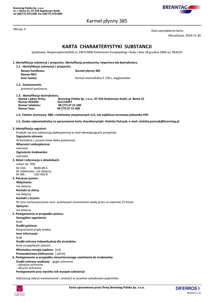 Brenntag Polska Sp. z o.o. ul. J. Bema 21, 47-224 Kędzierzyn-Koźle tel (48/77) 4721500, fax (48/77) 4721600 Karmel płynny 385 Wersja: II Data sporządzenia karty: __________ Aktualizacja: 2010-11-30 KARTA CHARAKTERYSTYKI SUBSTANCJI (podstawa: Rozporządzenie(WE) nr 1907/2006 Parlamentu Europejskiegi i Rady z dnia 18 grudnia 2006 ws. REACH) 1. Identyfikacja substancji / preparatu. Identyfikacja producenta, importera lub dystrybutora. 1.1. Identyfikacja substancji / preparatu. Nazwa handlowa: Karmel płynny 385 Nazwa INCI: Inne nazwy: Karmel amoniakalny E 150 c, węglowodan 1.2. Zastosowanie. przemysł spożywczy 1.3. Identyfikacja dystrybutora. Nazwa i adres firmy: Brenntag Polska Sp. z o.o., 47-224 Kedzierzyn-Koźle, ul. Bema 21 Numer REGON: 531174447 Numer telefonu: 48 (77) 47 21 500 Numer faxu: 48 (77) 47 21 600 1.4. Telefon alarmowy: 988, z telefonów stacjonarnych 112, lub najbliższa terenowa jednostka PSP. 1.5. Osoba odpowiedzialna za opracowanie karty charakterystyki: Violetta Pańczyk, e-mail: [email protected] 2. Identyfikacja zagrożeń: Produkt nie jest substancją niebezpieczną w myśl obowiązujących przepisów Zagrożenia zdrowia: W kontakcie z oczami może lekko podrażniać. Własności niebezpieczne: nieznane Zagrożenie środowiska: nieznane 3. Skład i informacja o składnikach: cukier ok. 70% Nr CAS: 8028-89-5 Nr indeksowy: nie dotyczy Nr WE: 232-435-9 4. Pierwsza pomoc: Wdychanie: nie dotyczy Kontakt ze skórą: nie dotyczy Kontakt z oczami: W razie zanieczyszczenia oczu przemywać strumieniem wody przez co najmniej 15 minut. Spożycie: nie dotyczy 5. Postępowanie w przypadku pożaru: Szczególne zagrożenia: brak Środki gaśnicze: Rozproszone prądy wodne Inne informacje: brak Środki ochrony indywidualnej dla strażaków: brak szczególnych zaleceń Minimalna energia zapłonu: [mJ] Przewodnictwo elektryczne: [ pS/m] 6. Postępowanie w przypadku niezamierzonego uwolnienia do środowiska: Środki ochrony osobistej: - gogle ochronne - rękawice ochronne - ubranie ochronne Postępowanie przy wycieku lub wysypie substancji: Substancję zebrać mechanicznie i umieścić w szczelnie zamykanym pojemniku. Karta opracowana przez firmę Brenntag Polska Sp. z o.o. Strona 1 z 4 Brenntag Polska Sp. z o.o. ul. J. Bema 21, 47-224 Kędzierzyn-Koźle tel (48/77) 4721500, fax (48/77) 4721600 Karmel płynny 385 Chronić przed przedostaniem się do środowiska (rzek, gleb, kanałów ściekowych) 7. Postępowanie z substancją / preparatem i magazynowanie: Magazynowanie: Składować w pomieszczeniach dobrze wentylowanych. Unikać kontaktu z silnymi utleniaczami. Przechowywac w temperaturze < 20°C i wilgotnośc wzglednej < 60% Postępowanie z substancją lub preparatem: Unikać wzniecania pyłu i kurzu. Manipulowanie w pomieszczeniach o dobrej wentylacji. Unikać kontaktu z silnymi utleniaczami. 8. Kontrola narażenia i środki ochrony indywidualnej: Stosowane środki ochrony osobistej powinny spełniać wymogi Rozporządzenia Ministra Gospodarki z dnia 21 grudnia 2005 r. w sprawie zasadniczych wymagań dla środków ochrony indywidualnej (Dz.U. Nr 259, poz. 2173). Ochrona dróg oddechowych: nie wymagana Ochrona oczu: okulary lub gogle ochronne Ochrona rąk: rękawice ochronneTechniczne środki ochronne: wentylacja pomieszczeń Inne wyposażenie ochronne: ubranie ochronne Kontrola zagrożenia: NDS, NDSCh - nie oznaczono (wg Rozporządzenia MPiPS z dn. 29 listopada 2002 ; Dz.U. Nr 217, poz. 1833 z późniejszymi zmianami) Zalecenia dotyczące procedury monitoringu zawartości składników niebezpiecznych w powietrzu – metodyka pomiarów: -Rozporządzenie Ministra Zdrowia z dnia 20 kwietnia 2005 r. w sprawie badań i pomiarów czynników szkodliwych dla zdrowia w środowisku pracy (Dz.U. Nr 73, poz.645) -PN-89/Z-01001/06. Ochrona czystości powietrza. Nazwy, określenia i jednostki. Terminologia dotycząca badań jakości powietrza na stanowiskach pracy. -PN Z-04008-7:2002. Ochrona czystości powietrza. Pobieranie próbek. Zasady pobierania próbek powietrza w środowisku pracy i interpretacja wyników. -PN-EN-689: 2002. Powietrze na stanowiskach pracy – wytyczne oceny narażenia inhalacyjnego na czynniki chemiczne przez porównanie z wartościami dopuszczalnymi i strategia pomiarowa. Uwaga: Gdy stężenie substancji jest ustalone i znane, doboru środków ochrony indywidualnej należy dokonywać z uwzględnieniem stężenia substancji występującego na danym stanowisku pracy, czasu ekspozycji oraz czynności wykonywanych przez pracownika. W sytuacji awaryjnej, jeżeli stężenie substancji na stanowisku pracy nie jest znane, stosować środki ochrony indywidualnej o najwyższej zalecanej klasie ochrony. Pracodawca jest obowiązany zapewnić, aby stosowane środki ochrony indywidualnej oraz odzież i obuwie robocze posiadały właściwości ochronne i użytkowe oraz zapewnić odpowiednie ich pranie, konserwacje, naprawę i odkażanie. Zalecane badania wstępne i okresowe pracowników należy przeprowadzać zgodnie z Rozporządzeniem Ministra Zdrowia i Opieki Społecznej z dnia 30 maja 1996 r. w sprawie przeprowadzania badań lekarskich pracowników, zakresu profilaktycznej opieki zdrowotnej nad pracownikami oraz orzeczeń lekarskich wydanych do celów przewidzianych w Kodeksie Pracy (Dz.U. Nr 69/1996r. poz. 332, ze zmianami Dz.U. Nr 37/2001r. poz. 451) 9. Właściwości fizyczne i chemiczne: Ogólne właściwości: Ciemnobrązowa ciecz o zapachu palonego cukru Temperatura zapłonu, [°C] Temperatura Górna granica wybuchowości, [% V/V] samozapłonu, [°C] brak danych brak danych brak danych Ciężar właściwy [kg/m3] Masa cząsteczkowa 1280 nie dotyczy Temperatura wrzenia, [°C] Temperatura topnienia, [°C] brak danych brak danych Rozpuszczalność w innych rozpuszczalnikach Rozpuszczalność w wodzie brak danych miesza się Współczynnik podziału n-oktanol / woda Współczynnik załamania światła brak danych brak danych 10. Stabilność i reaktywność: stabilność: Pr