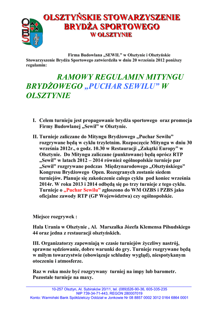 OLSZTYŃSKIE STOWARZYSZENIE BRYDŻA SPORTOWEGO W WO OL LSSZ ZT TY YN NIIE E Firma Budowlana „SEWIL” w Olsztynie i Olsztyńskie Stowarzyszenie Brydża Sportowego zatwierdziła w dniu 20 września 2012 poniższy regulamin: RAMOWY REGULAMIN MITYNGU BRYDŻOWEGO „PUCHAR SEWILU” W OLSZTYNIE I. Celem turnieju jest propagowanie brydża sportowego oraz promocja Firmy Budowlanej „Sewil” w Olsztynie. II. Turnieje zaliczane do Mityngu Brydżowego „Puchar Sewilu” rozgrywane będą w cyklu trzyletnim. Rozpoczęcie Mityngu w dniu 30 września 2012r., o godz. 10.30 w Restauracji „Zakątki Europy” w Olsztynie. Do Mityngu zaliczane (punktowane) będą oprócz RTP „Sewil” w latach 2012 – 2014 również ogólnopolskie turnieje par „Sewil” rozgrywane podczas Międzynarodowego „Olsztyńskiego” Kongresu Brydżowego Open. Rozegranych zostanie siedem turniejów. Planuje się zakończenie całego cyklu pod koniec września 2014r. W roku 2013 i 2014 odbędą się po trzy turnieje z tego cyklu. Turnieje o „Puchar Sewilu” zgłoszono do WM OZBS i PZBS jako oficjalne zawody RTP (GP Województwa) czy ogólnopolskie. Miejsce rozgrywek : Hala Urania w Olsztynie , Al. Marszałka Józefa Klemensa Piłsudskiego 44 oraz jedna z restauracji olsztyńskich. III. Organizatorzy zapewniają w czasie turniejów życzliwy nastrój, sprawne sędziowanie, dobre warunki do gry. Turnieje rozgrywane będą w miłym towarzystwie (obowiązuje schludny wygląd), niespotykanym otoczeniu i atmosferze. Raz w roku może być rozgrywany turniej na impy lub barometr. Pozostałe turnieje na maxy. _________________________________________________________________________________ 10-257 Olsztyn, Al. Sybiraków 20/11, tel. (089)526-90-36, 605-335-235 NIP 739-34-71-443, REGON 280007019 Konto: Warmiński Bank Spółdzielczy Oddział w Jonkowie Nr 08 8857 0002 3012 0164 6864 0001 OLSZTYŃSKIE STOWARZYSZENIE BRYDŻA SPORTOWEGO W WO OL LSSZ ZT TY YN NIIE E IV. Opłaty startowe: * Normalna - 25 zł od osoby, * I ulgowa – 20 zł (kobiety, seniorzy od 65 lat), * II ulgowa – 10 zł (uczniowie i juniorzy do 25 lat). V. Podział funduszu wpisowego: 50% na nagrody regulaminowe (z tym, że 40% nagrody bieżące finansowe i 10 % nagrody rzeczowe lub trofea sportowe). Pozostałe 50% funduszu to opłaty regulaminowe do WM OZBS i koszty organizacyjne. VI. Dodatkowe nagrody specjalne – poza regulaminowym podziałem funduszu wpisowego, otrzymują pary, które zajmą wyższe miejsce w danym turnieju spośród innych par tej samej kategorii WK i tak (nie dotyczy Międzynarodowego Turnieju o Puchar Sewilu rozgrywanego podczas Kongresu Brydżowego w Hali Urania) : * para nie mająca żadnego tytułu brydżowego WK – 100 zł ale tylko przypadku, gdy w turnieju wystartuje minimum dwie pary, * para w której jeden z zawodników ma do 1,0 WK – 100 zł z zastrzeżeniem jak wyżej, * para juniorów (do 25 lat) – 100 zł, przy minimum dwóch parach * najlepsza para kobieca – 100 zł w której jedna osoba posiada do – 1,0 WK i tylko jeśli w turnieju gra minimum dwie pary. Powyższe nagrody nie kumulują się. VII. Punktacja i inne nagrody: 1. W każdym turnieju par - z wyjątkiem turniejów o „Puchar Sewilu” rozgrywanych podczas Międzynarodowych „Olsztyńskich” Kongresów Brydżowych w latach 2013/14 w Hali Urania w Olsztynie - będą przyznawane punkty długofalowe dla wszystkich startujących z obniżką o dwa, a w turnieju indywidualnym o jeden. _________________________________________________________________________________ 10-257 Olsztyn, Al. Sybiraków 20/11, tel. (089)526-90-36, 605-335-235 NIP 739-34-71-443, REGON 280007019 Konto: Warmiński Bank Spółdzielczy Oddział w Jonkowie Nr 08 8857 0002 3012 0164 6864 0001 OLSZTYŃSKIE STOWARZYSZENIE BRYDŻA SPORTOWEGO W WO OL LSSZ ZT TY YN NIIE E 2. Maksymalna do zdobycia ilość punktów długofalowych w turniejach o „Puchar Sewilu” rozgrywanych podczas Kongresów Brydżowych w Hali Urania w latach 2013 i 2014 – wynosi 50 PDF z obniżką dwa punkty, aż do wyczerpania. 3. Za wygranie klasyfikacji długofalowej całego cyklu Firma Budowlana Sewil ufunduje dla trzech pierwszych zawodników nagrody -niespodzianki. Mogą to być nagrody finansowe lub rzeczowe. 4. Przy równej ilości zdobytych PDF o kolejności decyduje w pierwszej kolejności : 1a. Wyższe miejsce w turnieju indywidualnym (jeśli zostanie rozegrany). 2b. Niższy WK. 3c. Losowanie. VIII. W każdym turnieju „PUCHAR SEWILU” para dodatkowo otrzymuje (z wyjątkiem turniejów rozgrywanych podczas Międzynarodowego Kongresu Brydżowego w 2013 i 2014 r w Hali Urania) za: * I miejsce – 300 zł, * II miejsce – 200 zł, * III miejsce -100 zł, IX. O zasadach stosowania systemów wysoce sztucznych uczestników poinformuje sędzia główny zawodów. Sędzia w czasie turnieju odpowiada za utrzymanie porządku na sali gry włącznie z prawem wykluczenia z gry osób zakłócających ten porządek lub dobre obyczaje. X. W turniejach obowiązują przepisy MPB i regulaminy oraz zasady zgodne z polityką systemową PZBS, WM OZBS i niniejszy regulamin. _________________________________________________________________________________ 10-257 Olsztyn, Al. Sybiraków 20/11, tel. (089)526-90-36, 605-335-235 NIP 739-34-71-443, REGON 280007019 Konto: Warmiński Bank Spółdzielczy Oddział w Jonkowie Nr 08 8857 0002 3012 0164 6864 0001 OLSZTYŃSKIE STOWARZYSZENIE BRYDŻA SPORTOWEGO W WO OL LSSZ ZT TY YN NIIE E XI. Organizator zastrzega sobie prawo dokonania zmian w regulaminie bez podania przyczyny. Ostateczna interpretacja niniejszego regulaminu przysługuje jedynie organizatorowi. Organizatorzy _________________________________________________________________________________ 10-257 Olsztyn, Al. Sybiraków 20/11, tel. (089)526-90-36, 605-335-235 NIP 739-34-71-443, REGON 280007019 Konto: Warmiński Bank Spółdzielczy Oddział w Jonkowie Nr 08 8857 0002 3012 0164 6864 0001