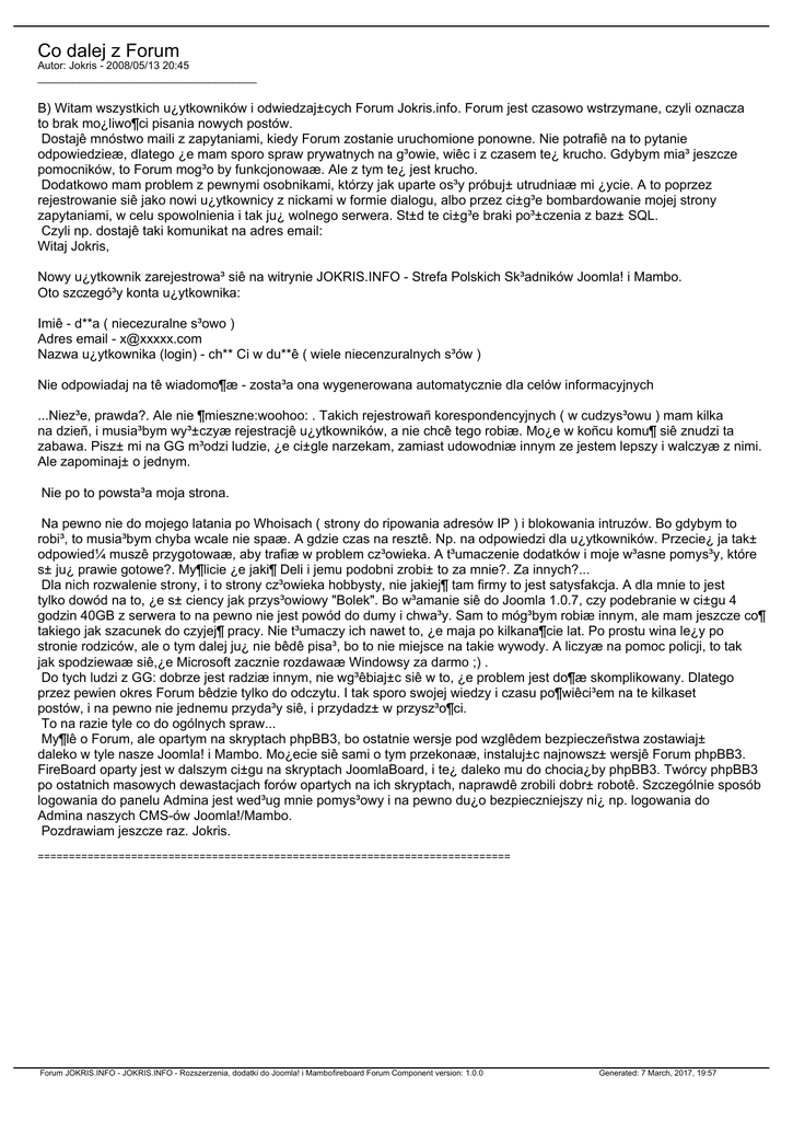 Co dalej z Forum Autor: Jokris - 2008/05/13 20:45 _____________________________________ B) Witam wszystkich u¿ytkowników i odwiedzaj±cych Forum Jokris.info. Forum jest czasowo wstrzymane, czyli oznacza to brak mo¿liwo¶ci pisania nowych postów. Dostajê mnóstwo maili z zapytaniami, kiedy Forum zostanie uruchomione ponowne. Nie potrafiê na to pytanie odpowiedzieæ, dlatego ¿e mam sporo spraw prywatnych na g³owie, wiêc i z czasem te¿ krucho. Gdybym mia³ jeszcze pomocników, to Forum mog³o by funkcjonowaæ. Ale z tym te¿ jest krucho. Dodatkowo mam problem z pewnymi osobnikami, którzy jak uparte os³y próbuj± utrudniaæ mi ¿ycie. A to poprzez rejestrowanie siê jako nowi u¿ytkownicy z nickami w formie dialogu, albo przez ci±g³e bombardowanie mojej strony zapytaniami, w celu spowolnienia i tak ju¿ wolnego serwera. St±d te ci±g³e braki po³±czenia z baz± SQL. Czyli np. dostajê taki komunikat na adres email: Witaj Jokris, Nowy u¿ytkownik zarejestrowa³ siê na witrynie JOKRIS.INFO - Strefa Polskich Sk³adników Joomla! i Mambo. Oto szczegó³y konta u¿ytkownika: Imiê - d**a ( niecezuralne s³owo ) Adres email - [email protected] Nazwa u¿ytkownika (login) - ch** Ci w du**ê ( wiele niecenzuralnych s³ów ) Nie odpowiadaj na tê wiadomo¶æ - zosta³a ona wygenerowana automatycznie dla celów informacyjnych ...Niez³e, prawda?. Ale nie ¶mieszne:woohoo: . Takich rejestrowañ korespondencyjnych ( w cudzys³owu ) mam kilka na dzieñ, i musia³bym wy³±czyæ rejestracjê u¿ytkowników, a nie chcê tego robiæ. Mo¿e w koñcu komu¶ siê znudzi ta zabawa. Pisz± mi na GG m³odzi ludzie, ¿e ci±gle narzekam, zamiast udowodniæ innym ze jestem lepszy i walczyæ z nimi. Ale zapominaj± o jednym. Nie po to powsta³a moja strona. Na pewno nie do mojego latania po Whoisach ( strony do ripowania adresów IP ) i blokowania intruzów. Bo gdybym to robi³, to musia³bym chyba wcale nie spaæ. A gdzie czas na resztê. Np. na odpowiedzi dla u¿ytkowników. Przecie¿ ja tak± odpowied¼ muszê przygotowaæ, aby trafiæ w problem cz³owieka. A t³umaczenie dodatków i moje w³asne pomys³y, które s± ju¿ prawie gotowe?. My¶licie ¿e jaki¶ Deli i jemu podobni zrobi± to za mnie?. Za innych?... Dla nich rozwalenie strony, i to strony cz³owieka hobbysty, nie jakiej¶ tam firmy to jest satysfakcja. A dla mnie to jest tylko dowód na to, ¿e s± ciency jak przys³owiowy "Bolek". Bo w³amanie siê do Joomla 1.0.7, czy podebranie w ci±gu 4 godzin 40GB z serwera to na pewno nie jest powód do dumy i chwa³y. Sam to móg³bym robiæ innym, ale mam jeszcze co¶ takiego jak szacunek do czyjej¶ pracy. Nie t³umaczy ich nawet to, ¿e maja po kilkana¶cie lat. Po prostu wina le¿y po stronie rodziców, ale o tym dalej ju¿ nie bêdê pisa³, bo to nie miejsce na takie wywody. A liczyæ na pomoc policji, to tak jak spodziewaæ siê,¿e Microsoft zacznie rozdawaæ Windowsy za darmo ;) . Do tych ludzi z GG: dobrze jest radziæ innym, nie wg³êbiaj±c siê w to, ¿e problem jest do¶æ skomplikowany. Dlatego przez pewien okres Forum bêdzie tylko do odczytu. I tak sporo swojej wiedzy i czasu po¶wiêci³em na te kilkaset postów, i na pewno nie jednemu przyda³y siê, i przydadz± w przysz³o¶ci. To na razie tyle co do ogólnych spraw... My¶lê o Forum, ale opartym na skryptach phpBB3, bo ostatnie wersje pod wzglêdem bezpieczeñstwa zostawiaj± daleko w tyle nasze Joomla! i Mambo. Mo¿ecie siê sami o tym przekonaæ, instaluj±c najnowsz± wersjê Forum phpBB3. FireBoard oparty jest w dalszym ci±gu na skryptach JoomlaBoard, i te¿ daleko mu do chocia¿by phpBB3. Twórcy phpBB3 po ostatnich masowych dewastacjach forów opartych na ich skryptach, naprawdê zrobili dobr± robotê. Szczególnie sposób logowania do panelu Admina jest wed³ug mnie pomys³owy i na pewno du¿o bezpieczniejszy ni¿ np. logowania do Admina naszych CMS-ów Joomla!/Mambo. Pozdrawiam jeszcze raz. Jokris. ============================================================================ Forum JOKRIS.INFO - JOKRIS.INFO - Rozszerzenia, dodatki do Joomla! i Mambofireboard Forum Component version: 1.0.0 Generated: 7 March, 2017, 19:57
