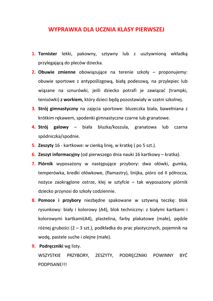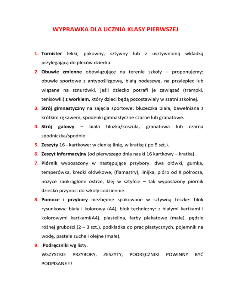 WYPRAWKA DLA UCZNIA KLASY PIERWSZEJ 1. Tornister lekki, pakowny, sztywny lub z usztywnioną wkładką przylegającą do pleców dziecka. 2. Obuwie zmienne obowiązujące na terenie szkoły – proponujemy: obuwie sportowe z antypoślizgową, białą podeszwą, na przylepiec lub wiązane na sznurówki, jeśli dziecko potrafi je zawiązać (trampki, tenisówki) z workiem, który dzieci będą pozostawiały w szatni szkolnej. 3. Strój gimnastyczny na zajęcia sportowe: bluzeczka biała, bawełniana z krótkim rękawem, spodenki gimnastyczne czarne lub granatowe. 4. Strój galowy – biała bluzka/koszula, granatowa lub czarna spódniczka/spodnie. 5. Zeszyty 16 - kartkowe: w cienką linię, w kratkę ( po 5 szt.). 6. Zeszyt informacyjny (od pierwszego dnia nauki 16 kartkowy – kratka). 7. Piórnik wyposażony w następujące przybory: dwa ołówki, gumka, temperówka, kredki ołówkowe, (flamastry), linijka, pióro od II półrocza, nożyce zaokrąglone ostrze, klej w sztyfcie – tak wyposażony piórnik dziecko przynosi do szkoły codziennie. 8. Pomoce i przybory niezbędne spakowane w sztywną teczkę: blok rysunkowy: biały i kolorowy (A4), blok techniczny: z białymi kartkami i kolorowymi kartkami(A4), plastelina, farby plakatowe (małe), pędzle różnej grubości (2 – 3 szt.), podkładka do prac plastycznych, pojemnik na wodę, pastele suche i olejne (małe). 9. Podręczniki wg listy. WSZYSTKIE PODPISANE!!! PRZYBORY, ZESZYTY, PODRĘCZNIKI POWINNY BYĆ