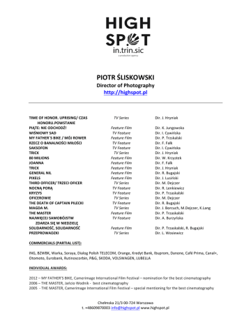 PIOTR ŚLISKOWSKI Director of Photography http://highspot.pl TIME OF HONOR. UPRISING/ CZAS TV Series Dir. J. Hryniak HONORU.POWSTANIE PIĄTE: NIE ODCHODŹ! Feature Film Dir. K. Jungowska WIŚNIOWY SAD TV Feature Dir. I. Cywińska MY FATHER`S BIKE / MÓJ ROWER Feature Film Dir. P. Trzskalski RZECZ O BANALNOŚCI MIŁOŚCI TV Feature Dir. F. Falk SAKSOFON TV Feature Dir. I. Cywińska TRICK TV Series Dir. J. Hryniak 80 MILIONS Feature Film Dir. W. Krzystek JOANNA Feature Film Dir. F. Falk TRICK Feature Film Dir. J. Hryniak GENERAL NIL Feature Film Dir. R. Bugajski PIXELS Feature Film Dir. J. Lusiński THIRD OFFICER/ TRZECI OFICER TV Series Dir. M. Dejczer NOCNĄ PORĄ TV Feature Dir. R. Lenkiewicz KRYZYS TV Feature Dir. P. Trzaskalski OFICEROWIE TV Series Dir. M. Dejczer THE DEATH OF CAPTAIN PILECKI TV Feature Dir. R. Bugajski MAGDA M. TV Series Dir. J. Borcuch, M.Dejczer, K.Lang THE MASTER Feature Film Dir. P. Trzaskalski NAJWIĘCEJ SAMOBÓJSTW TV Feature Dir. A. Burzyńska ZDARZA SIĘ W NIEDZIELĘ SOLIDARNOŚĆ, SOLIDARNOŚĆ Feature Film Dir. P. Trzaskalski, R. Bugajski PRZEPROWADZKI TV Series Dir. L. Wosiewicz COMMERCIALS (PARTIAL LIST): ING, BZWBK, Warka, Soraya, Dialog Polish TELECOM, Orange, Kredyt Bank, Ibuprom, Danone, Café Prima, Canal+, Otomoto, Eurobank, Rutinoscorbin, P&G, SKODA, VOLSWAGEN, LUBELLA INDIVIDUAL AWARDS: 2012 – MY FATHER’S BIKE, Camerimage International Film Festival – nomination for the best cinematography 2006 – THE MASTER, Jańcio Wodnik -‐ best cinematography 2005 -‐ THE MASTER, Camerimage International Film Festival – special mentioning for the best cinematography Chełmska 21/3 00-‐724 Warszawa t. +48609870003 [email protected] www.highspot.pl 2003 – Yach -‐ best cinematography for a music videoclip Chełmska 21/3 00-‐724 Warszawa t. +48609870003 [email protected] www.highspot.pl