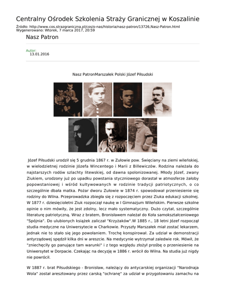 Centralny Ośrodek Szkolenia Straży Granicznej w Koszalinie Źródło: http://www.cos.strazgraniczna.pl/cos/o-nas/historia/nasz-patron/13726,Nasz-Patron.html Wygenerowano: Wtorek, 7 marca 2017, 20:59 Nasz Patron Autor: 13.01.2016 Nasz PatronMarszałek Polski Józef Piłsudski Józef Piłsudski urodził się 5 grudnia 1867 r. w Zułowie pow. Święciany na ziemi wileńskiej, w wielodzietnej rodzinie Józefa Wincentego i Marii z Billewiczów. Rodzina należała do najstarszych rodów szlachty litewskiej, od dawna spolonizowanej. Młody Józef, zwany Ziukiem, urodzony już po upadku powstania styczniowego dorastał w atmosferze żałoby popowstaniowej i wśród kultywowanych w rodzinie tradycji patriotycznych, o co szczególnie dbała matka. Pożar dworu Zułowie w 1874 r. spowodował przeniesienie się rodziny do Wilna. Przeprowadzka zbiegła się z rozpoczęciem przez Ziuka edukacji szkolnej. W 1877 r. dziesięcioletni Ziuk rozpoczął naukę w I Gimnazjum Wileńskim. Pierwsze szkolne opinie o nim mówiły, że jest zdolny, lecz mało systematyczny. Dużo czytał, szczególnie literaturę patriotyczną. Wraz z bratem, Bronisławem należał do Koła samokształceniowego "Spójnia". Do ulubionych książek zaliczał "Krzyżaków".W 1885 r., 18 letni Józef rozpoczął studia medyczne na Uniwersytecie w Charkowie. Przyszły Marszałek miał zostać lekarzem, jednak nie to stało się jego powołaniem. Trochę konspirował. Za udział w demonstracji antyrządowej spędził kilka dni w areszcie. Na medycynie wytrzymał zaledwie rok. Mówił, że "zniechęciły go panujące tam warunki" i z tego względu złożył prośbę o przeniesienie na Uniwersytet w Dorpacie. Czekając na decyzję w 1886 r. wrócił do Wilna. Na studia już nigdy nie powrócił. W 1887 r. brat Piłsudskiego - Bronisław, należący do antycarskiej organizacji "Narodnaja Wola" został aresztowany przez carską "ochranę" za udział w przygotowaniu zamachu na cara Aleksandra III. Zamach nie udał się, a na organizatorów spadły represje. Sam Józef Piłsudski, nie będąc de facto wtajemniczony w spisek został aresztowany w oparciu o zarzut kontaktu ze spiskowcami. Mimo, iż śledztwo nic nie wykazało skazano go na 5 lat zesłania na Syberię. Przebywał w Irkucku, Kireńsku i Tunce. Tam m.in. poznał Bronisława Szwarce - członka Centralnego Komitetu Narodowego z czasów powstania styczniowego oraz innych powstańców i rewolucjonistów. Można powiedzieć, że wśród nich dojrzewał politycznie. Przeżył tam również swoją pierwszą miłość, którą była Leonarda Lewandowska. W kwietniu 1892 r. Józef Piłsudski powrócił z zesłania do Wilna i całkowicie poświęcił się konspiracji niepodległościowej. Stał się działaczem Polskiej Partii Socjalistycznej. Przyjął pseudonim "Wiktor", redagował pismo "Robotnik". Wtedy też poznał Marię z Koplewskich, która w 1899 r. została jego żoną. W 1895 r. Józef Piłsudski został członkiem Centralnego Komitetu Robotniczego. Jego aktywna działalność konspiracyjna sprawiła, że zaczęła poszukiwać go policja. W 1896 r. na kilka miesięcy wyjechał do Londynu. Działał w Wilnie, Warszawie i Łodzi. Tam, w lutym 1900 r. za konspiracyjne wydawanie organu PPS "Robotnik" został aresztowany i osadzony w warszawskiej Cytadeli. Symulującego chorobę psychiatryczną, skierowano go do szpitala w Petersburgu, skąd po 5 miesiącach zbiegł dzięki towarzyszom z PPS. Latem 1901 r. wraz z żoną wyjechał do Galicji. W 1905 r. doprowadził do utworzenia w PPS tzw. Organizacji Bojowej stając na jej czele. Uczestniczył w wydarzeniach rewolucji 1905 r., a rok później powołał do życia PPS - Frakcję Rewolucyjną. W czerwcu 1908 r. wraz z Kazimierzem Sosnkowskim założył we Lwowie Tajny Związek Walki Czynnej, którego struktury niebawem przeniknęły do Królestwa, a przy napływie ochotników możliwe stało się utworzenie Związku Strzeleckiego, Strzelca i Polskich Drużyn Strzeleckich. Jednocześnie w tzw. "robocie konspiracyjnej" poznał młodą kurierkę, Aleksandrę Szczerbińską, która 25 października 1921 r. została jego drugą żoną. W sierpniu 1912 r. wziął udział w zjeździe polskich działaczy niepodległościowych w Zakopanem. Utworzył Polski Skarb Narodowy. W grudniu tegoż roku Tymczasowa Komisja Skonfederowanych Stronnictw Niepodległościowych mianowała go komendantem głównym Polskich Sił Zbrojnych na wypadek wojny z Rosją. W 1914 r. z chwilą wybuchu "Wielkiej Wojny", Piłsudski ogłosił mobilizację oddziałów strzeleckich i rozpoczął organizację Legionów Polskich. 6 sierpnia z krakowskich Oleandrów wyruszyła do Królestwa Polskiego I Kompania Kadrowa, jako zalążek Wojska Polskiego. 12 sierpnia 1914 r. Piłsudski na czele utworzonego z Kompanii Kadrowej i dwóch innych kompanii batalionu strzelców zajął Kielce. 15 listopada 1914 r. został mianowany brygadierem. 19 grudnia z trzech istniejących pułków piechoty utworzona została I BRYGADA LEGIONÓW. Józef Piłsudski dowodził nią do października 1916 r. Na czele I Brygady Piłsudski uczestniczył we wszystkich bitwach na legionowym szlaku: Łowczówek (22-25 XII 1914 r.), Konary (16-25 V 1915 r.), Jastków (30 VII - 3 VIII 1915 r.), Kamionka (4-7 VIII 1915 r.), Kostiuchnówka (4-6 VII 1916 r.). Bitwa pod Kostiuchnówką była ostatnią bitwą, w której uczestniczył jako jej komendant. Jesienią przekazał dowodzenie płk. Marianowi Żegocie Januszajtisowi. We wrześniu 1916 r. Józef Piłsudski otrzymał formalną dymisję i rozpoczął ożywioną działalność polityczną.Kiedy 5 listopada rządy Niemiec i Austro-Węgier ogłosiły utworzenie Królestwa Polskiego, tzw. Akt 5 listopada, Piłsudski dostrzegł w tym wydarzeniu szansę, na utworzenie polskiego wojska podległego Centralnemu Komitetowi Narodowemu. Niestety, władze niemieckie były temu przeciwne, ale zaakceptowano wejście Piłsudskiego do składu Tymczasowej Rady Stanu, która zosta
