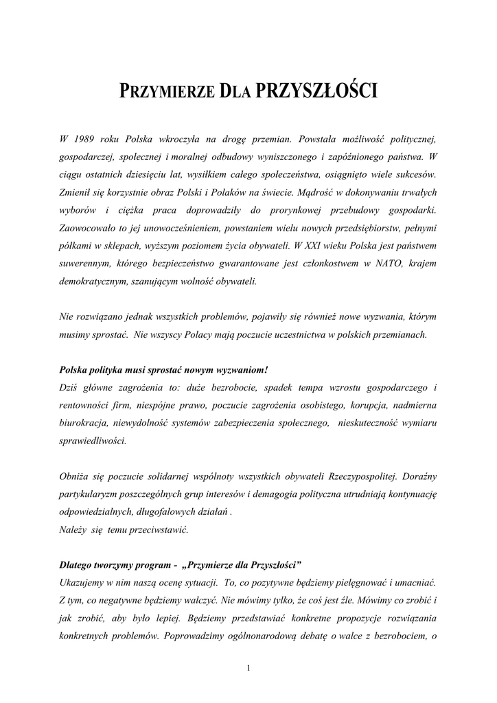 PRZYMIERZE DLA PRZYSZŁOŚCI W 1989 roku Polska wkroczyła na drogę przemian. Powstała możliwość politycznej, gospodarczej, społecznej i moralnej odbudowy wyniszczonego i zapóźnionego państwa. W ciągu ostatnich dziesięciu lat, wysiłkiem całego społeczeństwa, osiągnięto wiele sukcesów. Zmienił się korzystnie obraz Polski i Polaków na świecie. Mądrość w dokonywaniu trwałych wyborów i ciężka praca doprowadziły do prorynkowej przebudowy gospodarki. Zaowocowało to jej unowocześnieniem, powstaniem wielu nowych przedsiębiorstw, pełnymi półkami w sklepach, wyższym poziomem życia obywateli. W XXI wieku Polska jest państwem suwerennym, którego bezpieczeństwo gwarantowane jest członkostwem w NATO, krajem demokratycznym, szanującym wolność obywateli. Nie rozwiązano jednak wszystkich problemów, pojawiły się również nowe wyzwania, którym musimy sprostać. Nie wszyscy Polacy mają poczucie uczestnictwa w polskich przemianach. Polska polityka musi sprostać nowym wyzwaniom! Dziś główne zagrożenia to: duże bezrobocie, spadek tempa wzrostu gospodarczego i rentowności firm, niespójne prawo, poczucie zagrożenia osobistego, korupcja, nadmierna biurokracja, niewydolność systemów zabezpieczenia społecznego, nieskuteczność wymiaru sprawiedliwości. Obniża się poczucie solidarnej wspólnoty wszystkich obywateli Rzeczypospolitej. Doraźny partykularyzm poszczególnych grup interesów i demagogia polityczna utrudniają kontynuację odpowiedzialnych, długofalowych działań . Należy się temu przeciwstawić. Dlatego tworzymy program - „Przymierze dla Przyszłości” Ukazujemy w nim naszą ocenę sytuacji. To, co pozytywne będziemy pielęgnować i umacniać. Z tym, co negatywne będziemy walczyć. Nie mówimy tylko, że coś jest źle. Mówimy co zrobić i jak zrobić, aby było lepiej. Będziemy przedstawiać konkretne propozycje rozwiązania konkretnych problemów. Poprowadzimy ogólnonarodową debatę o walce z bezrobociem, o 1 warunkach wprowadzenia nowego systemu podatkowego, o rozwoju edukacji, o warunkach rozwoju małych i średnich miast, o usprawnieniu polskiego wymiaru sprawiedliwości. Naszym najważniejszym celem jest Nowoczesna Polska – państwo bezpieczne, uczciwe, przyjazne dla obywateli, zapewniające każdemu równe szanse w edukacji, pracy i przedsiębiorczości. Instytucją naszego zaangażowanego działania jest RADA PARTNERSTWA W ramach Rady Partnerstwa chcemy prowadzić publiczny dialog o najważniejszych sprawach dla ludzi i kraju. Upowszechniać informacje o warunkach postępu. Wypracowywać opinie i inspirować działania mogące wzmocnić rozwój i eliminować zagrożenia. Pracować na rzecz konstruktywnego i odpowiedzialnego porozumienia Polaków. Rada Partnerstwa na wniosek sygnatariuszy będzie zwoływana w każdej sytuacji, w której podejmowane są najważniejsze dla losów obywateli decyzje i debaty. Dziś trzon Rady Partnerstwa stanowią ludzie Unii Wolności i Forum Dialogu. Rada Partnerstwa jest i zawsze będzie otwarta dla przedstawicieli wszystkich instytucji i środowisk, które chcą realizować program „Przymierze dla Przyszłości”. Rada Partnerstwa będzie działać na rzecz umacniania szerokiego centrum politycznego. Wiarygodne centrum gwarantuje dialog i równowagę między lewicą i prawicą. Rada Partnerstwa będzie wspierać rozwój klasy średniej w Polsce. Myśląc o przedsiębiorczych - Rada nie zapomina o problemach społecznych, nie zapomina o obowiązku opieki nad słabszymi - tymi, których słabość wynika ze zrządzenia losu a nie z braku troski o własną przyszłość. Rada nie zapomina również o młodzieży, szczególnie tej, dla której dostęp do edukacji jest utrudniony - ze wsi i z małych miasteczek. Aby działać skutecznie - Rada Partnerstwa będzie rekomendować przedstawicieli środowisk i instytucji wchodzących w jej skład jako kandydatów do parlamentu i samorządów, do organów władzy wykonawczej i sądowniczej. 2 Polska potrzebuje szerokiego partnerstwa w walce z prawdziwymi zagrożeniami. Niezbędne jest współdziałanie tych, którzy chcą dynamicznego rozwoju gospodarczego, ale zauważają problemy społeczne. Niezbędna jest współpraca tych wszystkich, którzy oprócz tego że widzą, co trzeba zmienić, jednocześnie mówią jak trzeba to zmienić. Polska potrzebuje równowagi między lewicą a prawicą. Polska potrzebuje wiarygodnego i otwartego centrum. Takie jest główne przesłanie „Przymierze dla Przyszłości”. 3 NOWE MIEJSCA PRACY W najbliższych latach polska gospodarka musi być zdolna do wchłonięcia: ponad miliona uczniów i studentów, którzy pojawią się na rynku pracy, przejęcia części tzw. ukrytego bezrobocia z sektora rolnego, około 300 tysięcy pracowników z restrukturyzowanych przemysłów (przemysłu górniczego, hutniczego, zbrojeniowego itd.) oraz tych, którzy „tracą” pracę z powodu wzrostu wydajności pracy. W sumie istnieje potrzeba stworzenia w nadchodzącej dekadzie około 3 milionów nowych miejsc pracy. Jednym z istotnych czynników hamujących tworzenie nowych miejsc pracy jest obowiązujący Kodeks Pracy, który sprzyja powstawaniu szarej strefy, nie wspomaga powstawania nowych miejsc pracy, generuje wzrost kosztów pracy. Jednie co trzecia złotówka przekazywana przez pracodawcę na zatrudnienie trafia do kieszeni pracownika. Pozostałe dwie trzecie to m.in.: podatki, odprowadzanie składki na Fundusz Pracy, Fundusz Rehabilitacji Osób Niepełnosprawnych, Fundusz Gwarantowanych Świadczeń Pracowniczych, wypłaty wynagrodzeń za okres choroby pracownika, wpłaty na Zakładowy Fundusz Świadczeń Socjalnych lub świadczenia urlopowe, składki ubezpieczenia społecznego, przeprowadzanie badań lekarskich pracowników, szkolenia bhp, badania środowiska pracy, odprawy emerytalno-rentowe, odprawy z tytułu zwolnień grupowych. Aby sprostać tym wyzwaniom będziemy: • działać na rzecz utrzymania stabiln