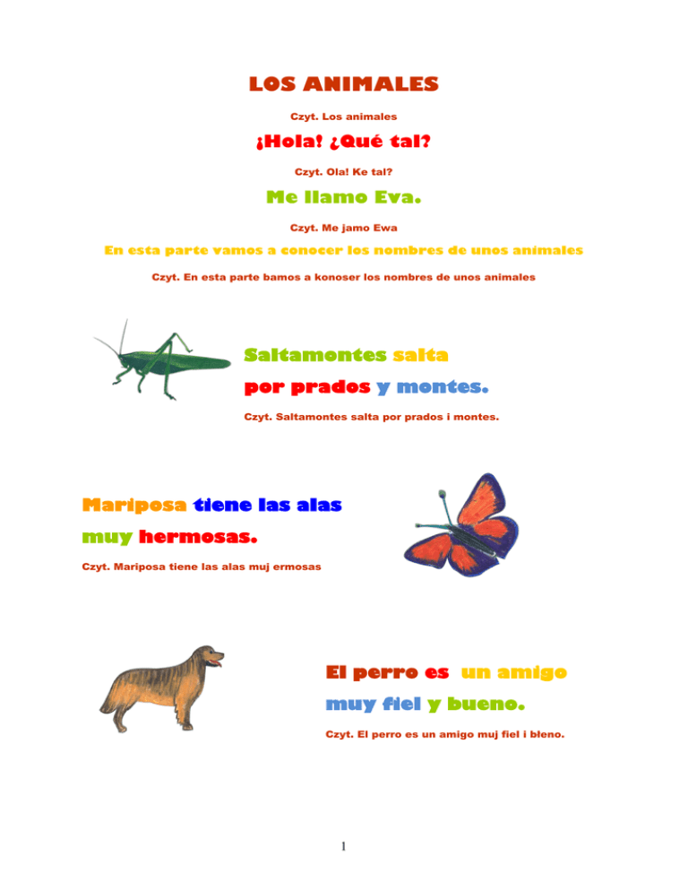 LOS ANIMALES Czyt. Los animales ¡Hola! ¿Qué tal? Czyt. Ola! Ke tal? Me llamo Eva. Czyt. Me jamo Ewa En esta parte vamos a conocer los nombres de unos animales Czyt. En esta parte bamos a konoser los nombres de unos animales Saltamontes salta por prados y montes. Czyt. Saltamontes salta por prados i montes. Mariposa tiene las alas muy hermosas. Czyt. Mariposa tiene las alas muj ermosas El perro es un amigo muy fiel y bueno. Czyt. El perro es un amigo muj fiel i błeno. 1 el gato el perro Czyt. El gato Czyt. El perro el hamster el pez Czyt. El amster Czyt. El pes el caballo la vaca Czyt. El kabajjo Czyt. La waka 2 Połącz liniami obrazki z ich nazwami el saltamontes la hormiga la mariquita la lagartija la serpiente el caracol la mariposa el pez 3 Rozwiąż krzyżówkę 1 2 3 2 4 3 G 1 S 6 P A L T A 5 T M O N T E L B R R L E T I I J U Z N A G O A T O A 4 5 6 4 S Znajdź w rozsypance nazwy zwierząt A F R U G O L O N D R I N A B G C X Q O C P E Z L K J H G H A V C U R C B V E G H Y U K A L B Q A R Z C A R A C O L V M L N E G I S J L U V Q K C T S I M D S Ó X O V E J A X I Y T N K S F N H Y S E T U L E N E A L L A G A R T I J A Q R V R E T S G H J I K L U Y R V S A J A B A L Ĺ X Q F S Q V O Z O 1. ………………………………………………. 2. ………………………………………………. 3. ………………………………………………. 4. ………………………………………………. 5. ………………………………………………. 6. ………………………………………………. 7. ………………………………………………. 8. ………………………………………………. 9. ………………………………………………. 10. ……………………………………… 5