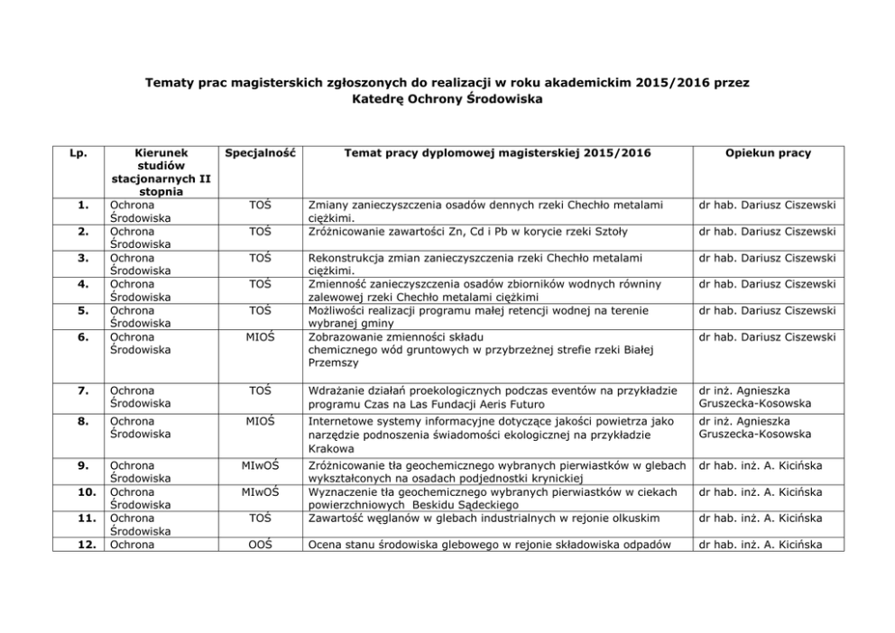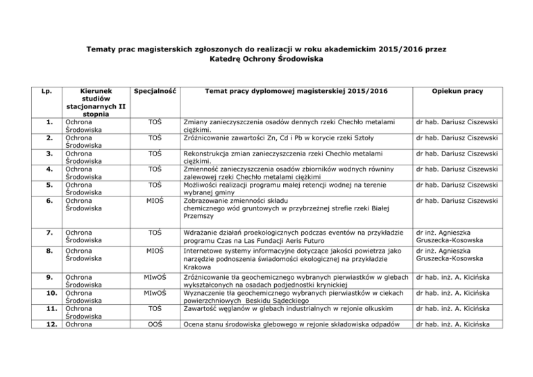 Tematy prac magisterskich zgłoszonych do realizacji w roku akademickim 2015/2016 przez Katedrę Ochrony Środowiska Lp. 1. 2. 3. 4. 5. 6. Kierunek studiów stacjonarnych II stopnia Ochrona Środowiska Ochrona Środowiska Ochrona Środowiska Ochrona Środowiska Ochrona Środowiska Ochrona Środowiska Specjalność TOŚ TOŚ TOŚ TOŚ TOŚ MIOŚ Temat pracy dyplomowej magisterskiej 2015/2016 Opiekun pracy Zmiany zanieczyszczenia osadów dennych rzeki Chechło metalami ciężkimi. Zróżnicowanie zawartości Zn, Cd i Pb w korycie rzeki Sztoły dr hab. Dariusz Ciszewski Rekonstrukcja zmian zanieczyszczenia rzeki Chechło metalami ciężkimi. Zmienność zanieczyszczenia osadów zbiorników wodnych równiny zalewowej rzeki Chechło metalami ciężkimi Możliwości realizacji programu małej retencji wodnej na terenie wybranej gminy Zobrazowanie zmienności składu chemicznego wód gruntowych w przybrzeżnej strefie rzeki Białej Przemszy dr hab. Dariusz Ciszewski dr hab. Dariusz Ciszewski dr hab. Dariusz Ciszewski dr hab. Dariusz Ciszewski dr hab. Dariusz Ciszewski 7. Ochrona Środowiska TOŚ Wdrażanie działań proekologicznych podczas eventów na przykładzie programu Czas na Las Fundacji Aeris Futuro dr inż. Agnieszka Gruszecka-Kosowska 8. Ochrona Środowiska MIOŚ Internetowe systemy informacyjne dotyczące jakości powietrza jako narzędzie podnoszenia świadomości ekologicznej na przykładzie Krakowa dr inż. Agnieszka Gruszecka-Kosowska 9. Ochrona Środowiska Ochrona Środowiska Ochrona Środowiska Ochrona MIwOŚ dr hab. inż. A. Kicińska TOŚ Zróżnicowanie tła geochemicznego wybranych pierwiastków w glebach wykształconych na osadach podjednostki krynickiej Wyznaczenie tła geochemicznego wybranych pierwiastków w ciekach powierzchniowych Beskidu Sądeckiego Zawartość węglanów w glebach industrialnych w rejonie olkuskim OOŚ Ocena stanu środowiska glebowego w rejonie składowiska odpadów dr hab. inż. A. Kicińska 10. 11. 12. MIwOŚ dr hab. inż. A. Kicińska dr hab. inż. A. Kicińska 13. 14. 15. 16. 17. 18. 19. 20. Środowiska Ochrona Środowiska Ochrona Środowiska Ochrona Środowiska Ochrona Środowiska Ochrona Środowiska Ochrona Środowiska Ochrona Środowiska Ochrona Środowiska OOŚ MIOŚ MIwOŚ TOŚ TOŚ TOŚ TOŚ innych niż obojętne i niebezpieczne w Giedlarowej, gm. Leżajsk Formy występowania wybranych metali w glebach w bliskim sąsiedztwie składowiska odpadów innych niż obojętne i niebezpieczne w Giedlarowej, gm. Leżajsk Porównanie stanu zasolenia wód powierzchniowych na terenie Polski. Stworzenie bazy danych dotyczących publikacji naukowych z dziedziny ochrony środowiska Zanieczyszczenie azotanami (V) oraz fosforanami wód rzeki Skawinkiw okolicach Kalwarii Zebrzydowskiej. Zawartość chlorków oraz siarczanów w opadach atmosferycznych w okolicy Zielonej Góry. Zawartość azotanów (V) w opadach atmosferycznych w okolicy Cementowni Lafarge w Małogoszczy. Zawartość fosforu ogólnego w opadach atmosferycznych w Jaśle. MIOŚ Ocena oddziaływania transportu na środowisko ( będzie uszczegółowiony) dr hab. inż. A. Kicińska dr inż. Magdalena Strzebońska dr hab. inż. Urszula Aleksander-Kwaterczak dr inż. Magdalena Strzebońska dr inż. Magdalena Strzebońska dr inż. Magdalena Strzebońska dr inż. Magdalena Strzebońska dr inż. Ewa Adamiec 21. Ochrona Środowiska TOŚ Izolacja chromo-opornych bakterii glebowych z próbki A3 (gmina Alwernia) i określenie ich przynależności gatunkowej. dr inż. Anna Kostka 22. Ochrona Środowiska TOŚ Izolacja chromo-opornych bakterii glebowych z próbki A4 (gmina Alwernia) i określenie ich przynależności gatunkowej. dr inż. Anna Kostka 23. Ochrona Środowiska TOŚ Izolacja chromo-opornych bakterii glebowych z próbki A6 (gmina Alwernia) i określenie ich przynależności gatunkowej . dr inż. Anna Kostka 24. Ochrona Środowiska TOŚ Izolacja chromo-opornych bakterii glebowych z próbki A7 (gmina Alwernia) i określenie ich przynależności gatunkowej. dr inż. Anna Kostka 25. Ochrona Środowiska TOŚ Izolacja chromo-opornych bakterii glebowych z próbki A9 (gmina Alwernia) i określenie ich przynależności gatunkowej. dr inż. Anna Kostka 26. Ochrona Środowiska TOŚ Ocena efektywności metod określenia form związania metali w osadach wodnych dr hab.inż. Urszula Aleksander-Kwaterczak 27. Ochrona Środowiska Ochrona Środowiska Ochrona Środowiska Ochrona Środowiska TOŚ 31. Ochrona Środowiska TOŚ Wpływ wybranych dodatków paliwowych na ekspresję i aktywność roślinnych dysmutaz ponadtlenkowych dr hab. Dariusz Latowski 32. Ochrona Środowiska TOŚ Optymalizacja warunków hodowlanych bakterii opornych na rtęć w aspekcie ich zastosowania w biotechnologii środowiska dr hab. Dariusz Latowski 33. Inżynieria Środowiska GO Analiza systemu gospodarki odpadami w gminie Szczawnica i jego wpływ na środowisko dr inż. Agnieszka Gruszecka-Kosowska 34. Inżynieria Środowiska GO Analiza systemu gospodarki odpadami w gminie Jabłonka i jego wpływ na środowisko dr inż. Agnieszka Gruszecka-Kosowska 35. Inżynieria Środowiska GO Ocena wywiązywania się wybranego przedsiębiorstwa z obowiązków środowiskowych w zakresie gospodarki odpadami dr inż. Agnieszka Gruszecka-Kosowska 36. Inżynieria Środowiska GO Badaniawłaściwości fizyko-chemicznych oraz możliwości zagospodarowania wybranych odpadów wytworzonych w Zakładach Azotowych w Puławach dr inż. Elżbieta JaroszKrzemińska 37. Inżynieria Środowiska GO Badania właściwości fizyko-chemicznych odpadów paleniskowych z Elektrociepłowni Łęg w aspekcie ich zagospodarowania dr inż. Elżbieta JaroszKrzemińska 38. Inżynieria Środowiska GO Badania wybranych właściwości popiołów lotnych oraz dennych ze spalania 100% biomasy w kotłach energetyki zawodowej w Polsce w aspekcie ich zagospodarowania. dr inż. Elżbieta JaroszKrzemińska 39. Inżynieria Środowiska GO Badanie wybranych właściwości żużli stalowniczych z Huty
