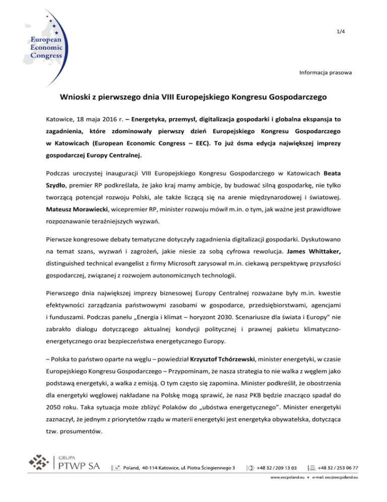 1/4 Informacja prasowa Wnioski z pierwszego dnia VIII Europejskiego Kongresu Gospodarczego Katowice, 18 maja 2016 r. – Energetyka, przemysł, digitalizacja gospodarki i globalna ekspansja to zagadnienia, które zdominowały pierwszy dzień Europejskiego Kongresu Gospodarczego w Katowicach (European Economic Congress – EEC). To już ósma edycja największej imprezy gospodarczej Europy Centralnej. Podczas uroczystej inauguracji VIII Europejskiego Kongresu Gospodarczego w Katowicach Beata Szydło, premier RP podkreślała, że jako kraj mamy ambicje, by budować silną gospodarkę, nie tylko tworzącą potencjał rozwoju Polski, ale także liczącą się na arenie międzynarodowej i światowej. Mateusz Morawiecki, wicepremier RP, minister rozwoju mówił m.in. o tym, jak ważne jest prawidłowe rozpoznawanie teraźniejszych wyzwań. Pierwsze kongresowe debaty tematyczne dotyczyły zagadnienia digitalizacji gospodarki. Dyskutowano na temat szans, wyzwań i zagrożeń, jakie niesie za sobą cyfrowa rewolucja. James Whittaker, distinguished technical evangelist z firmy Microsoft zarysował m.in. ciekawą perspektywę przyszłości gospodarczej, związanej z rozwojem autonomicznych technologii. Pierwszego dnia największej imprezy biznesowej Europy Centralnej rozważane były m.in. kwestie efektywności zarządzania państwowymi zasobami w gospodarce, przedsiębiorstwami, agencjami i funduszami. Podczas panelu „Energia i klimat – horyzont 2030. Scenariusze dla świata i Europy” nie zabrakło dialogu dotyczącego aktualnej kondycji politycznej i prawnej pakietu klimatycznoenergetycznego oraz bezpieczeństwa energetycznego Europy. – Polska to państwo oparte na węglu – powiedział Krzysztof Tchórzewski, minister energetyki, w czasie Europejskiego Kongresu Gospodarczego – Przypominam, że nasza strategia to nie walka z węglem jako podstawą energetyki, a walka z emisją. O tym często się zapomina. Minister podkreślił, że obostrzenia dla energetyki węglowej nakładane na Polskę mogą sprawić, że nasz PKB będzie znacząco spadał do 2050 roku. Taka sytuacja może zbliżyć Polaków do „ubóstwa energetycznego”. Minister energetyki zaznaczył, że jednym z priorytetów rządu w materii energetyki jest energetyka obywatelska, dotycząca tzw. prosumentów. 2/4 Informacja prasowa Aleksandras Spruogis, wiceminister energetyki Litwy argumentował, że konkurencyjność państw europejskich zostanie zachowana tylko wówczas, gdy w polityce europejskiej uwzględni się charakter gospodarek konkretnych krajów. Podkreślał, że Litwa nawet będąc zależną od paliw kopalnych, inwestuje w nowe rozwiązania energetyczne. Piotr Woźniak, prezes zarządu PGNiG, w swojej wypowiedzi dotyczącej energetyki w Europie podkreślał znaczenie unii energetycznej wypracowywanej na forum UE. W trakcie kolejnej z dyskusji pierwszego dnia VIII Europejskiego Kongresu Gospodarczego mówiono m.in. o globalnej ekspansji gospodarki europejskiej. Jednym z głównych tematów, które były poruszane w czasie tej prelekcji była współpraca na linii Europa-Chiny. Rozmówców zajęła szczególnie kwestia Porozumienia Transpacyficznego (TTIP), którego negocjacje są w bardzo zaawansowanym stadium. W panelu wypowiadali się: Jerzy Kwieciński, sekretarz stanu w ministerstwie rozwoju RP, Maciej Andrzej Libiszewski, prezes zarządu PKP CARGO, Tomáš Novotný, wiceminister przemysłu i handlu ds. funduszy unijnych, wspierania prac badawczo-rozwojowych, inwestycji i innowacji Republiki Czeskiej, Maciej Witucki, prezes Work Service i Karol Zarajczyk, prezes URSUS. Jerzy Kwieciński w swojej inicjującej dyskusję wypowiedzi zaznaczył, że Polsce zagraża dużo pułapek gospodarczych: – Potrzeba nowych, silnych bodźców, które przełożą się na motory polskiej gospodarki. Obywatele Polski są ambitni. Wynagrodzenia są niższe niż w UE, nasz rozwój wspiera kapitał zewnętrzny. Te elementy trzeba zmienić. Musimy budować własny kapitał – mówił. Zaznaczył też, że kolejnym wielkim wyzwaniem jest demografia. – Widzę ogromny potencjał Polski i Czech w inwestowaniu w podstawową infrastrukturę. To pozwoli rozwijać bardziej innowacyjne sektory gospodarki. Liczymy, że nowa perspektywa unijna pozwoli nam dobrze dofinansować nowe pomysły – relacjonował Tomáš Novotný, wiceminister przemysłu i handlu Czech. Polityk dał do zrozumienia, że przykładów do naśladowania można szukać nawet na drugiej półkuli. Wymienił w tym kontekście państwa Ameryki Łacińskiej. Na kolejnych, równolegle odbywających się sesjach Europejskiego Kongresu Gospodarczego w Katowicach, skupiano się m.in. nad zagadnieniem sytuacji młodych przedsiębiorców w gospodarce 3/4 Informacja prasowa i na rynku pracy, nad „wielkimi problemami wielkich miast”, globalną ekspansją gospodarki europejskiej, czy współpracą międzynarodową na rzecz zrównoważonego rozwoju. W trakcie sesji „Współpraca międzynarodowa na rzecz zrównoważonego rozwoju” wskazano, że Agenda na Rzecz Zrównoważonego Rozwoju 2030 i zawarte w niej cele mają się m.in. przyczynić do eliminacji ubóstwa. Obecny na sesji Ali Nur Ismail Ali, główny sekretarz, naczelnik państwowego departamentu ds. spółdzielczości w Ministerstwie Przemysłu, Inwestycji i Handlu Kenii zaznaczył, że kiedy mówimy o zrównoważonym rozwoju, to chodzi nam o to, w jaki sposób obecne pokolenie może zaspokajać swoje potrzeby bez pogarszania sytuacji przyszłych pokoleń. Janina Ochojska, prezes Polskiej Akcji Humanitarnej zwróciła w dyskusji uwagę na to, jak ważna jest współpraca z władzami lokalnymi. – Nasze działania ukierunkowane są na rozwój – mówiła podczas Europejskiego Kongresu Gospodarczego w Katowicach. Wskazała, że ważna jest współpraca z władzami lokalnymi, z wodzami wiosek po to, by stworzyć cały system, który potem będzie możliwie sprawnie funkcjonował. – W przypadku celów zrównoważ