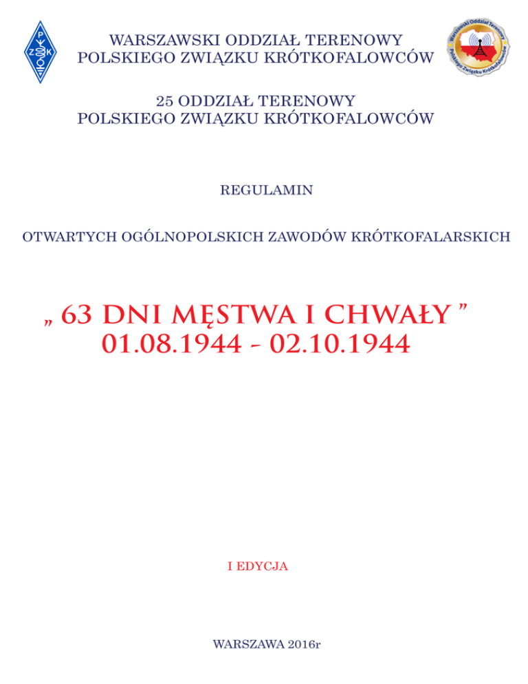 WARSZAWSKI ODDZIAŁ TERENOWY POLSKIEGO ZWIĄZKU KRÓTKOFALOWCÓW 25 ODDZIAŁ TERENOWY POLSKIEGO ZWIĄZKU KRÓTKOFALOWCÓW REGULAMIN OTWARTYCH OGÓLNOPOLSKICH ZAWODÓW KRÓTKOFALARSKICH „ 63 DNI MĘSTWA I CHWAŁY ” 01.08.1944 - 02.10.1944 I EDYCJA WARSZAWA 2016r REGULAMIN OTWARTYCH OGÓLNOPOLSKICH ZAWODÓW KRÓTKOFALARSKICH „63 DNI MĘSTWA I CHWAŁY” 01.08.1944 - 02.10.1944 1. ORGANIZATOR ZAWODÓW • Warszawski Oddział Terenowy Polskiego Związku Krótkofalowców 25 Oddział Terenowy Polskiego Związku Krótkofalowców 2. CEL ZAWODÓW Złożenie żołnierzom Armii Krajowej i innym organizacją bojowym i wszystkim osobą wspierających Powstanie Warszawskie a w szczególności dzieciom, młodzieży oraz cywilnej ludności Warszawy, w bohaterskim 63 dniowym zrywie powstańczym przeciwko niemieckiemu okupantowi. 3. UCZESTNICTWO W ZAWODACH Do udziału w zawodach zaprasza się polskich nadawców indywidualnych, radiostacje klubowe i nasłuchowców, a w szczególności tych, którzy uczestniczyli w Powstaniu, czynnie lub w inny sposób wspierali powstańców jak również stacje posiadające znaki okolicznościowe nawiązujące do uczestników Powstania lub miejsc związanych z Powstaniem Warszawskim. Udział stacji zagranicznych mile widziany. 4. TERMIN I CZAS ZAWODÓW 2 października każdego roku Tura KF CW/SSB od godziny 15:00 - 17:00 UTC (17:00 - 19:00 LT). Tura KF DIGITAL PSK63 od godziny 17:00 – 17:30:00 UTC (19:00 - 19:30 LT). Tura KF DIGITAL RTTY od godziny 17:30 – 18:00:00 UTC (19:30 - 20:00 LT). Termin stały zawodów. 5.PRZEBIEGZAWODÓW • w zawodach obowiązuje czas UTC (czas uniwersalny), • w zawodach obowiązują emisje CW oraz SSB obowiązuje numeracja ciągła, • w zawodach obowiązują emisje PSK63, RTTY obowiązuje numeracja ciągła, • pasmo 3,5 MHz w segmentach przeznaczonych do prowadzenia zawodów, • ograniczenie mocy do 100 W 6.WYWOŁANIE W ZAWODACH na CW – „ TEST ”, na SSB – „63 DNI”, na PSK63 „ TEST ”, na RTTY „ TEST ”, 7. WYMIANA RAPORTÓW Uczestnicy zawodów wymieniają grupy kontrolne składające się z RS lub RST kolejnego trzycyfrowego numeru QSO np.: emisja CW 599 001, emisja SSB 59 001, Uczestnicy Powstania Warszawskiego oraz stacje posiadające znaki okolicznościowe nawiązujące do Powstania lub miejsc związanych z Powstaniem Warszawskim wymieniają grupy kontrolne składające się z RS lub RST, kolejnego numeru QSO oraz skrótu „PW” np.: emisja CW 559 001PW, emisja SSB 59 001PW, Natomiast stacje pracujące z Warszawy podają grupy kontrolne składające się z RS lub RST oraz skrótu „WM” np.: emisja CW 559 001WM, emisja SSB 59 001WM. Uwaga! Stacja organizatora może pracować pod swoim znakiem czasowym SN1994W lub pod znakiem domowy oraz podaje grupę kontrolną składająca się z RS lub RST, i kolejnego numeru QSO oraz skrótu „PW” np.: emisja CW 559 001PW, emisja SSB 59 001PW, 8. ŁĄCZNOŚCI W ZAWODACH Z tą samą radiostacją można nawiązać po dwie łączności - jedną na CW i drugą na SSB oraz w segmencie DIGITAL jedna na PSK63 i drugą RTTY. Wszystkie radiostacje obowiązuje 5 minut QRT przed i po zawodach (od godziny 16:55 17:00 oraz od godziny 19:00 - 19:05 czasu lokalnego). 9.PUNKTACJA Za każde bezbłędne , potwierdzone QSO zalicza się: • ze stacjami podającymi w grupie kontrolnej „PW”: na CW - 30 pkt. , na SSB - 15 pkt. , • ze stacją organizatora SN1944W podającą w grupie kontrolnej „PW”: na CW - 20 pkt., na SSB - 10 pkt., • ze stacjami podającymi w grupie kontrolnej „WM”: na CW - 10 pkt., na SSB - 5 pkt., • z pozostałymi stacjami: na CW - 2 pkt., na SSB - 1 pkt., Dla części DIGITAL obowiązuje punktacja jak w części KF SSB • ze stacjami podającymi w grupie kontrolnej „PW”: na SSB - 15 pkt. , • ze stacją organizatora SN1944W podającą w grupie kontrolnej „PW”: na SSB - 10 pkt., • ze stacjami podającymi w grupie kontrolnej „WM”: na SSB - 5 pkt., • z pozostałymi stacjami: na SSB - 1 pkt., 10. WYNIKI KONCOWE To suma punktów za wszystkie QSO lub nasłuchy. Mnożnika nie stosuje się. 11. NASŁUCHOWCY (SWL) Obowiązuje odebranie znaków i grup kontrolnych od obu korespondentów. Jedna i ta sama stacja nasłuchiwana może być wykazana dwukrotnie - jeden raz na CW, a drugi raz na SSB. 12. ŁĄCZNOŚCI NIE ZALICZONE Łączności nie zalicza się w przypadku: • nawiązanie łączności przed i po czasie trwania zawodów (obowiązkowe "QRT"), • braku potwierdzenia w dzienniku korespondenta, • braku logu korespondenta jeśli jego znak występuje mniej niż w pięciu dziennikach, • rozbieżności czasu w dziennikach korespondenta więcej jak 5 minut, • powtórnej łączności z tą samą stacją (DUPE), • zniekształceniu znaku korespondenta (CALL), • zniekształcenie grupy kontrolnej (RPRT), 13. KLASYFIKACJA A - PW - stacje podające w grupie kontrolnej „PW”, B - SO CW/SSB - stacje indywidualne - CW + SSB, C - MO CW/SSB stacje klubowe - CW + SBB, D - MO/SO CW stacje indywidualne i klubowe tylko CW, E - MO/SO SSB stacje indywidualne i klubowe tylko SSB, F - WM stacje podające w grupie kontrolnej „WM”, G - SWL - stacje nasłuchowe, H - SO SSB (YL) stacje indywidualne SSB obsługiwane przez kobiety, I - SO SSB (Y) stacje indywidualne SSB obsługiwane przez operatorów do 18 lat, J - MO CW/SSB stacje klubowe – PSK63 + RTTY, K - SO CW/SSB stacje indywidualne – PSK + RTTY, 14. TROFEA • za zajęcie od I do III miejsca w poszczególnych grupach klasyfikacyjnych przyznane grawertony ozdobne, dyplomy laureatów drukowane przez Organizatora, • dla pozostałych uczestników e-Dyplomy rozesłane przez Organizatora), Uwaga! W przypadku braku sponsorów grawertony ozdobne zostaną przyznane tylko stacja zajmujące 1 miejsca w swoich grupach klasyfikacyjnych. 15. DZIENNIKI ZAWODÓW Dzienniki zawodów w postaci elektronicznej preferowany format *cbr, *log lub *fil należy przesłać w terminie 14 dni od czasu zakończenia 