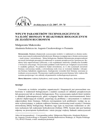 Architectura 6 (2) 2007, 59–70 WPàYW PARAMETRÓW TECHNOLOGICZNYCH NA ILOĝû BIOMASY W REAKTORZE BIOLOGICZNYM ZE ZàOĩEM RUCHOMYM Maágorzata Makowska Akademia Rolnicza im. Augusta Cieszkowskiego w Poznaniu Streszczenie. Badania obejmowaáy oczyszczanie Ğcieków w reaktorach ze záoĪem ruchomym, nazywanych reaktorami hybrydowymi. Biomasa wystĊpuje tam w formie zawieszonej – osad czynny, i utwierdzonej – báona biologiczna. Badania laboratoryjne przeprowadzono na trzech równolegle pracujących reaktorach w systemie przepáywowym i porcjowym. Reaktory byáy napowietrzane cyklicznie, a ich wypeánienie stanowiáy cylindryczne ksztaátki z tworzywa sztucznego. Oczyszczaniu poddano Ğcieki bytowe po wstĊpnym oczyszczeniu w osadniku gnilnym. Na podstawie badaĔ stwierdzono, Īe w obu systemach zawartoĞü biomasy zawieszonej malaáa, a utwierdzonej rosáa wraz ze wzrostem áadunku i obciąĪenia biomasy áadunkiem organicznym. Analogicznie wzrastaáa iloĞü biomasy usuwanej ze Ğciekami oczyszczonymi. Wyznaczone wspóáczynniki przyrostu biomasy byáy wiĊksze dla systemu porcjowego i nie zaleĪaáy od parametrów technologicznych procesu. Sáowa kluczowe: reaktory hybrydowe, osad czynny, báona biologiczna, záoĪe ruchome WSTĉP Usuwanie ze Ğcieków związków organicznych i biogennych jest powszechnie realizowane w reaktorach biologicznych z osadem czynnym (w ukáadzie przepáywowym lub porcjowym) lub ze záoĪem biologicznym. Przy oczyszczaniu maáych iloĞci Ğcieków w ukáadach jednostopniowych, gdzie wystĊpuje bardzo duĪa nierównomiernoĞü iloĞci i jakoĞci dopáywających Ğcieków, pojawiają siĊ problemy z utrzymaniem w reaktorze odpowiedniej iloĞci biomasy. Dobrym rozwiązaniem tych problemów wydaje siĊ system wykorzystujący w jednym reaktorze biomasĊ zawieszoną (osad czynny) i biomasĊ utwierdzoną (báonĊ biologiczną). Reaktory tego typu są nazywane reaktorami ze záoĪem ruchomym lub reaktorami hybrydowymi [Gebara 1999]. System taki jest bardziej odporny na przeciąĪenia hydrauliczne i moĪe przyjąü wiĊkszy áadunek zanieczyszczeĔ Adres do korespondencji – Corresponding author: Maágorzata Makowska, Akademia Rolnicza im. Augusta Cieszkowskiego w Poznaniu, Katedra Budownictwa Wodnego, ul. Wojska Polskiego 73A, 60-625 PoznaĔ, e-mail: [email protected] 60 M. Makowska niĪ system klasyczny, ze wzglĊdu na moĪliwoĞü zgromadzenia wiĊkszej iloĞci biomasy w dwóch postaciach. IloĞü i przyrost biomasy zaleĪą od warunków prowadzenia procesu [Abbassi i in. 2000, Fouad i Bhargava 2005], mają równieĪ wpáyw na skutecznoĞü usuwania zanieczyszczeĔ ze Ğcieków. Ciekawym rozwiązaniem jest reaktor hybrydowy ze zmiennym napowietrzaniem [Yoo i in. 1999], w którym moĪliwe jest jednoczesne usuwanie związków wĊgla oraz związków azotu poprzez symultaniczny proces nitryfikacji – denitryfikacji [Hanhan i in. 2005]. Zaletą takiego systemu jest moĪliwoĞü prowadzenia wszystkich procesów usuwania zanieczyszczeĔ w jednym reaktorze, dziĊki odpowiednim warunkom dla rozwoju róĪnorodnych kultur bakterii. Jest to szczególnie istotne w ukáadach oczyszczania o maáej przepustowoĞci, gdzie czĊĞü biomasy utwierdzonej na noĞniku umoĪliwia jej szybkie odtworzenie na wypadek przeciąĪenia hydraulicznego. METODYKA Badania na reaktorach biologicznych ze záoĪem ruchomym przeprowadzono w laboratorium technologicznym Katedry Budownictwa Wodnego Akademii Rolniczej w Poznaniu. Badania wykonano w dwóch etapach: w pierwszym etapie reaktory pracowaáy w systemie przepáywowym, w drugim etapie – w systemie porcjowym. W obu przypadkach równolegle pracowaáy trzy reaktory o pojemnoĞci 75 l kaĪdy (rys. 1), róĪniące siĊ miĊdzy sobą obciąĪeniem hydraulicznym i áadunkiem doprowadzanych zanieczyszczeĔ. ObjĊtoĞü czynna osadnika wtórnego (rys. 1a) i zbiornika poĞredniego (rys. 1b) wynosiáa 30 litrów. Charakterystyczną cechą badanych ukáadów byáo zmienne napowietrzanie, realizowane za pomocą grubopĊcherzykowych dyfuzorów, zasilanych dmuchawami sterowanymi wyáącznikiem czasowym. KaĪdy etap badaĔ skáadaá siĊ z kilku serii, róĪniących siĊ czasem napowietrzania i przerwami w dopáywie powietrza, w przypadku reaktorów przepáywowych, oraz dáugoĞcią cyklu pracy, w przypadku reaktorów porcjowych. Czas napowietrzania i przerwy w dopáywie powietrza w reaktorach cyklicznych byá staáy dla wszystkich serii badaĔ. Okres zmiennego napowietrzania byá równy okresowi napeániania reaktora; sedymentacja osadu trwaáa 30 min, dekantacja 15 min, niezaleĪnie od dáugoĞci cyklu pracy reaktora. ZáoĪe ruchome, umieszczone w kaĪdym z reaktorów, miaáo postaü cylindrycznych ksztaátek z karbowanego polietylenu o wymiarach 13/13 mm i porowatoĞci nasypowej 0,86. Liczba ksztaátek, obliczona zgodnie z wczeĞniej podaną metodyką [Makowska 2002], w obydwóch etapach badaĔ byáa jednakowa w kaĪdym z reaktorów i wynosiáa 2000 sztuk. Ukáad przepáywowy byá wyposaĪony w recyrkulacjĊ osadu w iloĞci 50% przepáywu dobowego. Osad nadmierny w ukáadzie przepáywowym usuwano 1 raz w tygodniu; w ukáadzie porcjowym w 1. serii badaĔ osad usuwano równieĪ raz w tygodniu, w serii 2. i 3., w których obciąĪenie reaktorów byáo duĪe, osad nadmierny usuwano sporadycznie lub nie usuwano. Do badaĔ uĪyto Ğcieków bytowych, wstĊpnie podczyszczonych w osadniku gnilnym. Temperatura badanych Ğcieków wahaáa siĊ od 16 do 23qC. Parametry technologiczne badanych ukáadów dla systemu przepáywowego i porcjowego przedstawiono w tabeli 1. W celu okreĞlenia niezbĊdnych parametrów pracy badanych systemów oraz ich wpáywu na iloĞü biomasy i skutecznoĞü usuwania zanieczyszczeĔ oznaczano: zawartoĞü związków wĊgla (jako BZT5 – metodą respirometryczną, i ChZTCr – metodą spektrofotometryczną) i związków azotu (azot ogólny Kjeldahla – metodą destylacji, azot amonoActa Sci. Pol. Wpáyw parametrów technologicznych 