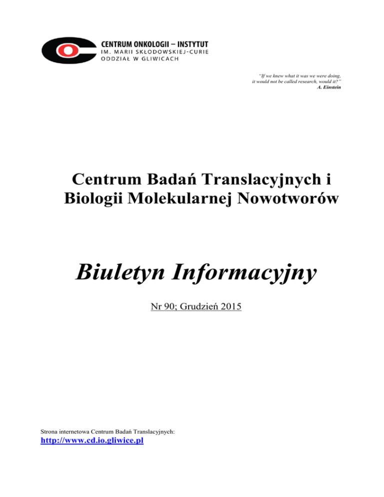 “If we knew what it was we were doing, it would not be called research, would it?” A. Einstein Centrum Badań Translacyjnych i Biologii Molekularnej Nowotworów Biuletyn Informacyjny Nr 90; Grudzień 2015 Strona internetowa Centrum Badań Translacyjnych: http://www.cd.io.gliwice.pl ******************************************************************************* Szanowni Państwo, Od bieżącego numeru Biuletyn przestaje mieć charakter oficjalnego organu Instytutu. W związku z tym wszystkich chętnych zapraszam do współredagowania. Redaktor ******************************************************************************* Seminaria Działu Badawczego (czwartki, godzina 9.15, Sala Wykładowa im. J. Święckiego) 03.12.2015 Wiesława Widłak (II/III KRA): Między genem a białkiem czyli biogeneza RNA. 10.12.2015 Patrycja Tudrej (CBT): Związek mutacji genów TMEM127 i MAX z rozwojem guzów chromochłonnych 17.12.2015 Anna Krawczyk (CBT): Narzędzia bioinformatyczne do anotacji microRNA wspomagające ocenę ich udziału ******************************************************************************* W dniu 18 grudnia 2015 r. odbędzie się uroczystość ślubowania i wręczenia dyplomów doktorskich, oraz wręczenie dyplomów doktora habilitowanego pracownikom Instytutu, którzy w roku 2015 uzyskali stopień doktora lub doktora habilitowanego (czyli tzw. Dzień Togi). Uroczystość ma charakter podwójny, i będzie połączona z uroczystością wręczenia Nagrody PTO im. Hilarego Koprowskiego. Laureatem tegorocznej Nagrody jest dr hab. Tomasz Rutkowski. Uroczystości odbędą się w Sali wykładowej im. J. Święckiego, początek o godzinie 12.00. Serdecznie zapraszamy! ******************************************************************************* W ostatnim konkursie grantowym Narodowego Centrum Nauki dofinansowanie uzyskały trzy projekty badawcze złożone przez pracowników Instytutu: Wpływ czynnika transkrypcyjnego HSF1 na transformację nowotworową indukowaną przez estrogen; kierownik dr hab. Wiesława Widłak (OPUS 9, NZ3) Identyfikacja biomarkerów indywidualnej skuteczności i toksyczności radiochemioterapii u chorych na raka regionu głowy i szyi za pomocą modelu kojarzącego profil kliniczny chorego i profilowanie metabolomiczne krwi technikami NMR i MS; kierownik prof. Krzysztof Składowski (OPUS 9, NZ5) Zmiany w profilu metabolicznym kardiomiocytów i mięśnia sercowego zachodzące pod wpływem niskich dawek promieniowania jonizującego; kierownik mgr inż. Michalina Gramatyka (PRELUDIUM 9, NZ7) ******************************************************************************* Ogłoszony został konkurs na stanowisko (m.in.) kierownika Centrum Badań Translacyjnych i Biologii Molekularnej Nowotworów. Termin składania zgłoszeń: 16 grudnia 2015. Od kandydata wymagane jest posiadanie tytułu naukowego profesora. Więcej szczegółów na stronie http://www.io.gliwice.pl/instytut/oferty-pracy ******************************************************************************* ******************************************************************************* Rada Naukowa Centrum Onkologii, na posiedzeniu w dniu 25.11.2015 r. nadała stopień naukowy doktora habilitowanego nauk medycznych (w dziedzinie biologia medyczna) Aleksandrze Rusin. Gratulacje! ******************************************************************************* W dniu 21.09.2015 odbyły się publiczne obrony rozpraw doktorskich: mgr Małgorzata Krześniak; tytuł rozprawy: Badania funkcjonalne polimorfizmów i mutacji wybranych genów związanych z naprawą DNA. promotor: dr hab. Marek Rusin; recenzenci: prof. Barbara Tudek, dr hab. Katarzyna Lisowska mgr Agnieszka Toma-Jonik; tytuł rozprawy: Rola czynnika transkrypcyjnego HSF1 w progresji nowotworu i chemooporności komórek czerniaka. promotor: dr hab. Wiesława Widłak, promotor pomocniczy: dr Natalia Vydra; recenzenci: prof. Hanna Rokita, dr hab. Mariusz Więckowski. W dniu 23.11.2015 odbyła się publiczna obrona rozprawy doktorskiej: mgr inż. Artur Zajkowicz; tytuł rozprawy: Właściwości szlaku sygnalizacyjnego białka p53 ujawnione podczas analizy skutków traktowania rezwratrolem promotor: dr hab. Marek Rusin; recenzenci: prof. Ewa Sikora, dr hab. Beata Schlichtholz *******************************************************************************