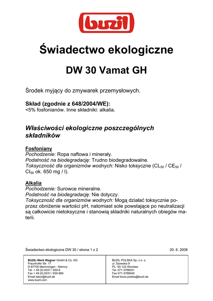 Świadectwo ekologiczne DW 30 Vamat GH Środek myjący do zmywarek przemysłowych. Skład (zgodnie z 648/2004/WE): <5% fosfonianów. Inne składniki: alkalia. Właściwości ekologiczne poszczególnych składników Fosfoniany Pochodzenie: Ropa naftowa i minerały. Podatność na biodegradację: Trudno biodegradowalne. Toksyczność dla organizmów wodnych: Nisko toksyczne (CL50 / CE50 / CI50 ok. 650 mg / l). Alkalia Pochodzenie: Surowce mineralne. Podatność na biodegradację: Nie dotyczy. Toksyczność dla organizmów wodnych: Mogą działać toksycznie poprzez obniżenie wartości pH, natomiast sole powstające po neutralizacji są całkowicie nietoksyczne i stanowią składniki naturalnych obiegów materii. Świadectwo ekologiczne DW 30 / strona 1 z 2 BUZIL-Werk Wagner GmbH & Co. KG Fraunhofer Str. 17 D-87700 Memmingen - Niemcy Tel. + 49 (0) 8331 / 930-6 Fax + 49 (0) 8331 / 930-880 Email [email protected] www.buzil.com 20. 6. 2008 BUZIL POLSKA Sp. z o. o. ul. Szewska 8 PL- 50-122 Wrocław Tel. 071-3766031 Fax 071-3766045 Email [email protected] Zachowanie się produktu w oczyszczalniach ścieków oraz w środowisku Niekorzystne wpływy na środowisko mogą wynikać z wysokiej wartości pH produktu, który po neutralizacji ścieków już nie jest istotna. Trudno biodegradowalne fosfoniany wytrącają się podczas obróbki ścieków i dostają do szlamu, nie powodując tym samym obciążenia naturalnych wód. Świadectwo ekologiczne DW 30 / strona 2 z 2 BUZIL-Werk Wagner GmbH & Co. KG Fraunhofer Str. 17 D-87700 Memmingen - Niemcy Tel. + 49 (0) 8331 / 930-6 Fax + 49 (0) 8331 / 930-880 Email [email protected] www.buzil.com 20. 6. 2008 BUZIL POLSKA Sp. z o. o. ul. Szewska 8 PL- 50-122 Wrocław Tel. 071-3766031 Fax 071-3766045 Email [email protected]