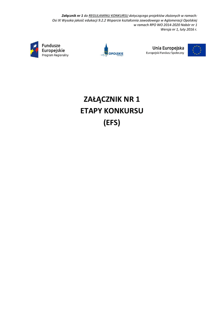 Załącznik nr 1 do REGULAMINU KONKURSU dotyczącego projektów złożonych w ramach: Osi IX Wysoka jakość edukacji 9.2.2 Wsparcie kształcenia zawodowego w Aglomeracji Opolskiej w ramach RPO WO 2014-2020 Nabór nr 1 Wersja nr 1, luty 2016 r. ZAŁĄCZNIK NR 1 ETAPY KONKURSU (EFS) Załącznik nr 1 do REGULAMINU KONKURSU dotyczącego projektów złożonych w ramach: Osi IX Wysoka jakość edukacji 9.2.2 Wsparcie kształcenia zawodowego w Aglomeracji Opolskiej w ramach RPO WO 2014-2020 Nabór nr 1 Wersja nr 1, luty 2016 r. Spis treści 1. Etap I – nabór wniosków o dofinansowanie (składanie wniosków o dofinasowanie oraz weryfikacja wymogów formalnych) .................................................................................................... 3 1.1 Złożenie wniosku o dofinansowanie projektu – formy i zasady składania wniosków ........ 3 1.2 Weryfikacja wymogów formalnych ..................................................................................... 4 2. Etap II - ocena formalna (obligatoryjna)...................................................................................... 5 3. Etap III – ocena merytoryczna (obligatoryjna) ............................................................................ 6 4. Etap IV– rozstrzygnięcie konkursu............................................................................................... 8 Strona 2 z 8 Załącznik nr 1 do REGULAMINU KONKURSU dotyczącego projektów złożonych w ramach: Osi IX Wysoka jakość edukacji 9.2.2 Wsparcie kształcenia zawodowego w Aglomeracji Opolskiej w ramach RPO WO 2014-2020 Nabór nr 1 Wersja nr 1, luty 2016 r. 1. Etap I – nabór wniosków o dofinansowanie (składanie wniosków o dofinasowanie oraz weryfikacja wymogów formalnych) 1.1 Złożenie wniosku o dofinansowanie projektu – formy i zasady składania wniosków Nabór wniosków o dofinansowanie projektów w ramach procedury konkursowej poprzedza ogłoszenie o konkursie, które zamieszczane jest na portalu Funduszy Europejskich, na stronie internetowej IZ RPO WO 2014-2020 oraz na stronie internetowej IP ZIT, zgodnie z ramowym harmonogramem naboru wniosków w ramach poszczególnych działań/poddziałań RPO WO 20142020, w których przewidziano realizację projektów w formule ZIT. Konkurs przebiega w czterech etapach: Etap I – nabór wniosków o dofinansowanie (1. składanie wniosków o dofinasowanie oraz 2. weryfikacja wymogów formalnych). Etap II – ocena formalna (obligatoryjna); Etap III – ocena merytoryczna (obligatoryjna); Etap IV – rozstrzygnięcie konkursu. Warunkiem uczestnictwa w konkursie jest przesłanie wniosku o dofinansowanie w formie dokumentu elektronicznego za pomocą aplikacji Panel Wnioskodawcy SYZYF RPO WO 2014-2020 oraz w formie papierowej w terminie zgodnym z ogłoszeniem oraz pkt. 6 Regulaminu konkursu. Składanie wniosków o dofinansowanie projektów w ramach poddziałania 9.2.2 Wsparcie kształcenia zawodowego w Aglomeracji Opolskiej odbywać się będzie w siedzibie Stowarzyszenia Aglomeracja Opolska w terminie od dnia 29.03.2016 r. do dnia 08.04.2016 r. Wykonany przez wnioskodawcę w generatorze wniosek o dofinansowanie projektu musi zostać wysłany on-line (zgodnie z instrukcją znajdującą się w załączniku nr 2 do Regulaminu konkursu) do IP ZIT. Ponadto wnioskodawca jest zobowiązany do dostarczenia do IP ZIT wniosku w wersji papierowej w dwóch egzemplarzach (w dwóch oryginałach lub oryginale i kopii) w formacie A4. Wersja papierowa wniosku musi być wykonana z przesłanego uprzednio on-line wniosku. Wniosek w formie papierowej wraz z załącznikami oraz pismem przewodnim może być dostarczony na cztery sposoby: a) listem poleconym w zaklejonej kopercie lub paczce, b) przesyłką kurierską, c) osobiście, d) przez posłańca (dostarczyciel otrzyma dowód wpłynięcia przesyłki opatrzony podpisem i datą). Platforma ePUAP jest wyłączona jako sposób dostarczania korespondencji dotyczącej wniosków o dofinansowanie projektów. Wnioski dostarczane osobiście do Działu Oceny i Wyboru Projektów rejestrowane są w systemie oraz nadawane są im numery kancelaryjne. Natomiast wnioski dostarczone listem Strona 3 z 8 Załącznik nr 1 do REGULAMINU KONKURSU dotyczącego projektów złożonych w ramach: Osi IX Wysoka jakość edukacji 9.2.2 Wsparcie kształcenia zawodowego w Aglomeracji Opolskiej w ramach RPO WO 2014-2020 Nabór nr 1 Wersja nr 1, luty 2016 r. poleconym/ przesyłką kurierską rejestrowane są w Dziale Obsługi Finansowo- Administracyjnej, a następnie rejestrowane są w systemie w Dziale Oceny i Wyboru Projektów. Papierowa wersja wniosku o dofinansowanie projektu jest weryfikowana w systemie SYZYF RPO WO 2014-2020 pod kątem spełnienia wymogów formalnych rejestracyjnych: a) Wniosek złożony w terminie; b) Wniosek złożony w ramach właściwego działania/poddziałania; c) Wersja elektroniczna wniosku zgodna z wersją papierową wniosku; d) Wniosek złożony we właściwej instytucji. W przypadku spełnienia przez wniosek powyższych wymogów zostaje on przyjęty i przekazany do weryfikacji wymogów formalnych. Wnioskodawca otrzymuje potwierdzenie przyjęcia wniosku. Tym samym rejestracja wniosku w systemie SYZYF RPO WO 2014-2020 zostaje zakończona. Wnioski złożone w odmiennej, niż opisane w niniejszym Regulaminie konkursu formie będą zwracane Wnioskodawcy do poprawy. Dostarczenie do IP ZIT wniosku o dofinansowanie zostanie potwierdzone przez przyjmującego na piśmie przewodnim wnioskodawcy. Wnioski dostarczone po terminie nie będą przyjmowane. Przyjęte wnioski o dofinansowanie są weryfikowane pod kątem spełnienia wymogów formalnych (katalog możliwych do uzupełnienia braków formalnych oraz oczywistych omyłek zawiera pkt. 22 Regulaminu konkursu). UWAGA! W zakresie doręczeń i sposobu obliczania terminów stosuje się przepisy ustawy z dnia 14 czerwca 1960 r. – Kodeks postępowania administracyjnego. 1.2 Weryfikacja wymogów formalnych Ka
