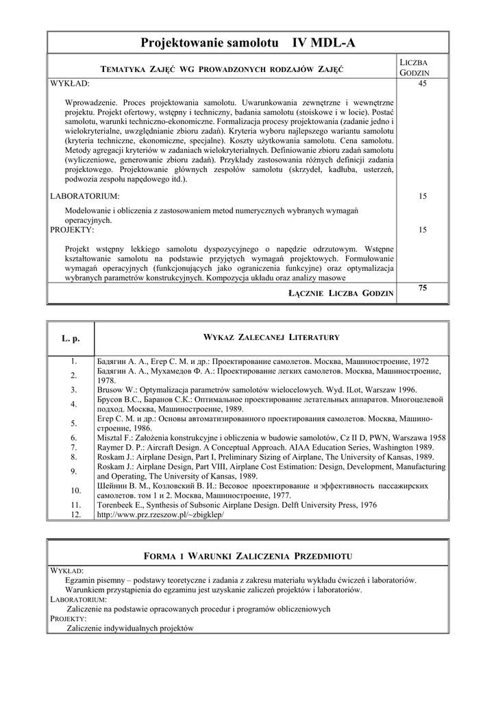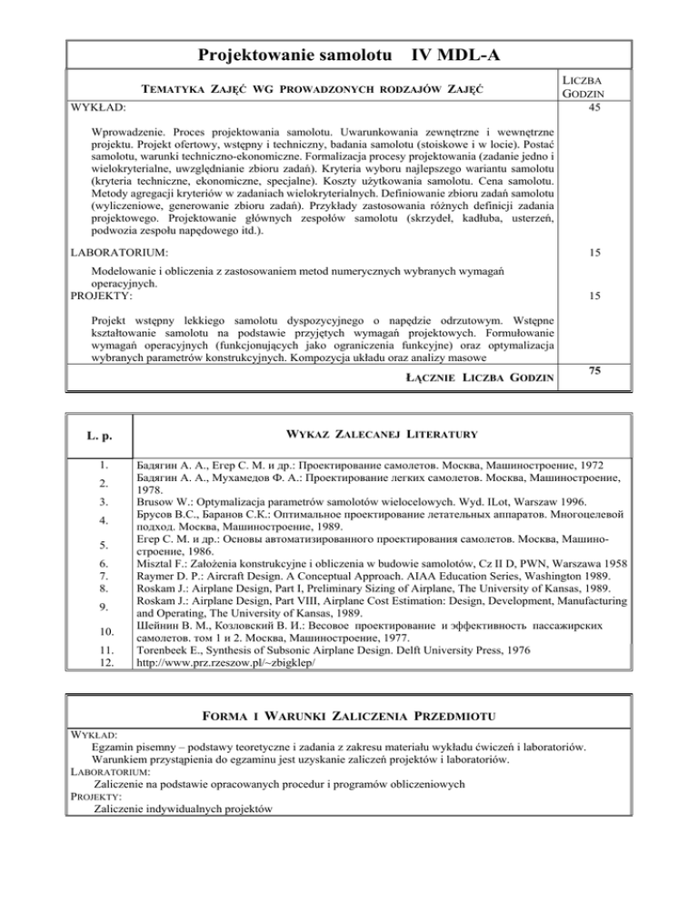 Projektowanie samolotu IV MDL-A TEMATYKA ZAJĘĆ WG PROWADZONYCH RODZAJÓW ZAJĘĆ LICZBA GODZIN WYKŁAD: 45 Wprowadzenie. Proces projektowania samolotu. Uwarunkowania zewnętrzne i wewnętrzne projektu. Projekt ofertowy, wstępny i techniczny, badania samolotu (stoiskowe i w locie). Postać samolotu, warunki techniczno-ekonomiczne. Formalizacja procesy projektowania (zadanie jedno i wielokryterialne, uwzględnianie zbioru zadań). Kryteria wyboru najlepszego wariantu samolotu (kryteria techniczne, ekonomiczne, specjalne). Koszty użytkowania samolotu. Cena samolotu. Metody agregacji kryteriów w zadaniach wielokryterialnych. Definiowanie zbioru zadań samolotu (wyliczeniowe, generowanie zbioru zadań). Przykłady zastosowania różnych definicji zadania projektowego. Projektowanie głównych zespołów samolotu (skrzydeł, kadłuba, usterzeń, podwozia zespołu napędowego itd.). LABORATORIUM: 15 Modelowanie i obliczenia z zastosowaniem metod numerycznych wybranych wymagań operacyjnych. PROJEKTY: 15 Projekt wstępny lekkiego samolotu dyspozycyjnego o napędzie odrzutowym. Wstępne kształtowanie samolotu na podstawie przyjętych wymagań projektowych. Formułowanie wymagań operacyjnych (funkcjonujących jako ograniczenia funkcyjne) oraz optymalizacja wybranych parametrów konstrukcyjnych. Kompozycja układu oraz analizy masowe ŁĄCZNIE LICZBA GODZIN L. p. 1. 2. 3. 4. 5. 6. 7. 8. 9. 10. 11. 12. 75 WYKAZ ZALECANEJ LITERATURY Бадягин А. А., Егер С. М. и др.: Проектирование самолетов. Москва, Машиностроение, 1972 Бадягин А. А., Мухамедов Ф. А.: Проектирование легких самолетов. Москва, Машиностроение, 1978. Brusow W.: Optymalizacja parametrów samolotów wielocelowych. Wyd. ILot, Warszaw 1996. Брусов В.С., Баранов С.К.: Оптимальное проектирование летательных аппаратов. Многоцелевой подход. Москва, Машиностроение, 1989. Егер С. М. и др.: Основы автоматизированного проектирования самолетов. Москва, Машиностроение, 1986. Misztal F.: Założenia konstrukcyjne i obliczenia w budowie samolotów, Cz II D, PWN, Warszawa 1958 Raymer D. P.: Aircraft Design. A Conceptual Approach. AIAA Education Series, Washington 1989. Roskam J.: Airplane Design, Part I, Preliminary Sizing of Airplane, The University of Kansas, 1989. Roskam J.: Airplane Design, Part VIII, Airplane Cost Estimation: Design, Development, Manufacturing and Operating, The University of Kansas, 1989. Шейнин В. М., Козловский В. И.: Весовое проектирование и эффективность пассажирских самолетов. том 1 и 2. Москва, Машиностроение, 1977. Torenbeek E., Synthesis of Subsonic Airplane Design. Delft University Press, 1976 http://www.prz.rzeszow.pl/~zbigklep/ FORMA I WARUNKI ZALICZENIA PRZEDMIOTU WYKŁAD: Egzamin pisemny – podstawy teoretyczne i zadania z zakresu materiału wykładu ćwiczeń i laboratoriów. Warunkiem przystąpienia do egzaminu jest uzyskanie zaliczeń projektów i laboratoriów. LABORATORIUM: Zaliczenie na podstawie opracowanych procedur i programów obliczeniowych PROJEKTY: Zaliczenie indywidualnych projektów